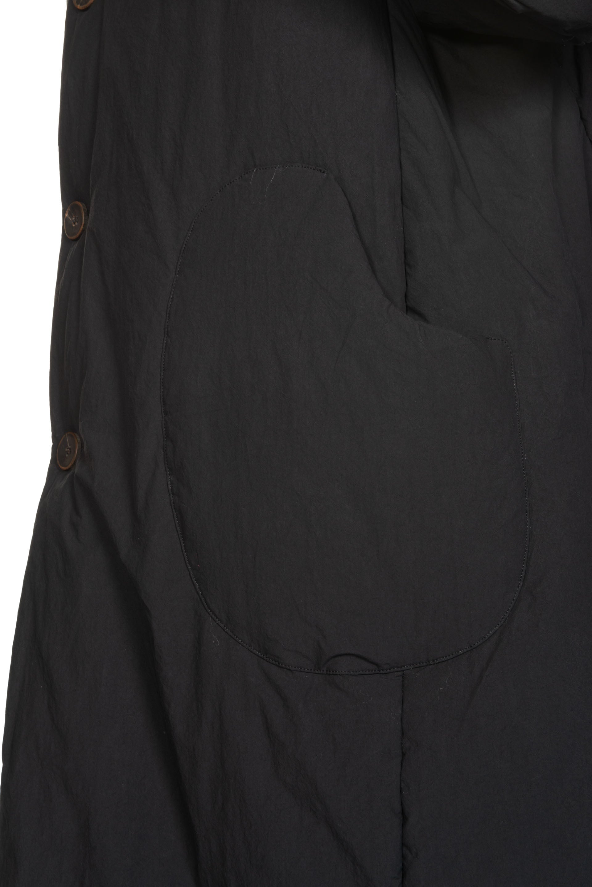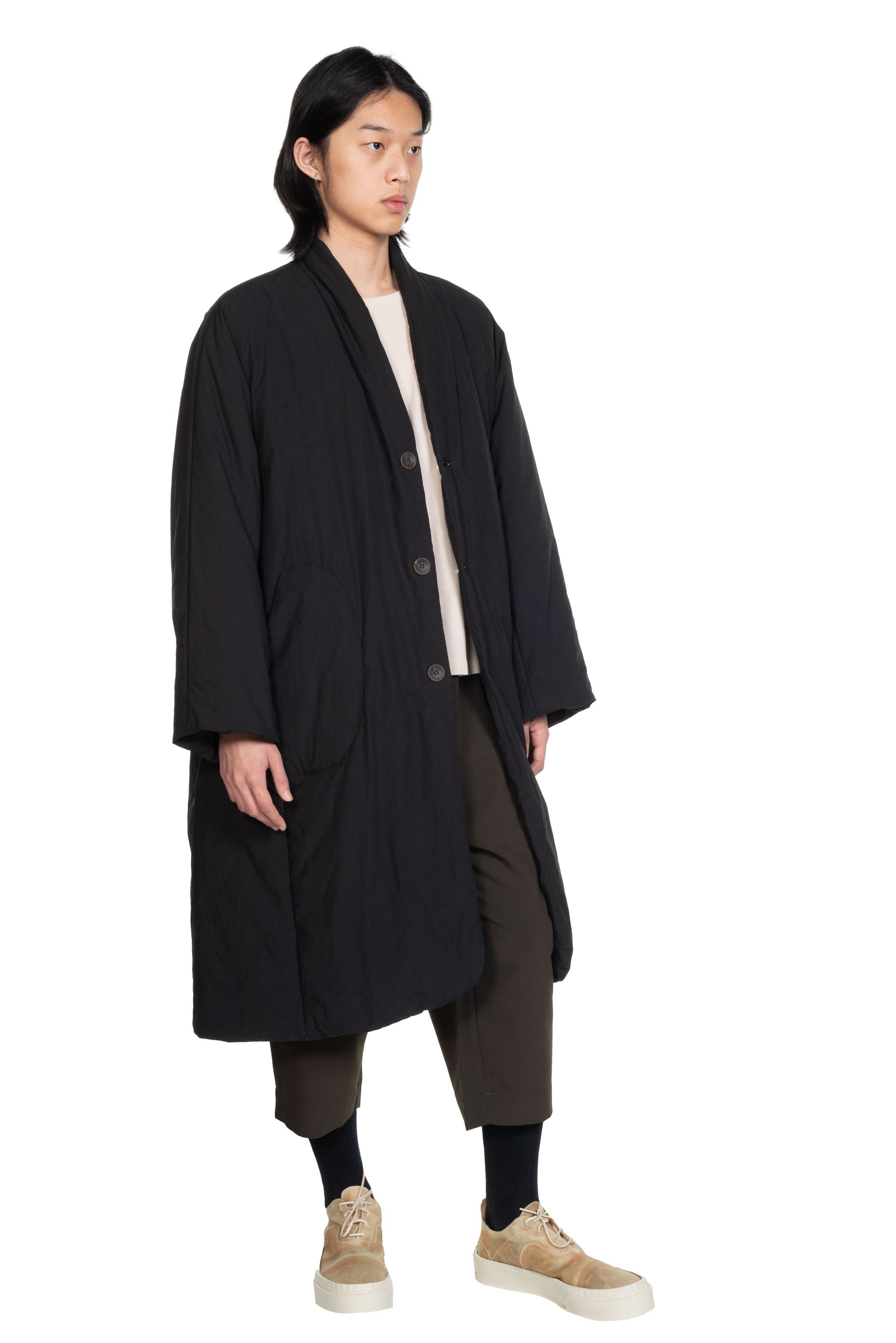 Kar Studio is an independent interior design studio, furniture and clothing brand exploring the cause and effect of aesthetics, integrating tradition and modernity. Kar is presenting modern design with Oriental philosophy. Inspired by art, literature, memories and emotions Kar focuses on design sensibility aiming to convey emotion that will resonate with people as seen with the Black Padded Cotton Long Coat.