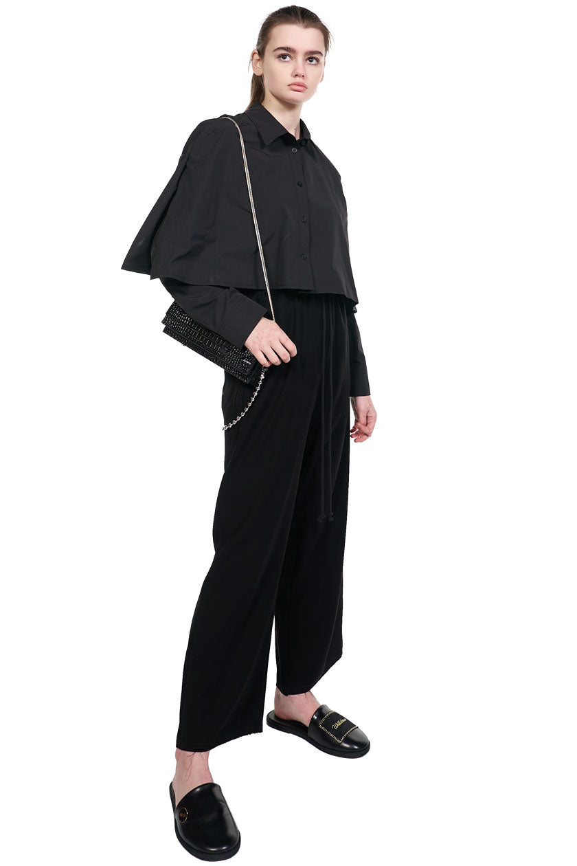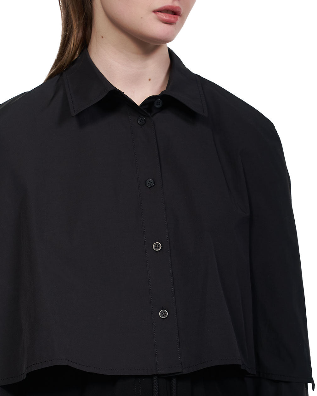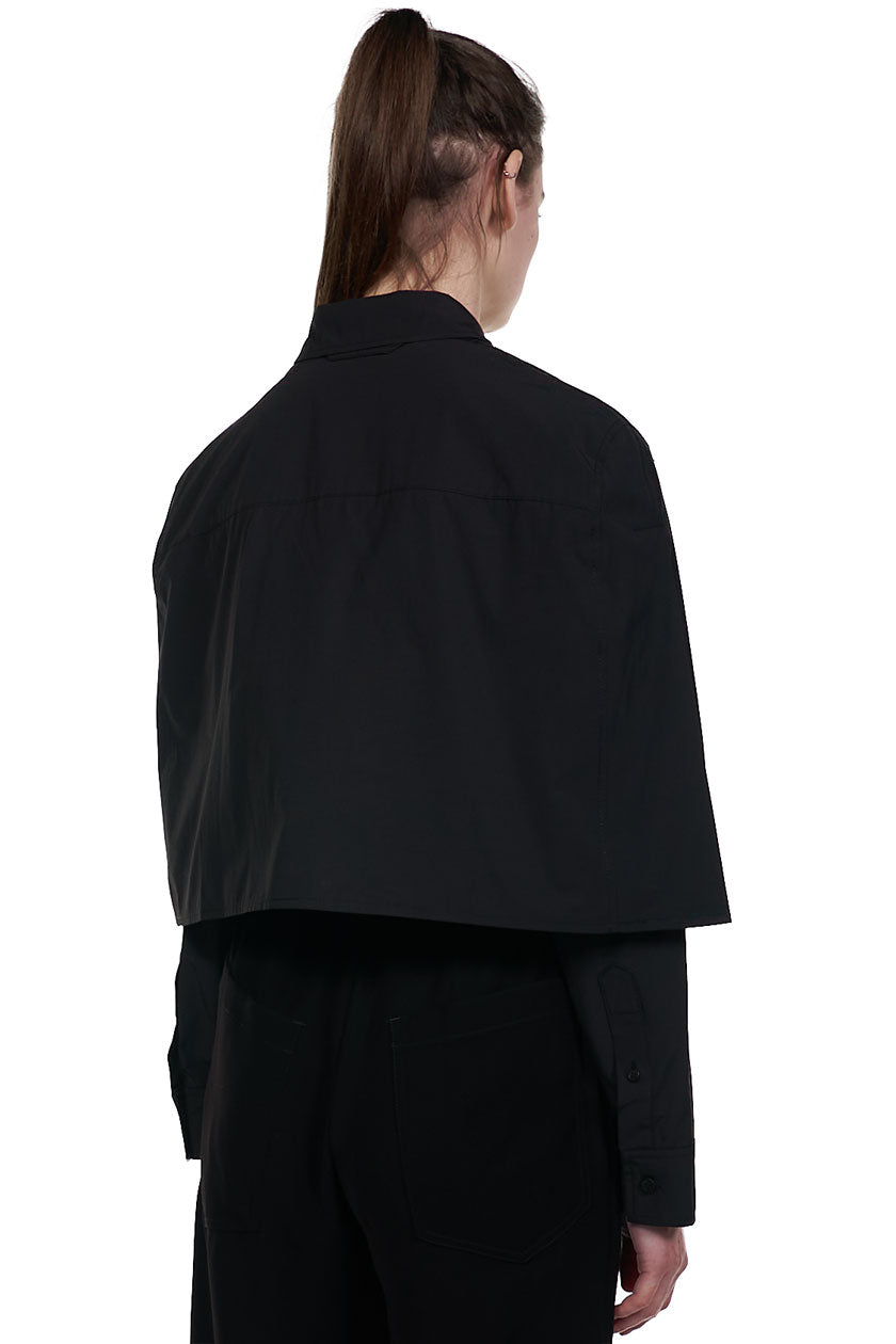 We11done merges late 1990s and early 2000s aesthetics creating a feeling of futurity. Functional, sportive, and sleek, We11done’s versatile designs refine classic elements into contemporary lifestyle pieces as seen with the Black Scallop Shirt. Cape sitting on shoulders. Button closure at front. Long sleeves with button closure at cuffs. Spread collar.