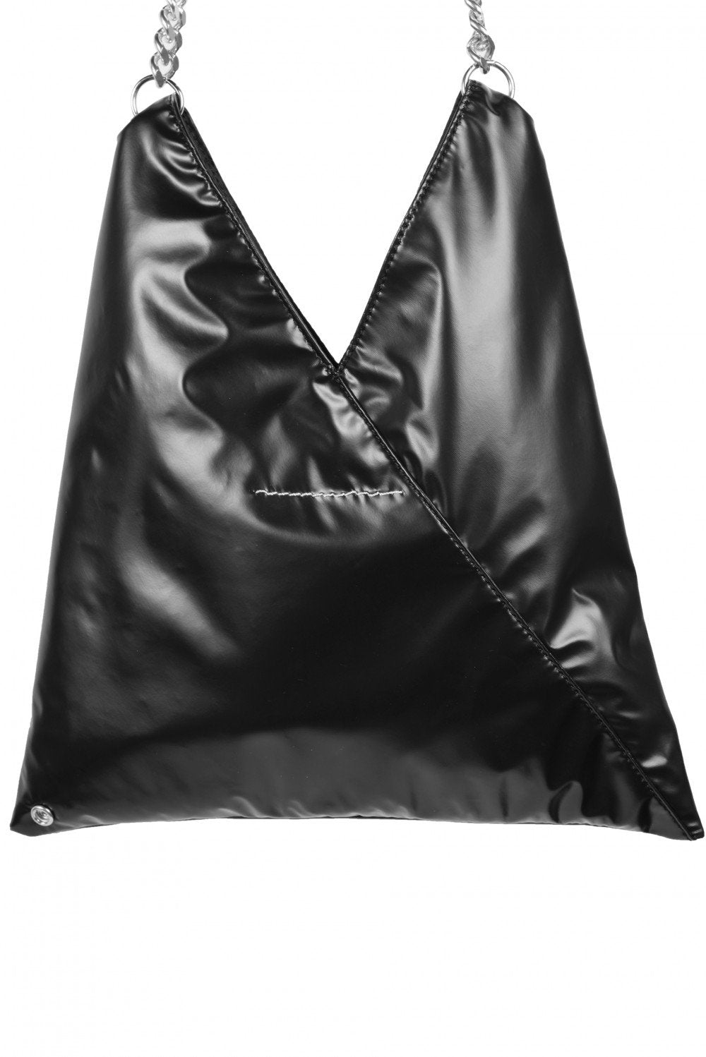 MM6 is known for its sporty ready-to-wear and off-beat accessories, more casual, street-inspired take on the Maison's intellectual approach to luxury as seen in the MM6 Black Shiny Japanese Shoulder Bag.