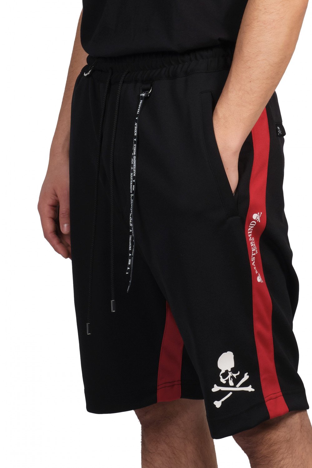 Mid-rise with four-pocket styling. Drawstring and D-ring hardware at elasticised waistband. Mastermind text print on side red stripe in white. Skull and crossbones print on front of each leg. Logo-engraved silver-tone hardware