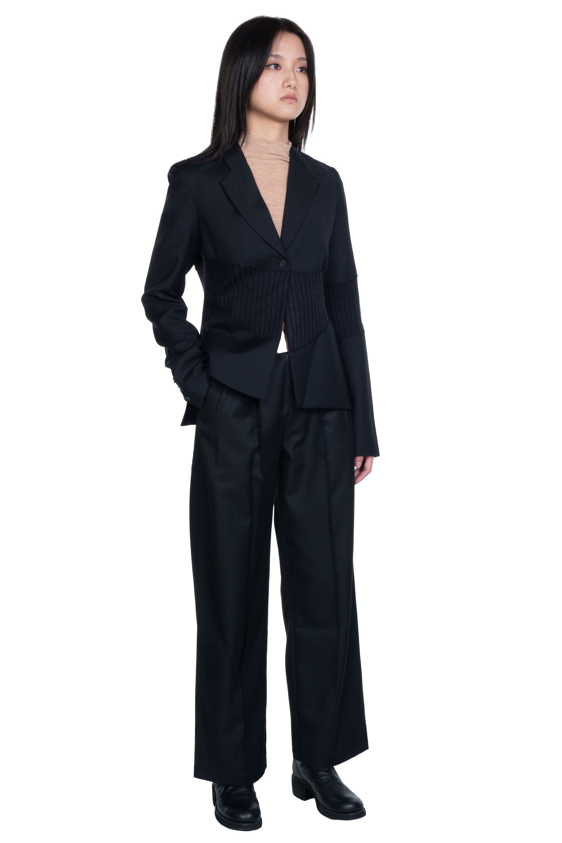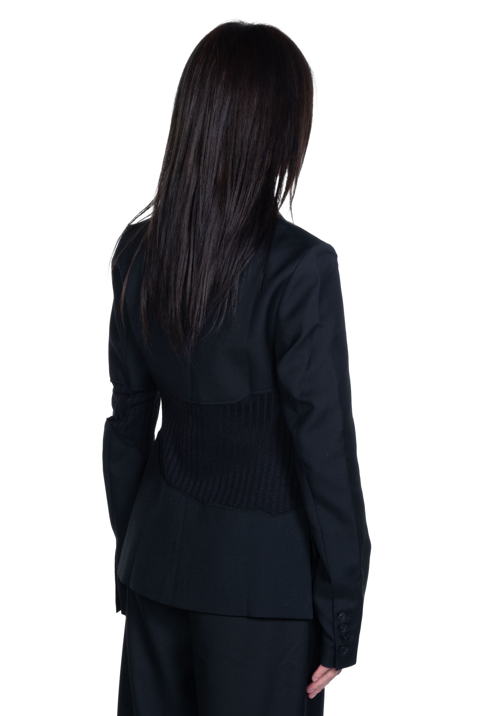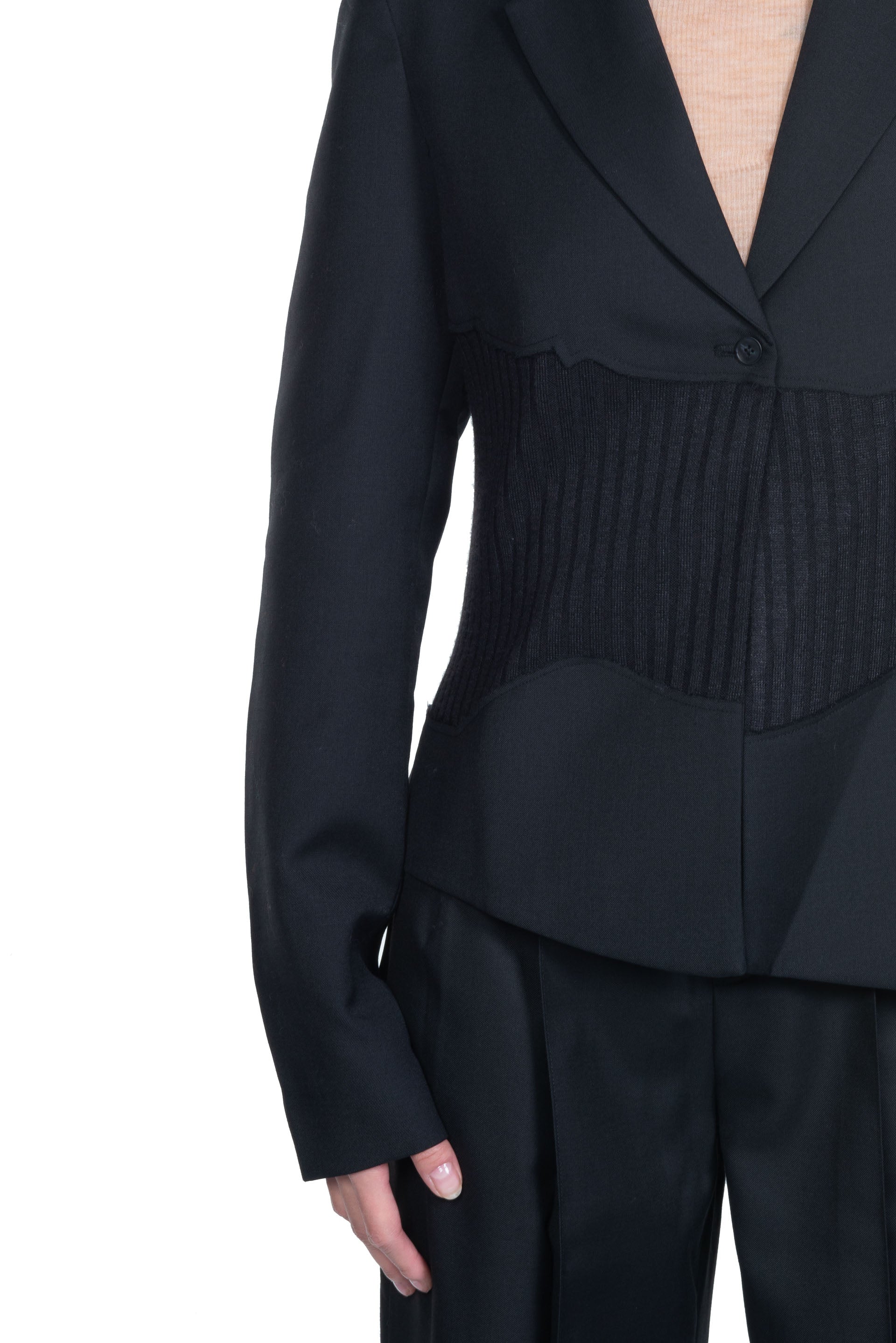 ii delivers a sense of originality, simplicity, spontaneity and a hint of childlike innocence pushing boundaries among ages to present qualitative collections with timeless touches designed for independent individuals as seen with the Black Smart Cut Suit Jacket. Long sleeves. Button closure at front. Mixed fabric patchwork.