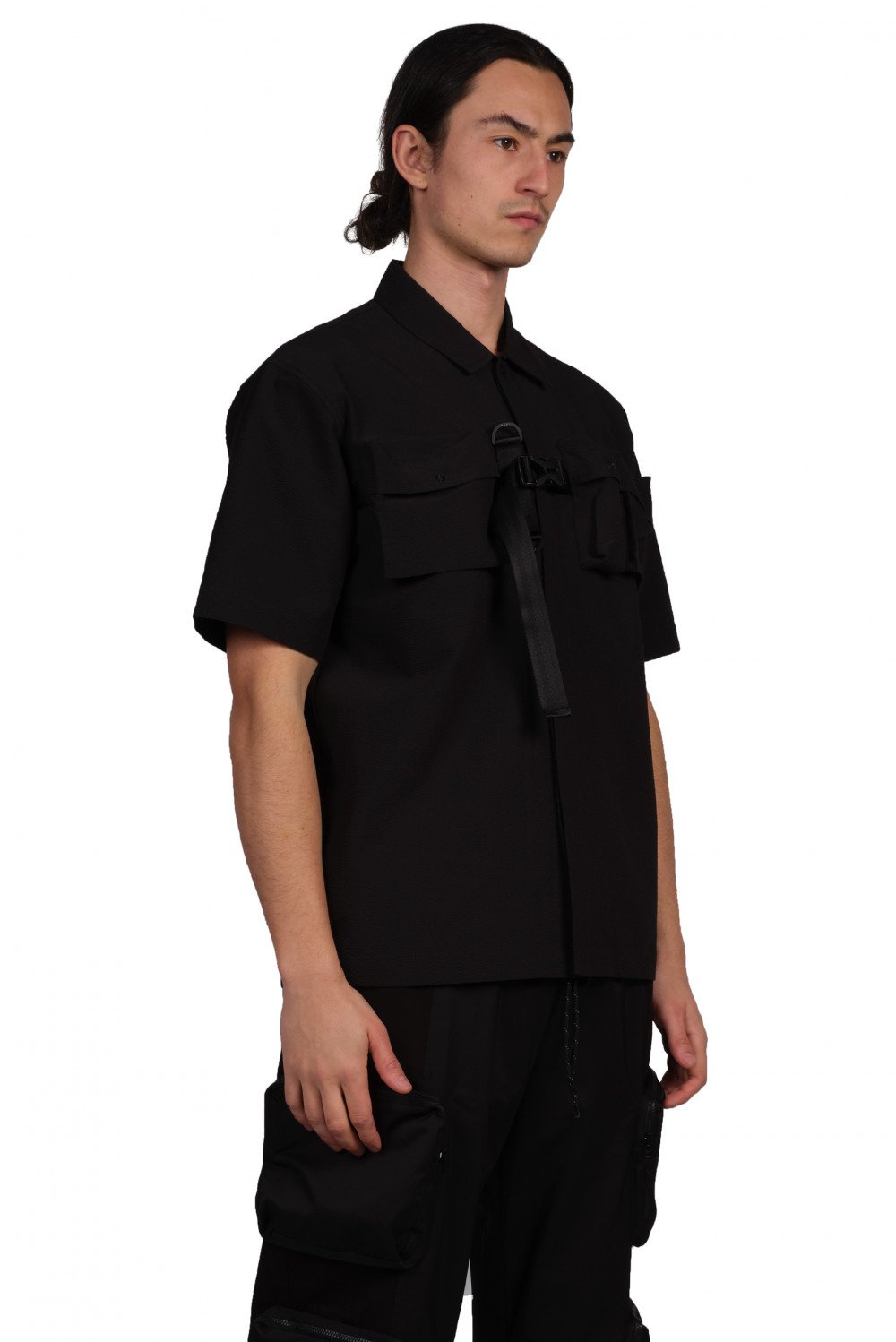 Classic shirt collar. Short sleeves. Concealed front button closure. Front buckle detail. Two breast pockets