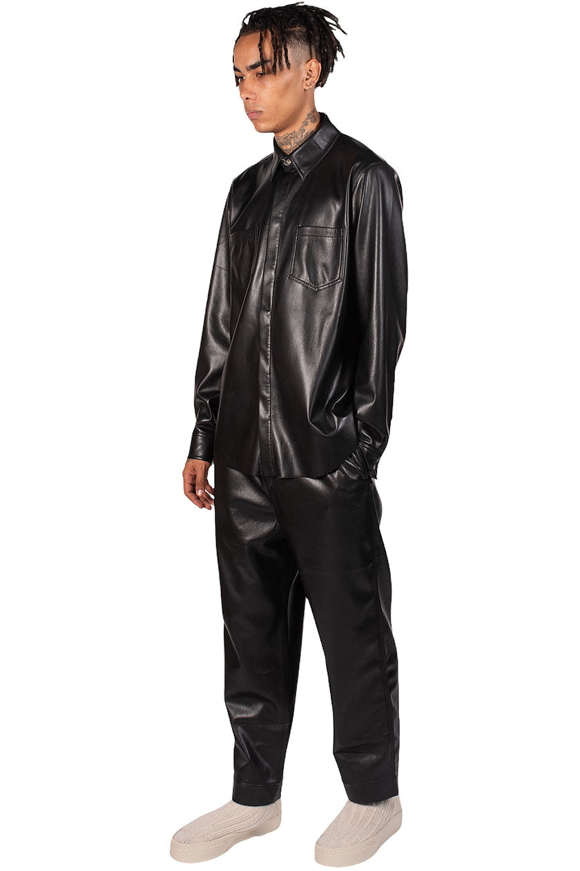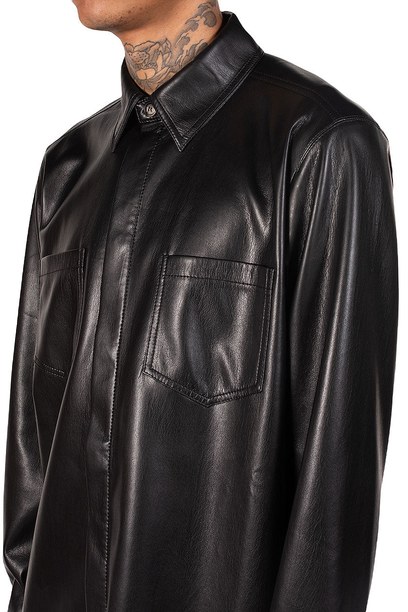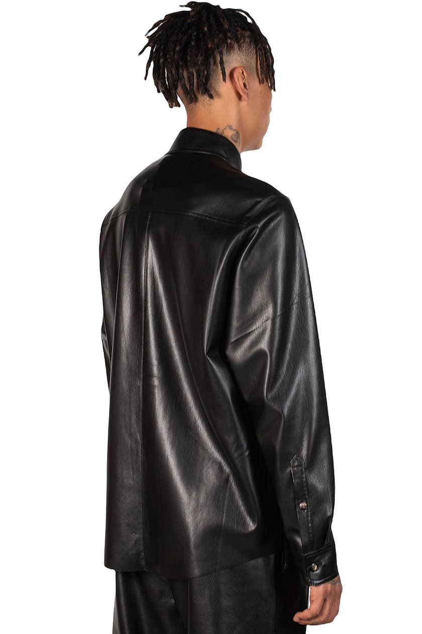 Black Vegan Leather Declan Shirt Long sleeve grained faux-leather shirt in black. Spread collar. Concealed button closure at front. Patch pockets at chest. Single-button barrel cuffs. Brown hardware.