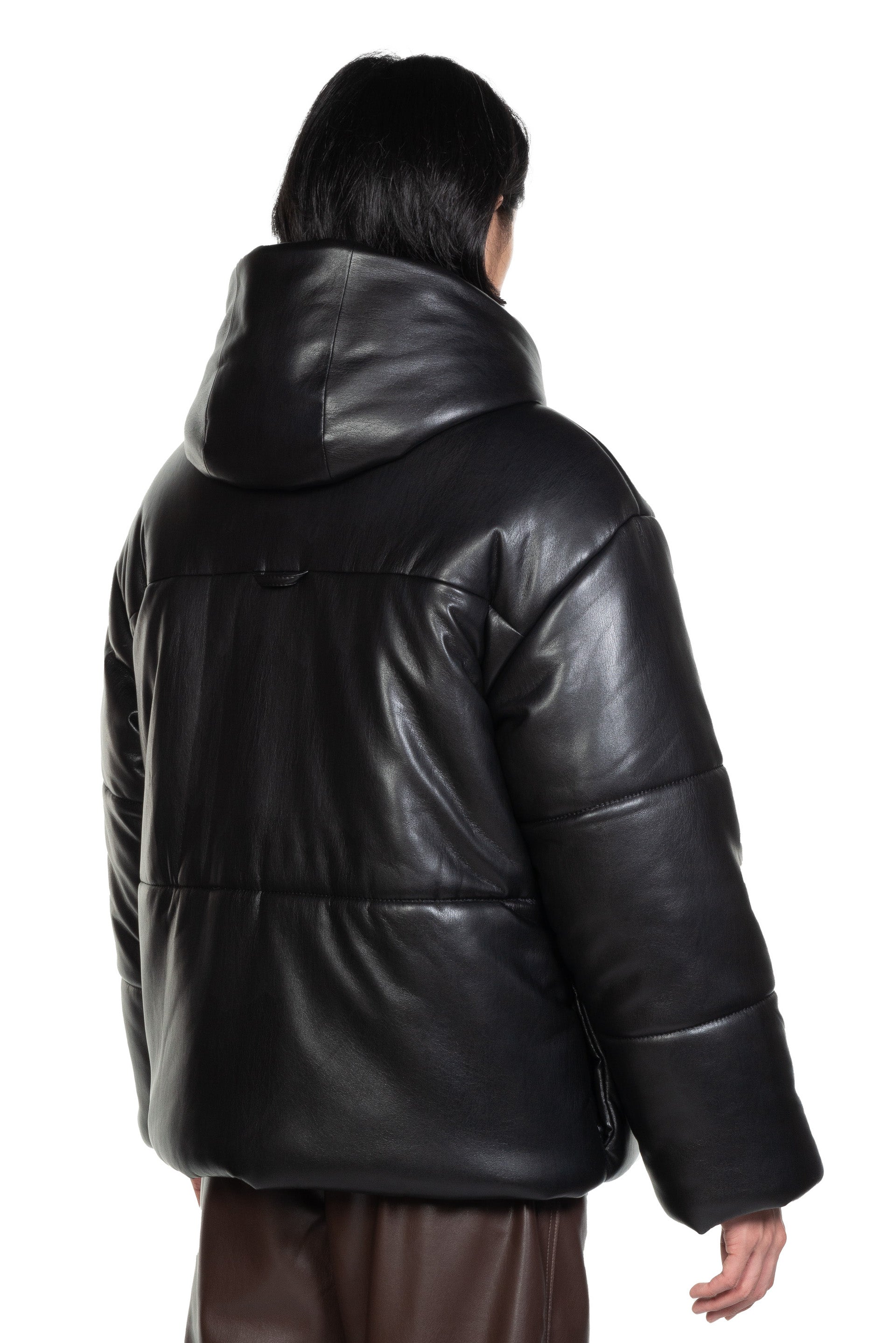 Black Vegan Leather Puffer Jacket. Long sleeve insulated faux-leather jacket in blue. Attachable hood with press-stud fastening. Fully lined.