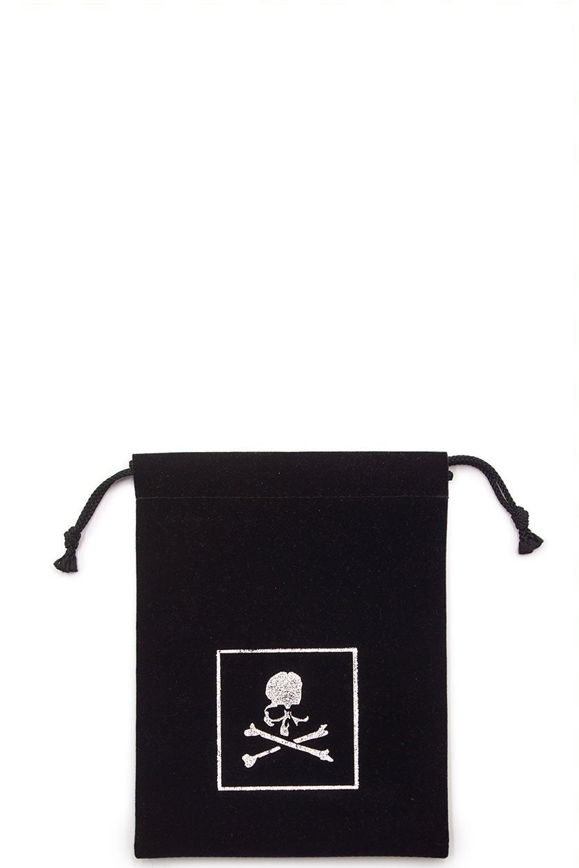 Sleek and shiny feel. Crafted in Japan from translucent black PVC. Bold stamp in white with letter branding. Label’s signature skull and crossbones logo. 3D Logo repeated on the brass buckle. Embossed & Printed Branding