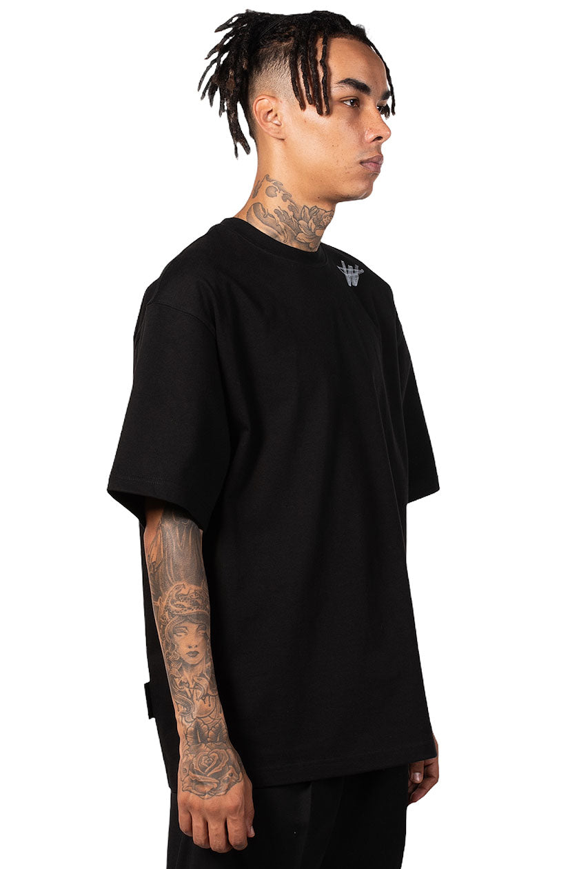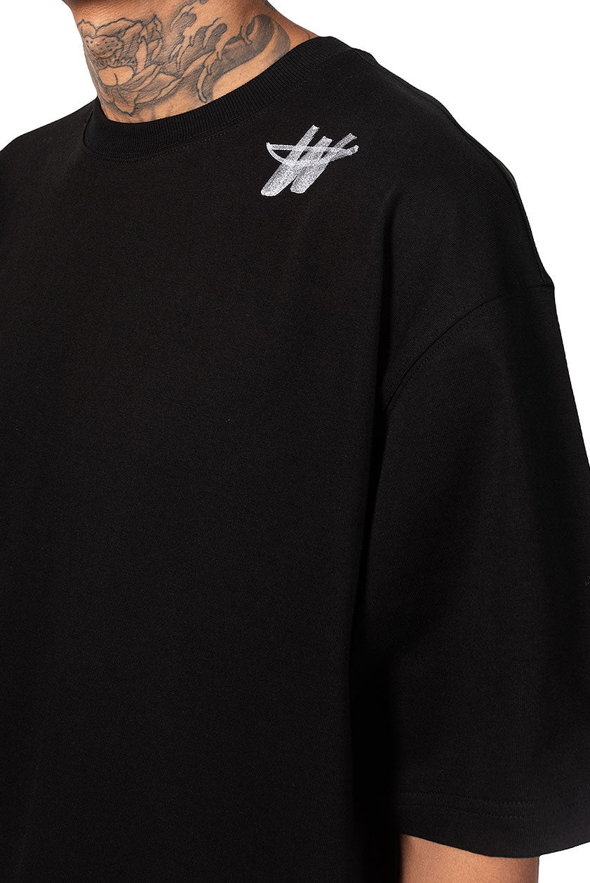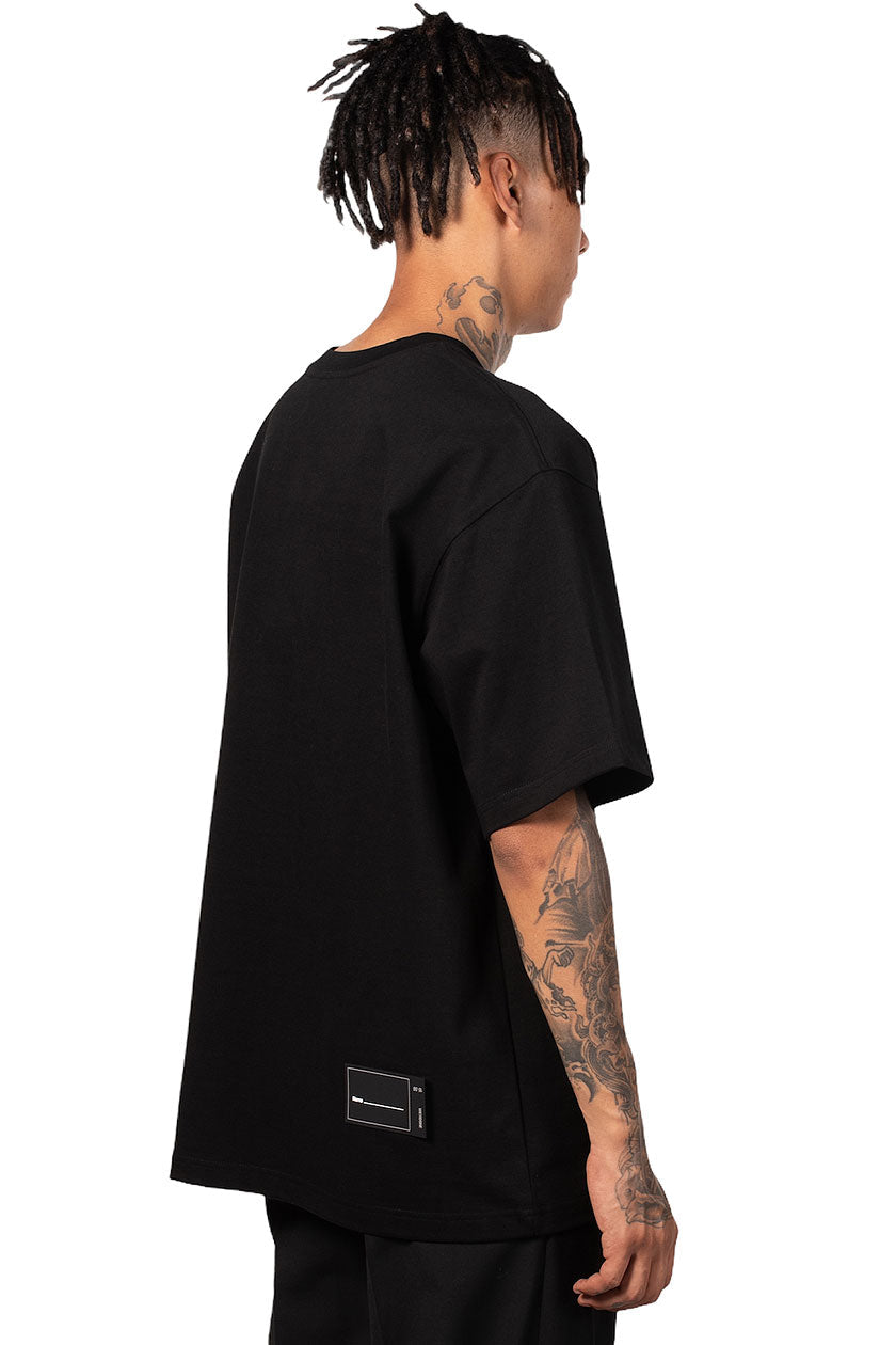 Short sleeve cotton jersey T-shirt in black. Rib knit crewneck collar. Logo printed in black at front. Rubberised logo patch in black at back hem.