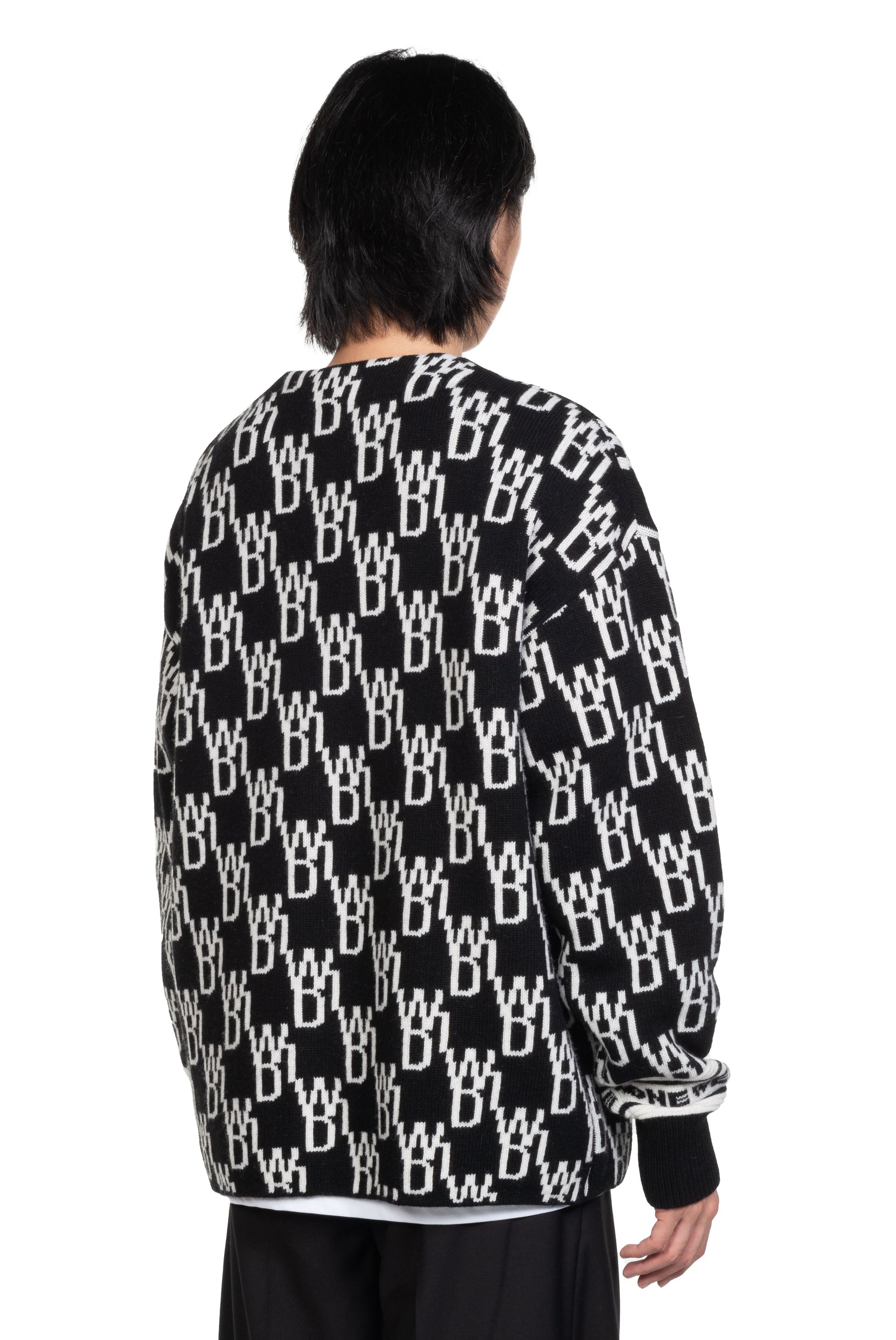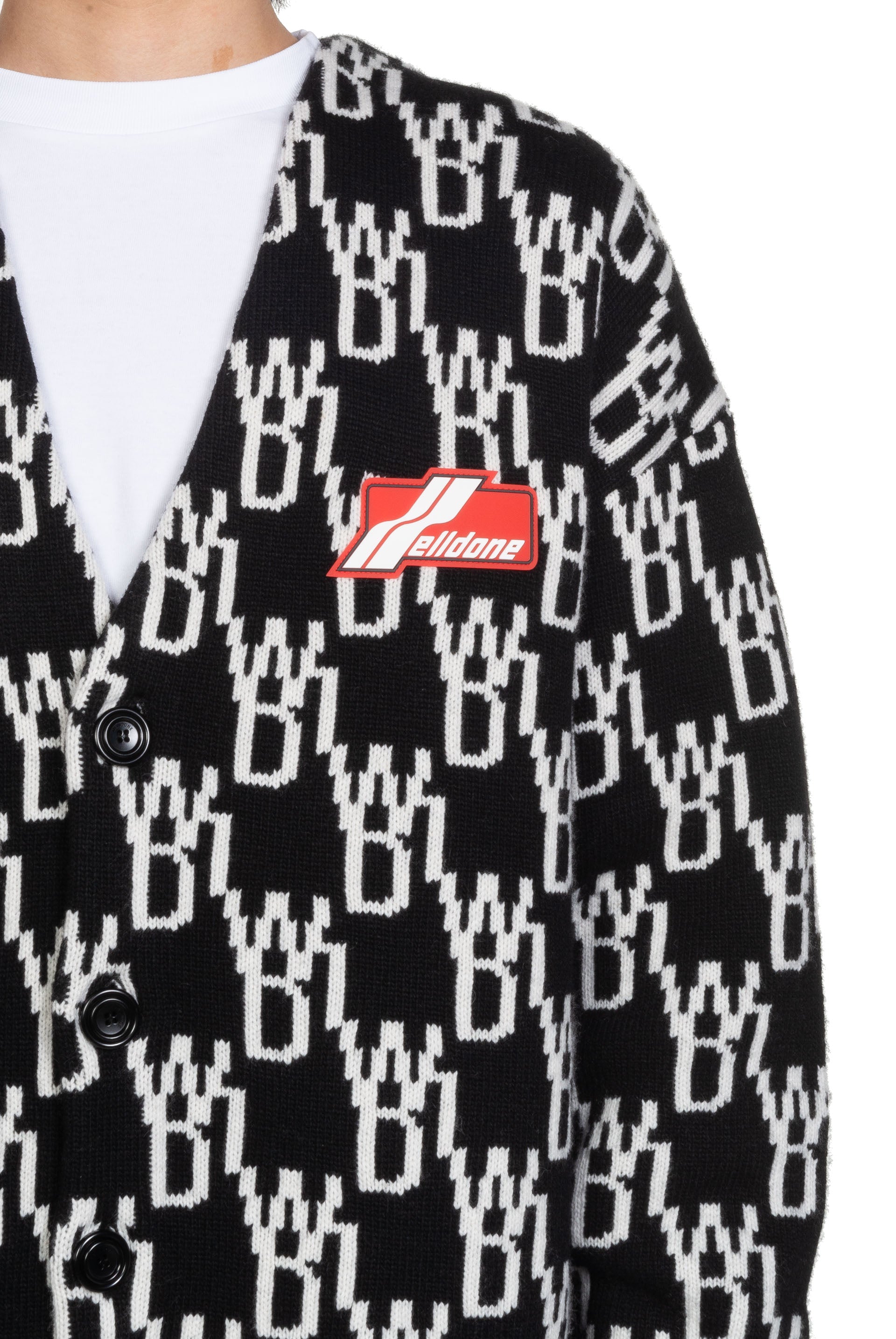 Knit wool, nylon, and cashmere-blend cardigan. Jacquard logo graphic pattern. Y-neck. Button closure, Rubberised logo patch at back hem.
