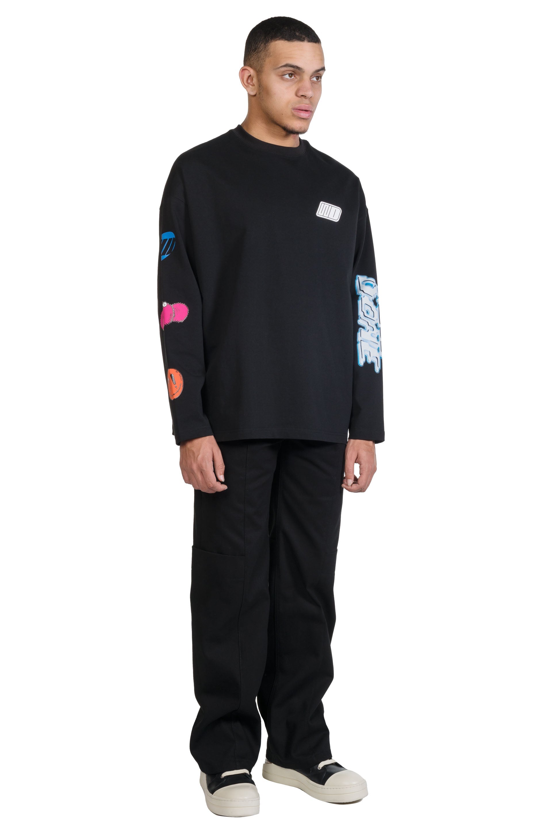 We11done merges late 1990s and early 2000s aesthetics creating a feeling of futurity. Functional, sportive, and sleek, We11done’s versatile designs refine classic elements into contemporary lifestyle pieces. as seen with the Black We11done Character Logo Long Sleeve T-Shirt.
