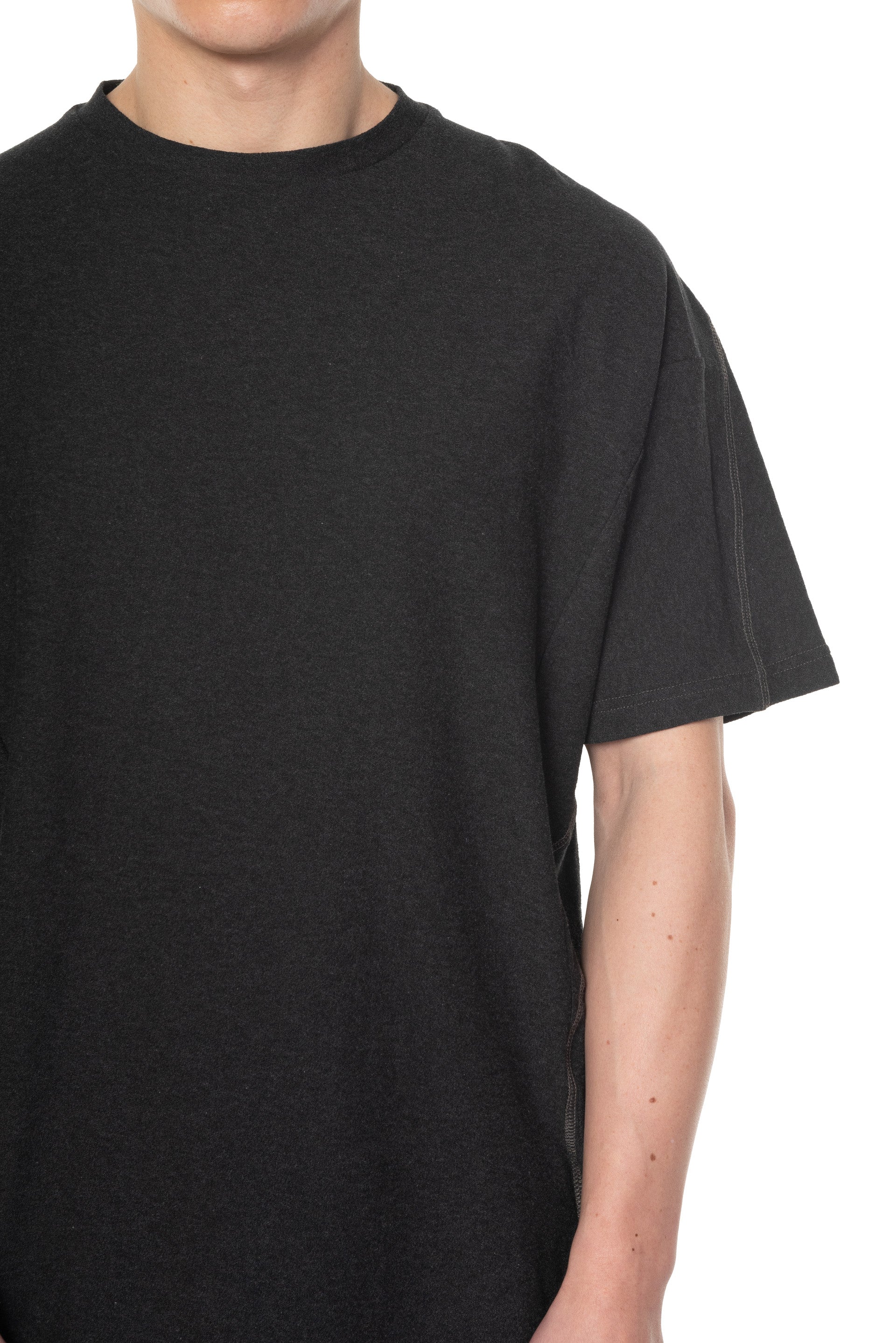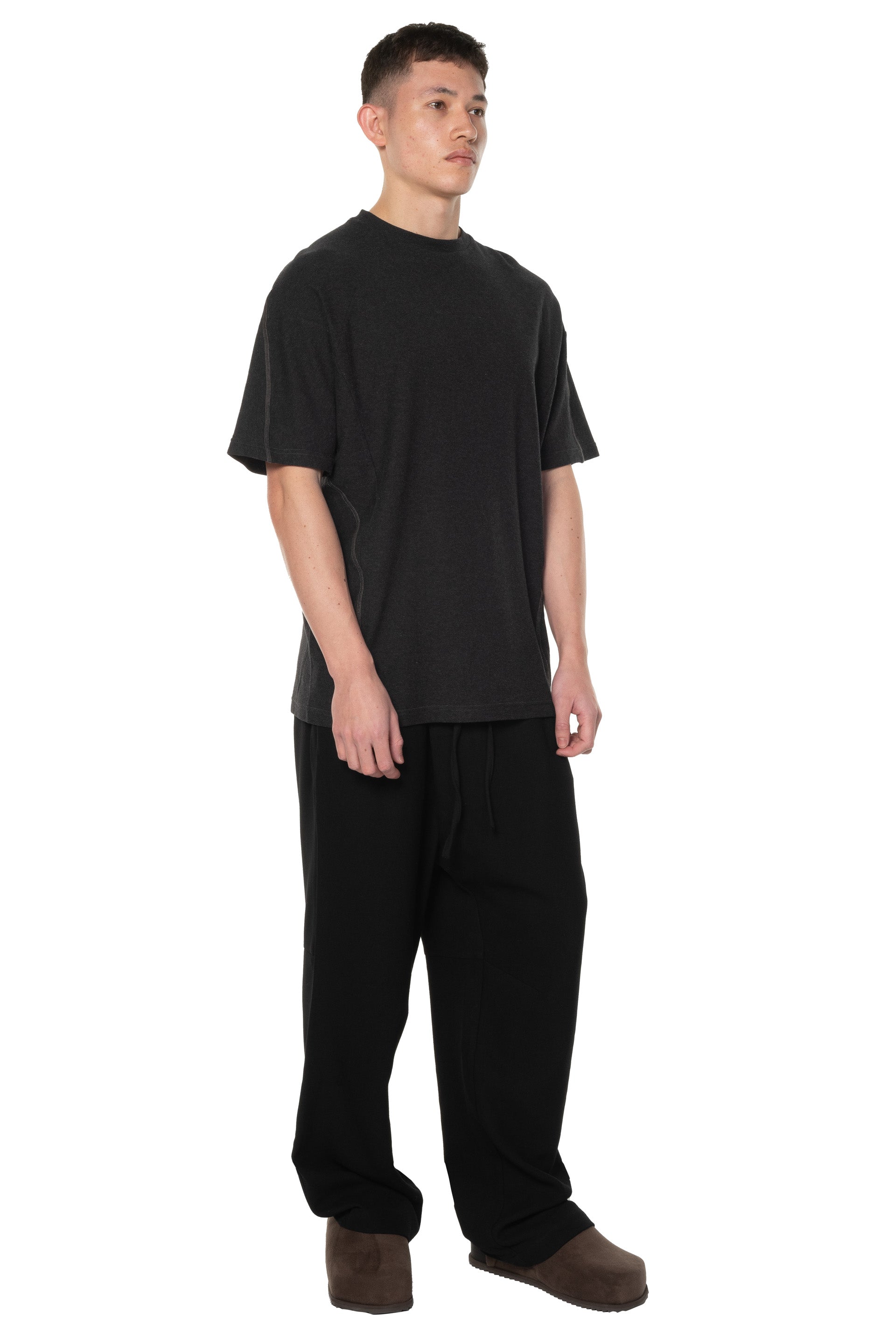 Round neck. Short sleeves. Wrapped T-shirt. Cinched details throughout. Stitching details at back and front. Soft textural fabric. Boxy fit.