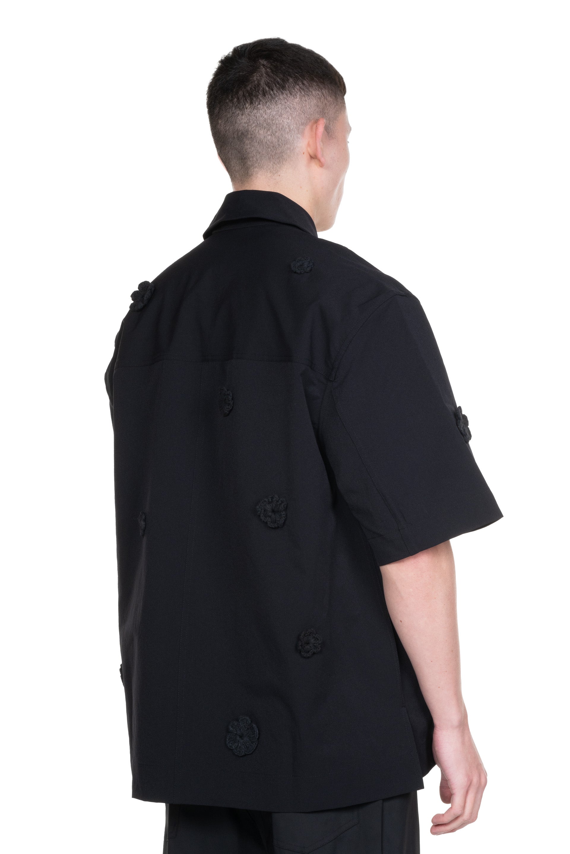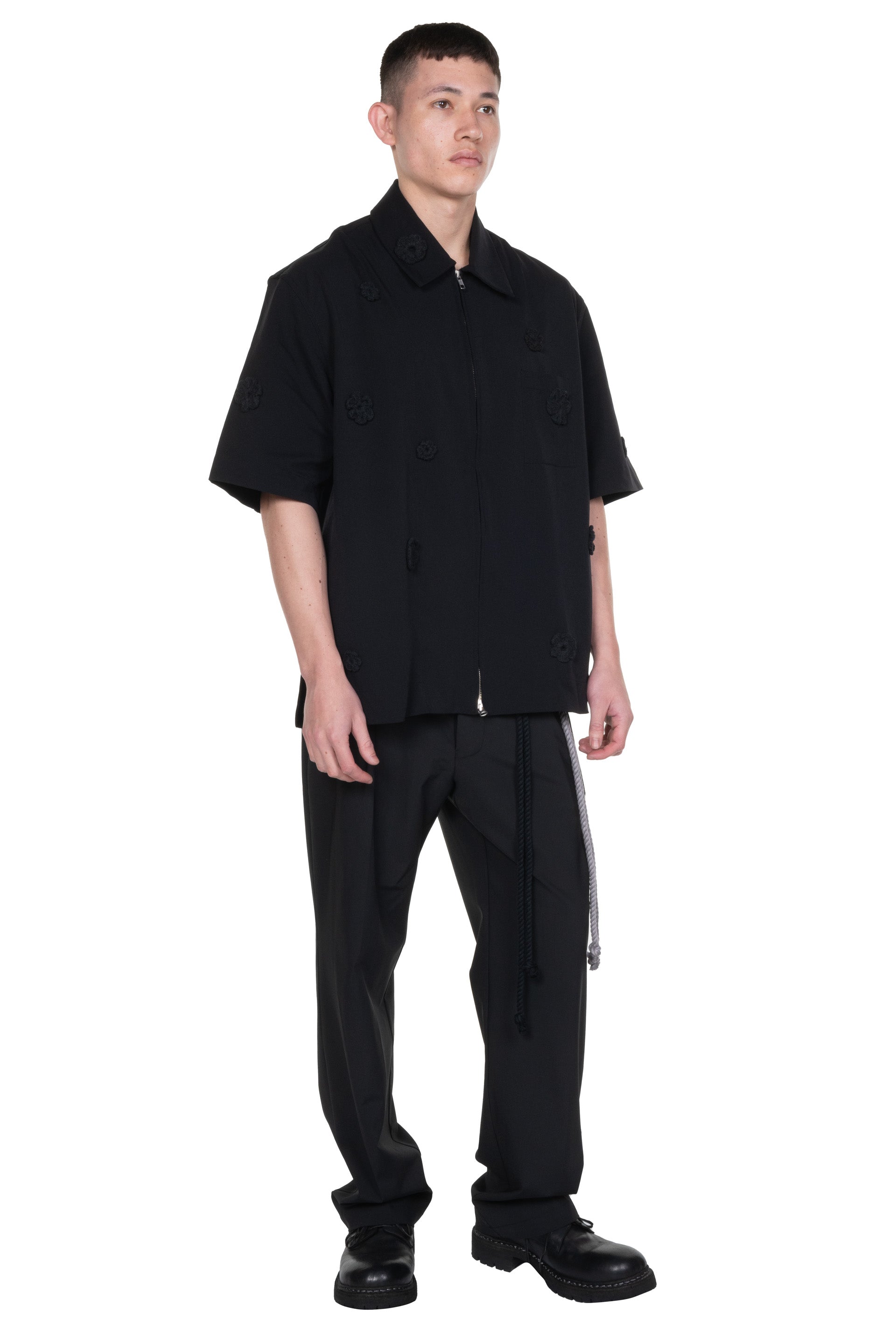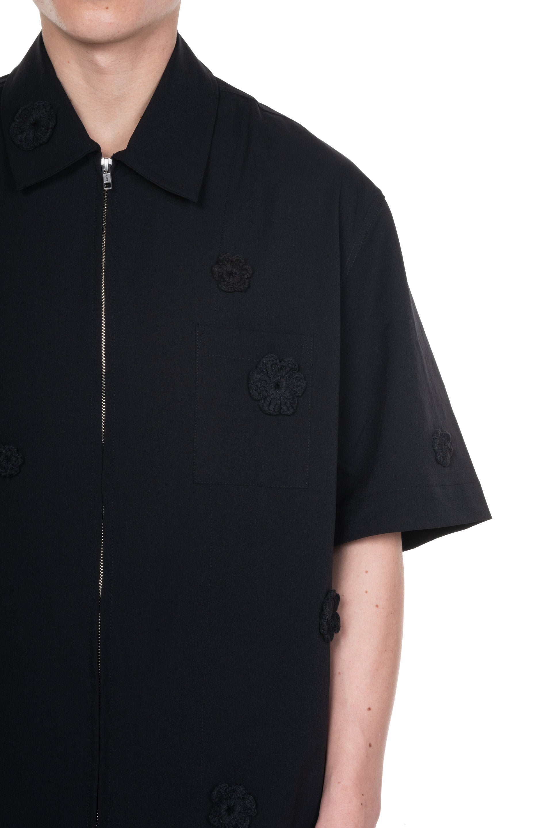 Song for the Mute shirt. Short sleeves. Pocket at chest. Zip closure at front. Flower details throughout. Beautiful stretchy poly fabric from Japan.