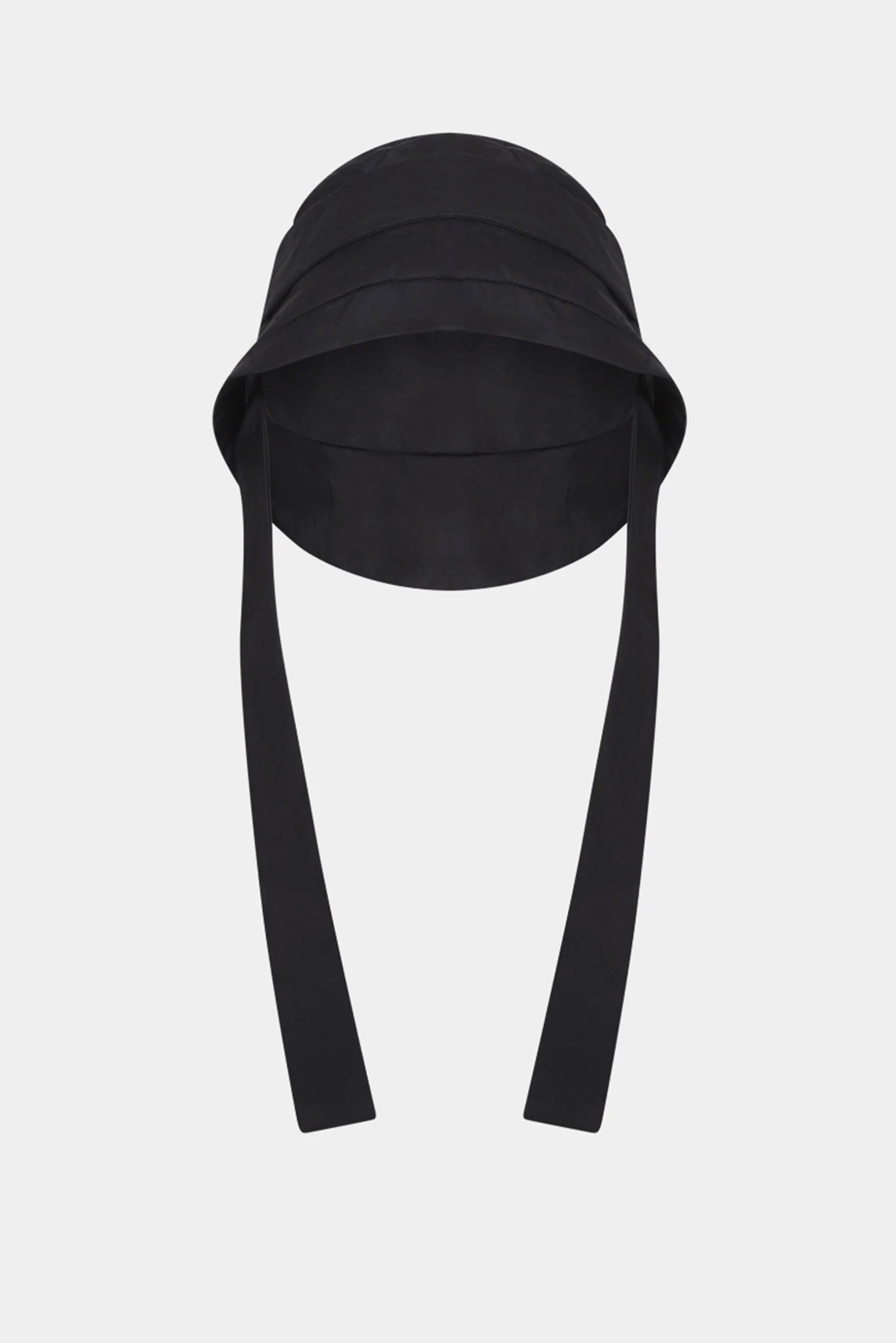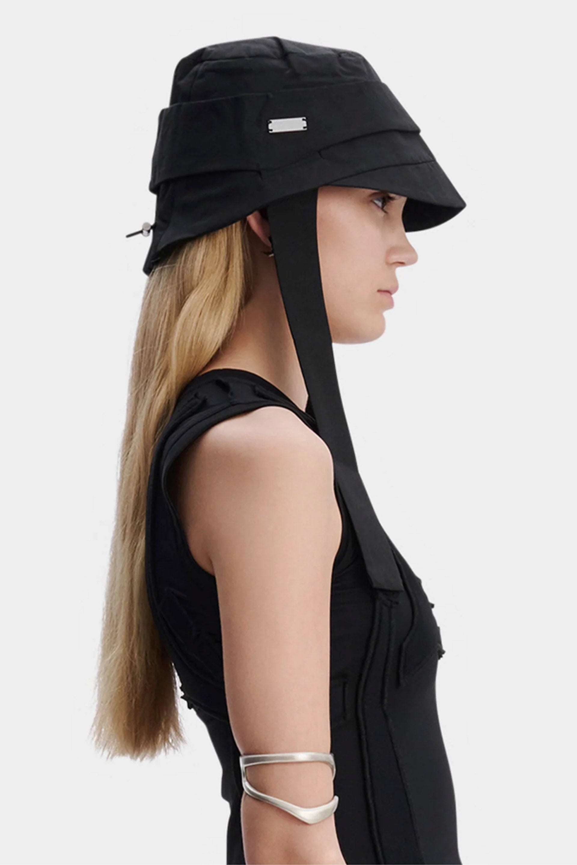 Adjustable nylon bucket hat with layered structure. Regular Fit. Layered structure. Detachable strings. Adjusters at back. Metal branded plate logo at the side.