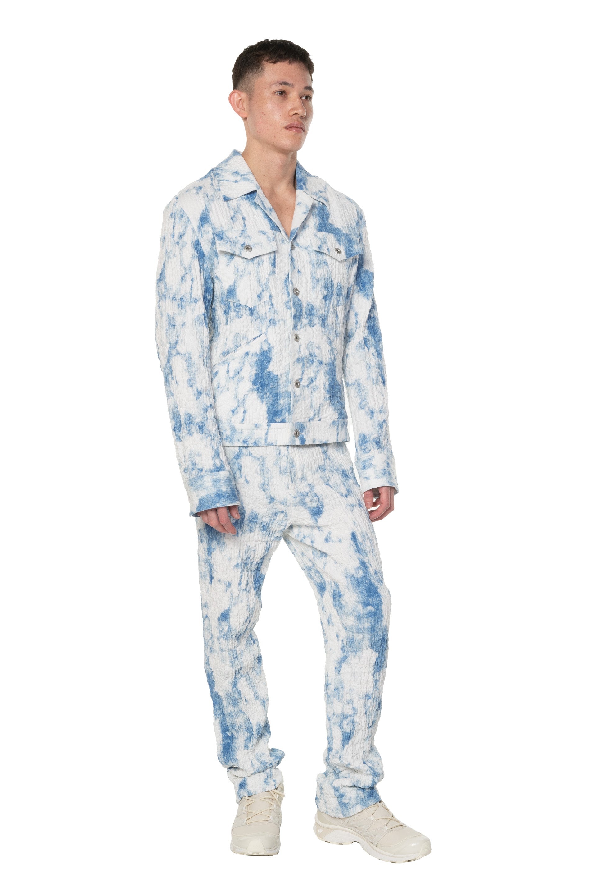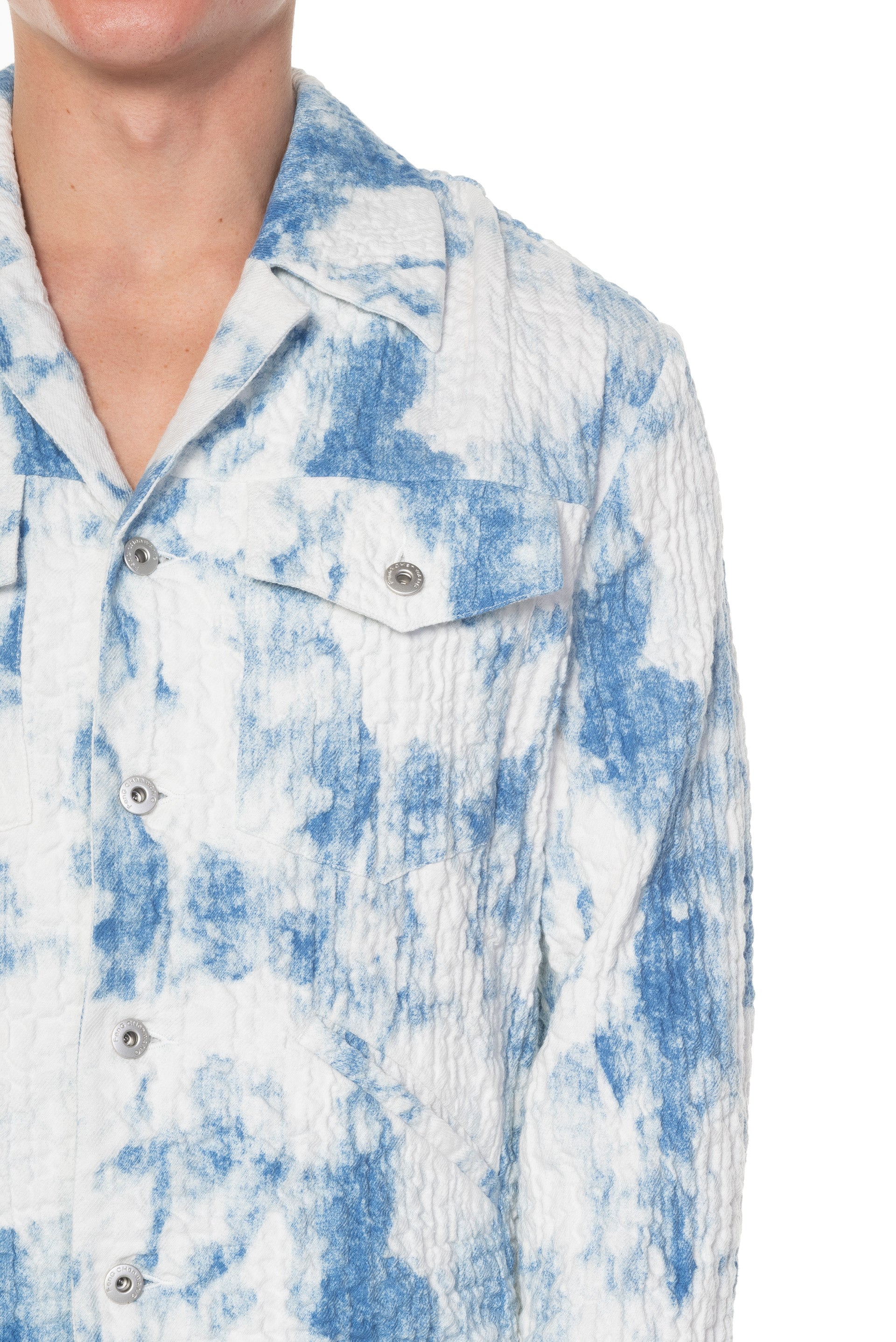 Button closure at front. Regular fit. Long sleeves. Open Collar. Two pockets at chest. Two pockets at side. Cloud sky textural fabric.