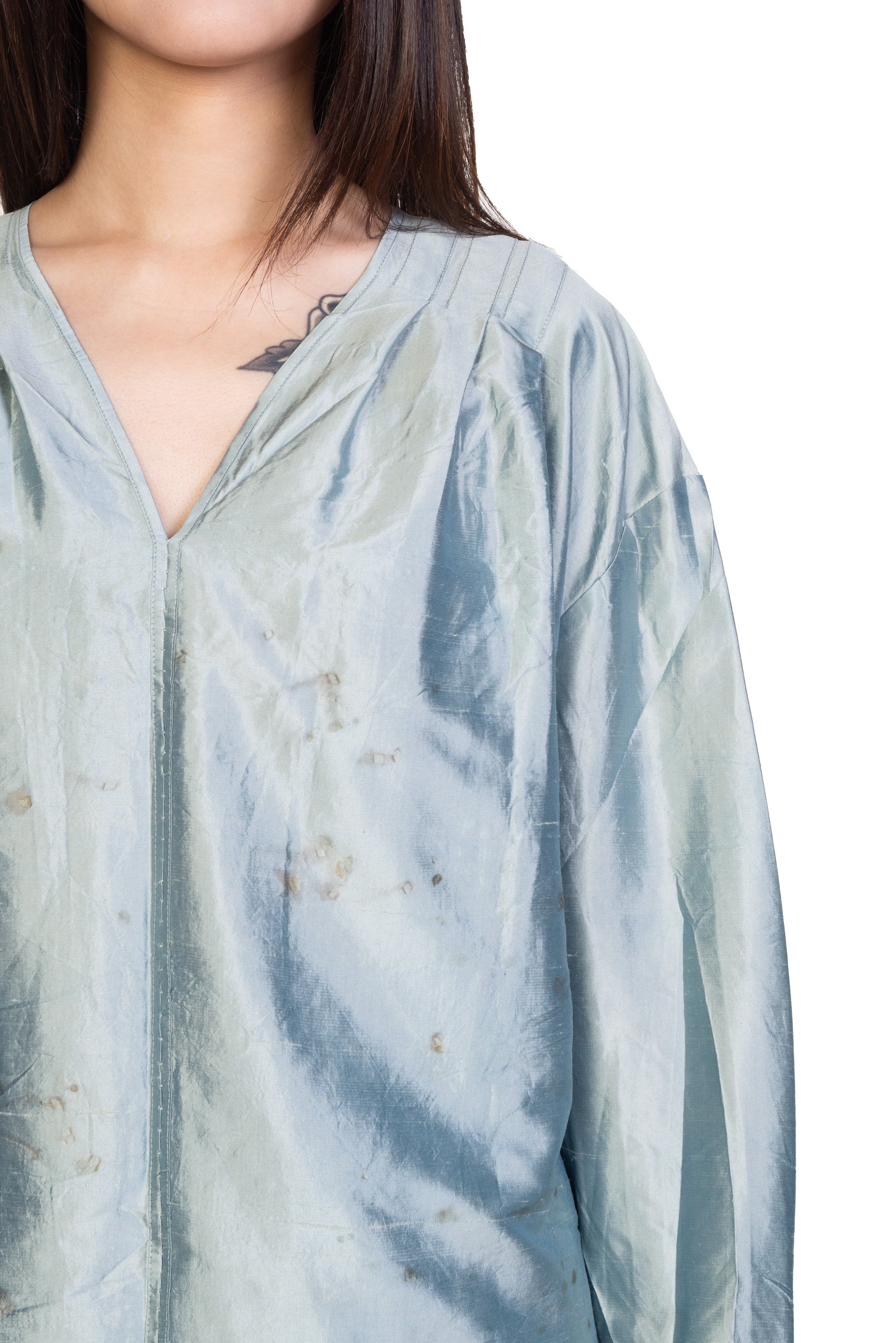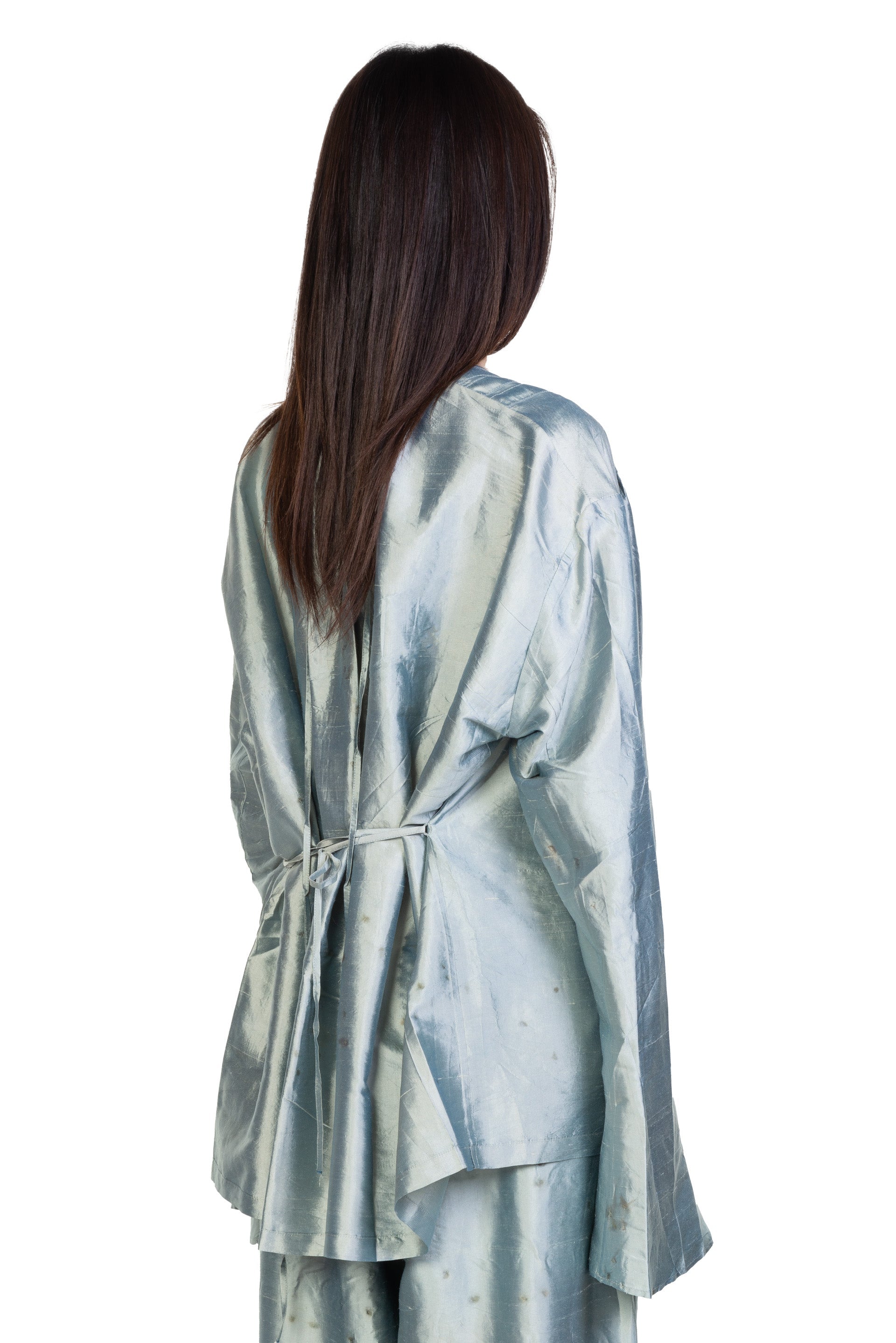 Long sleeves. Open v-neck. Belt details at waist and back. Blue dyed silk fabric.