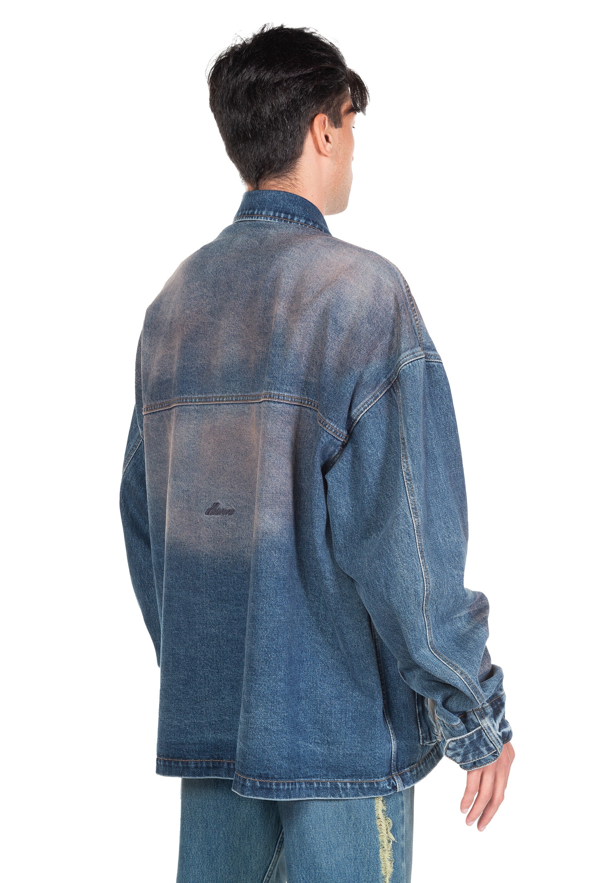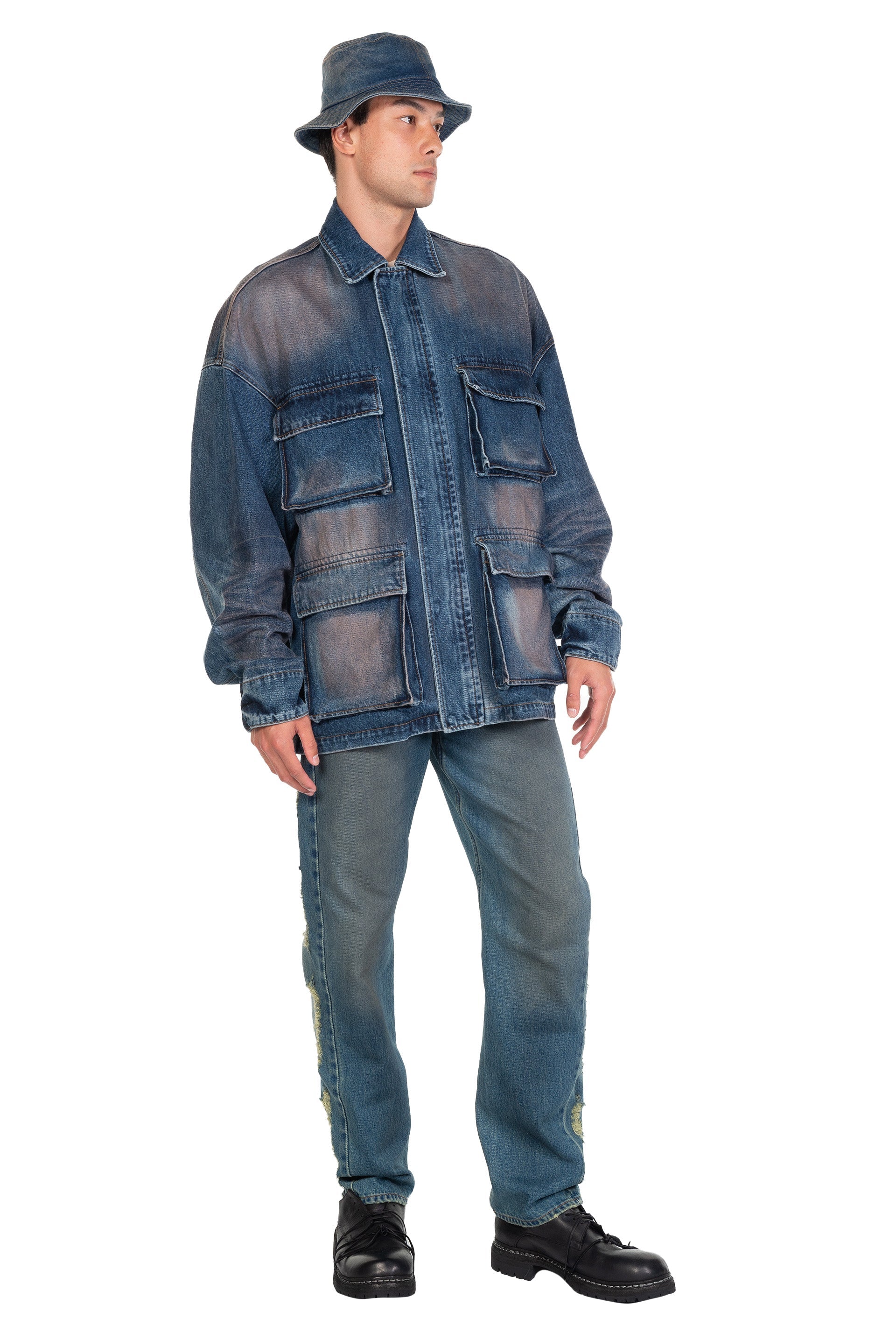 Oversized Washed denim Multi pocket jacket. Long sleeves. Double zip closure at front. Button closure at cuffs. 4 front flap pockets. Embroidered logo at back.