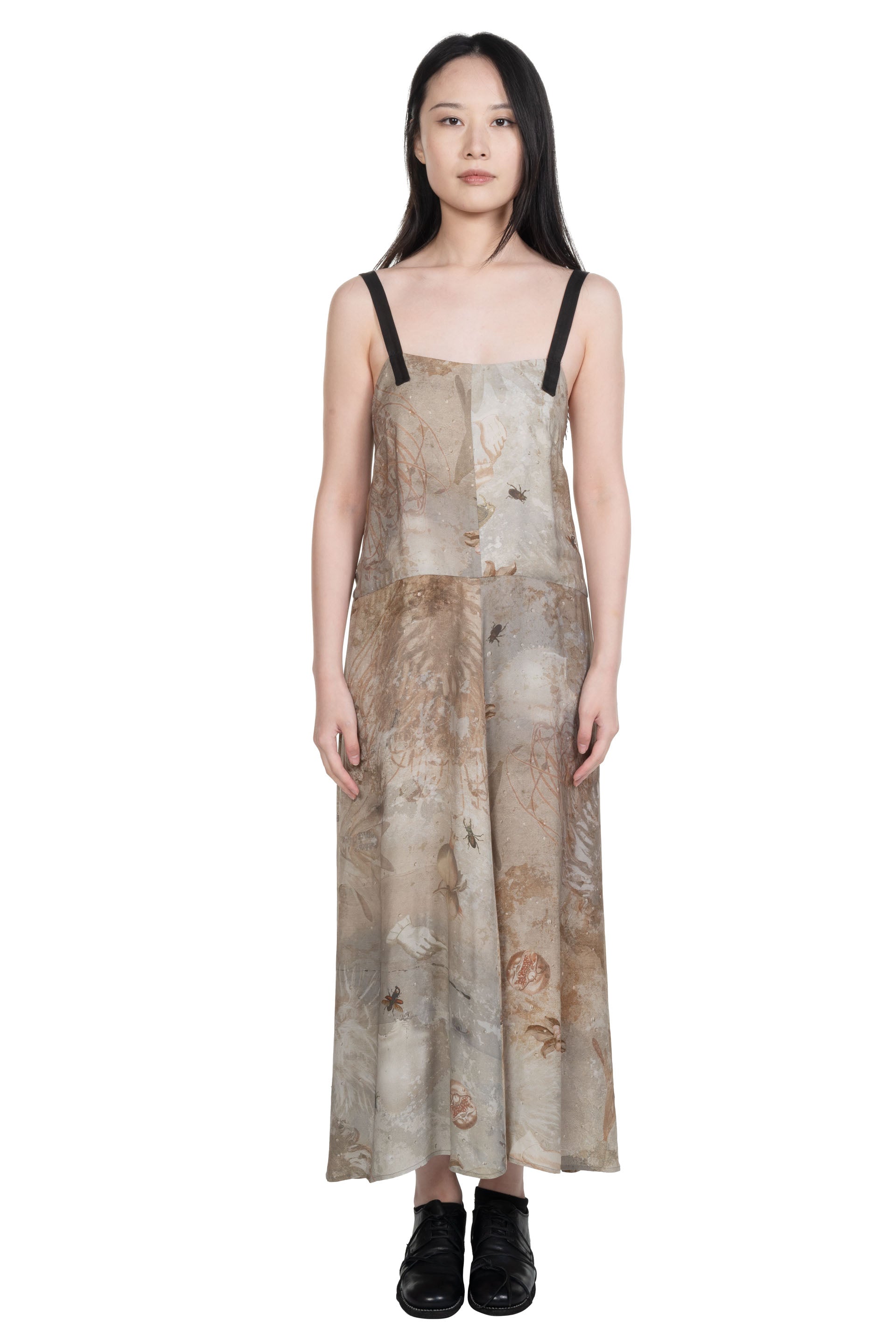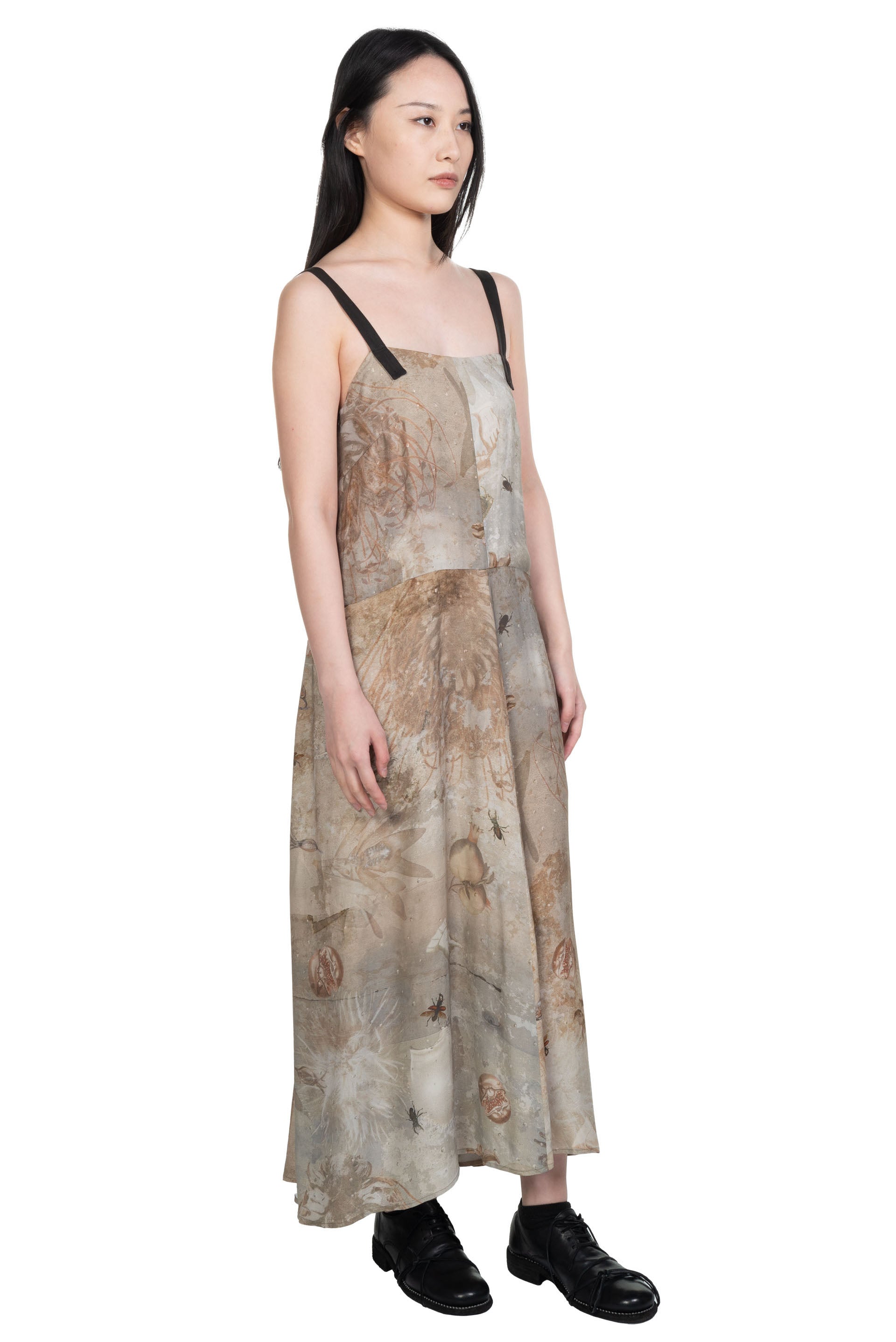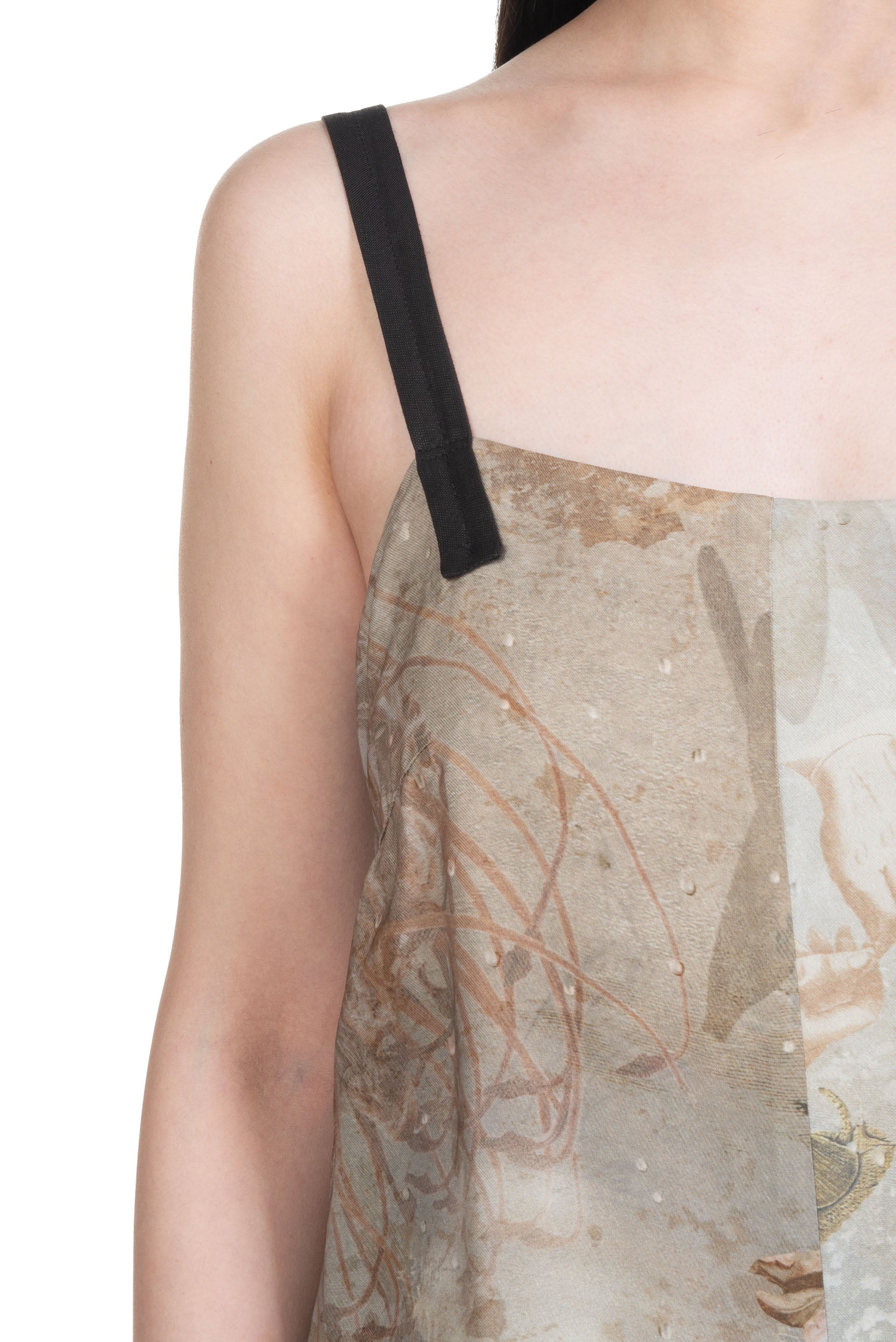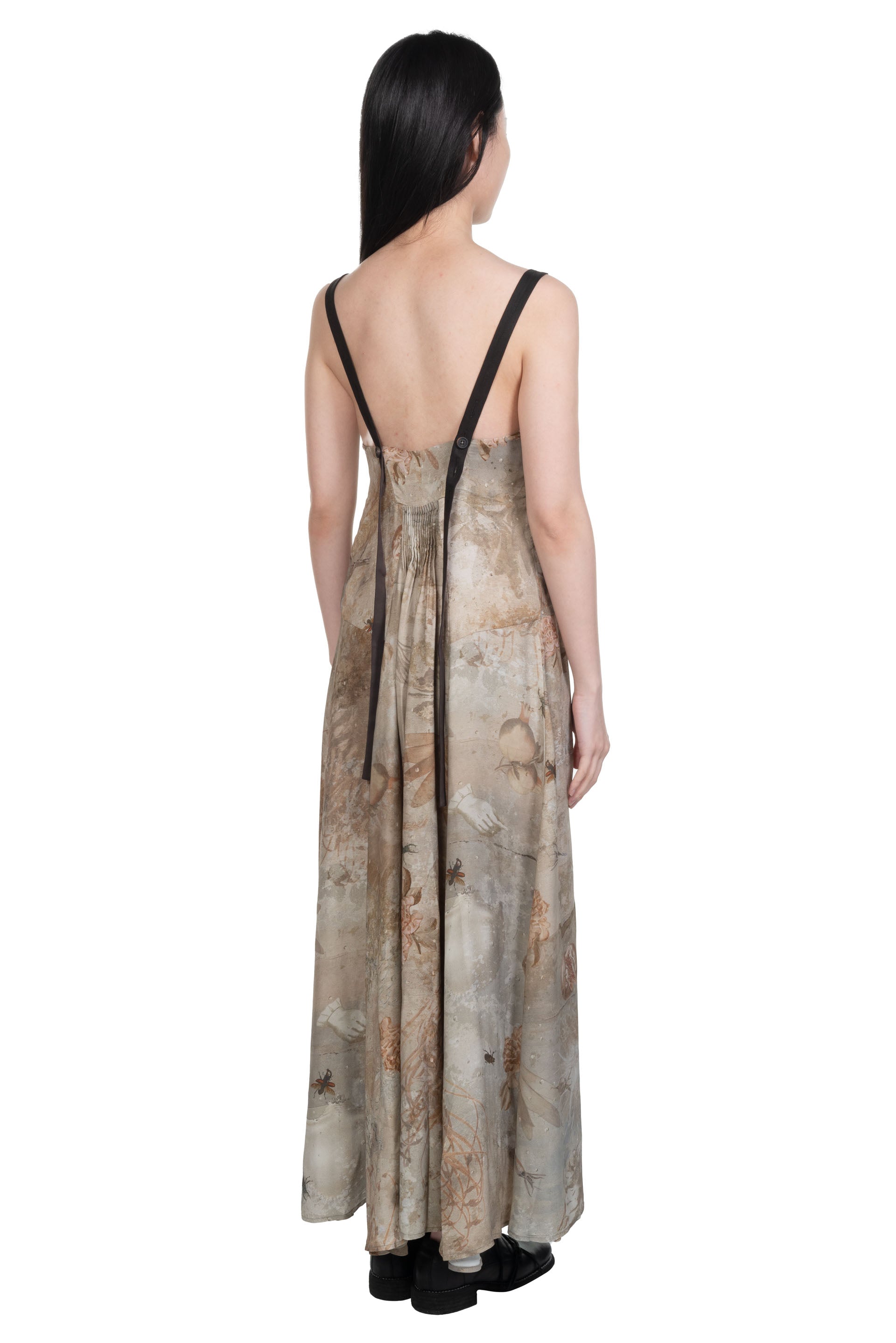 Full length. Regular fit. Open back with small pleats in the centre. Adjustable shoulder straps. Digital printed viscose twill with a crisp hand feel.