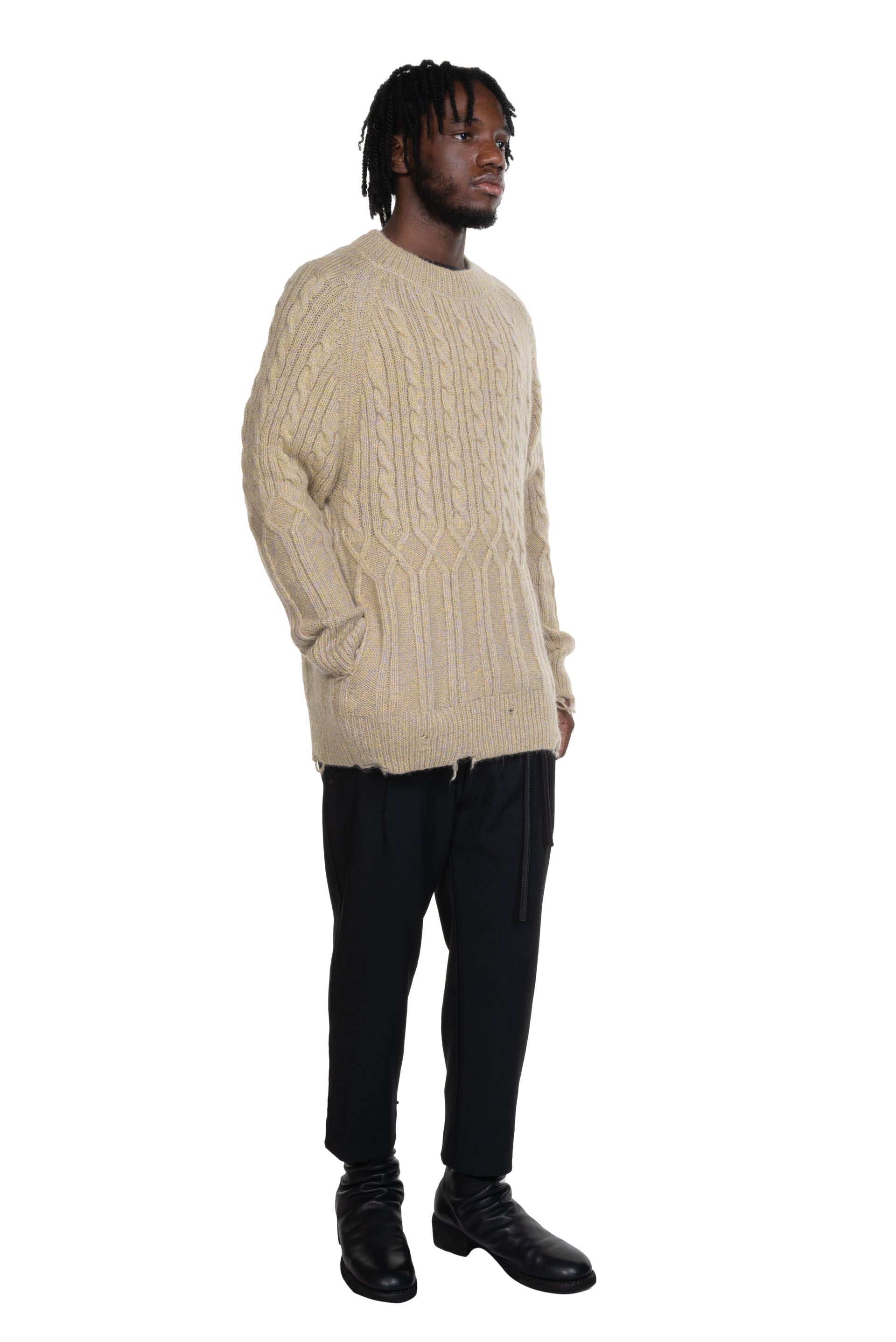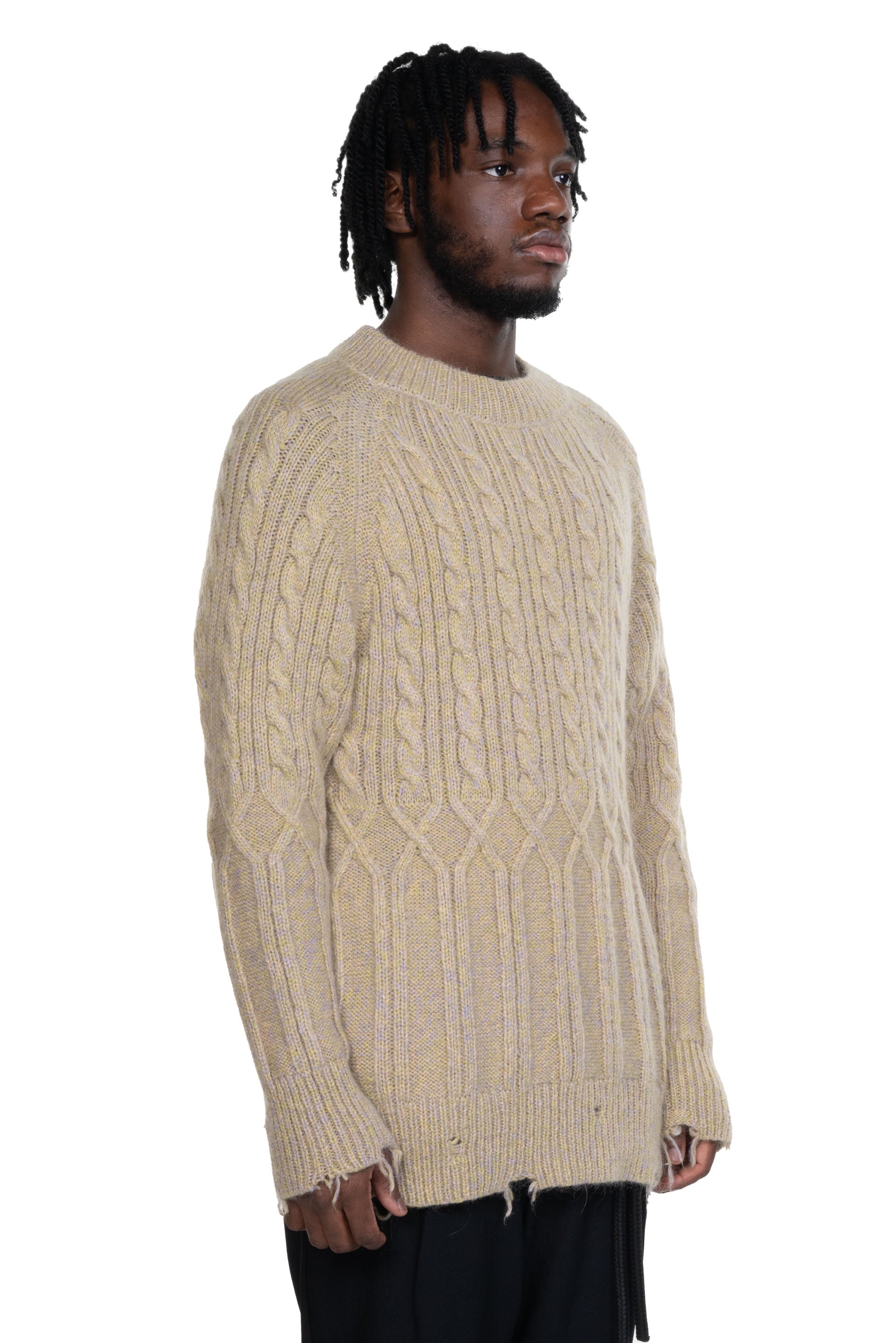 Long sleeves knitwear from Magliano. Round neck. Rib cuffs. Soft wool texture with cable irregular cable knit design.