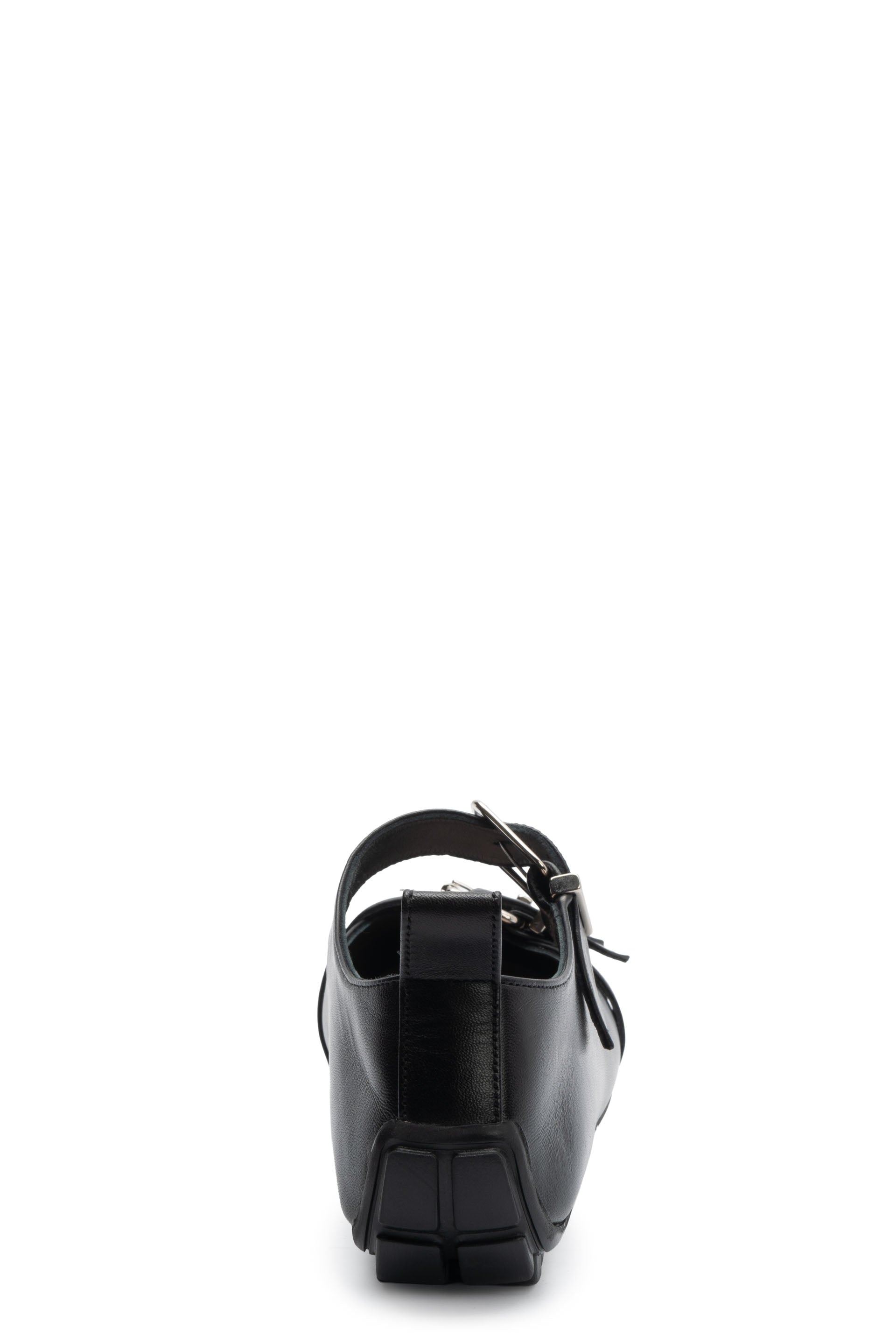 Simone Rocha leather Mary Jane flats. Adjustable buckle fastening. Closed round toe, oversized Mary Jane strap, two front straps with buckle embellishments, silver-toned hardware, pull-loop at back, cleated sole.