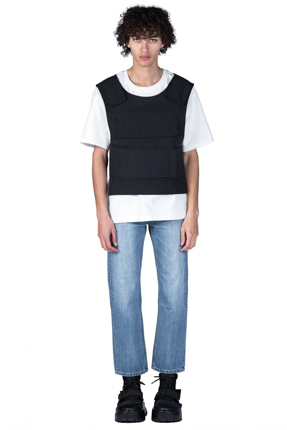 Innovative designs take centre stage in the Sankuanz collection at UJNG. Experimental shapes and offbeat graphics create a flamboyant, boundary-pushing look. Find a vibrant colour palette and bold use of textures. Architectural pieces with unexpected embellishments enhance the eye-catching nature of this edit, as seen in the Bullet Proof Vest T-shirt.