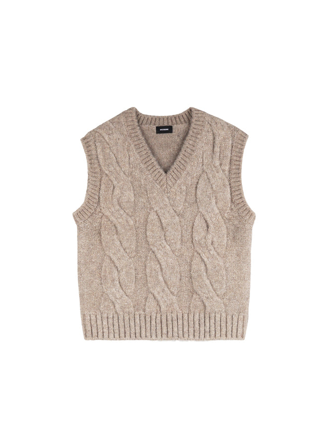 We11done sleeveless cable knit brushed wool-blend vest in beige. Rib knit V-neck collar, arms and hem.