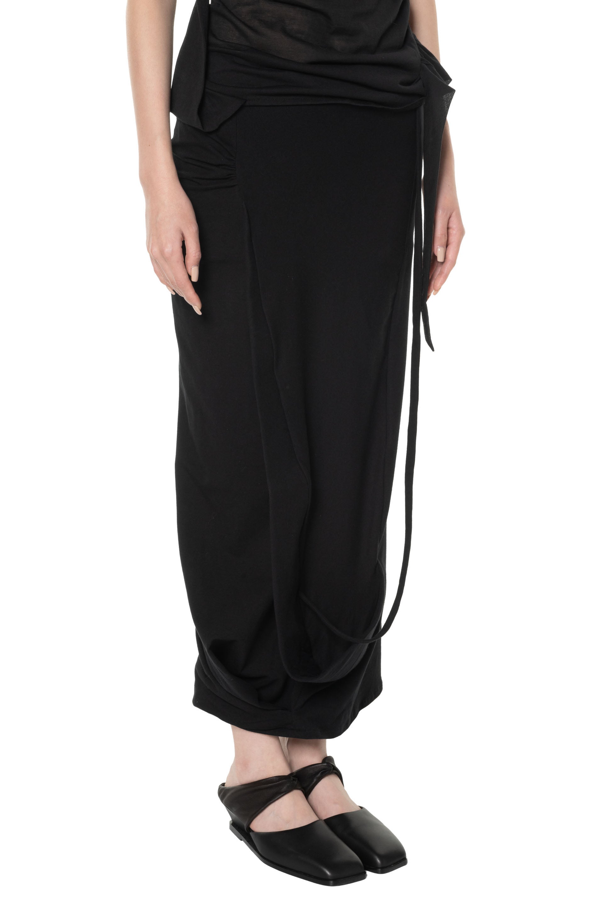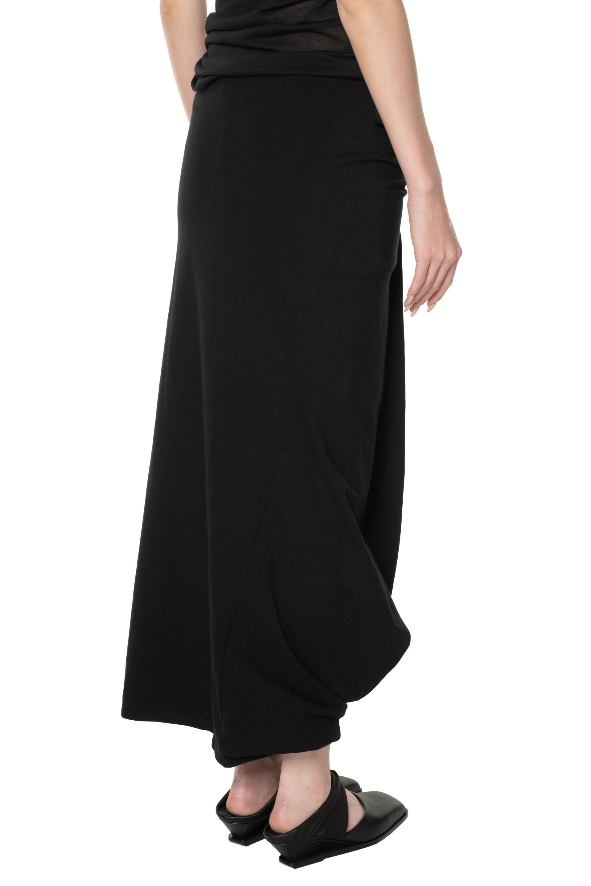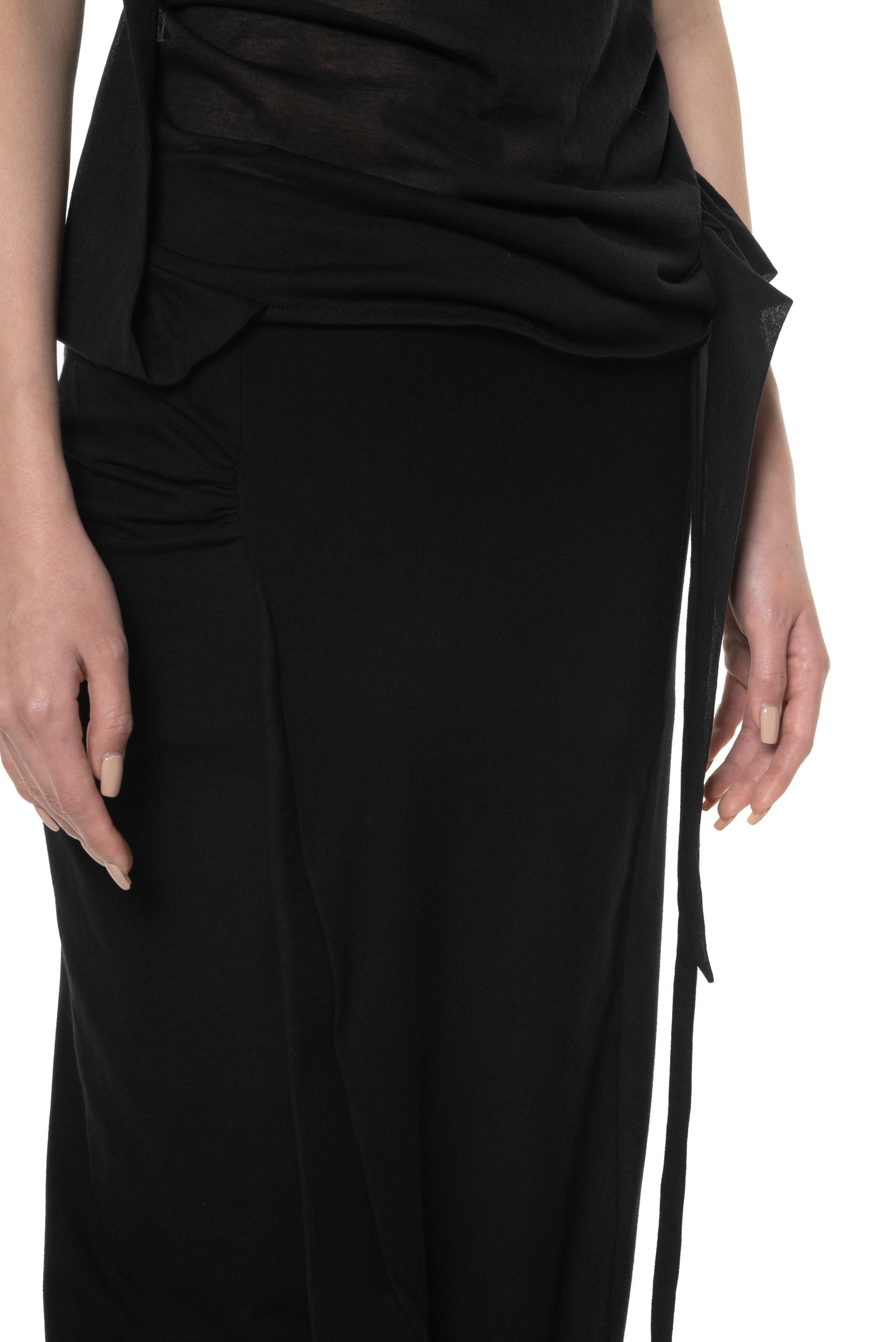 Maxi-length skirt with an elasticised waistband and draping details on the skirt. Low waist fit. Asymmetrical hem