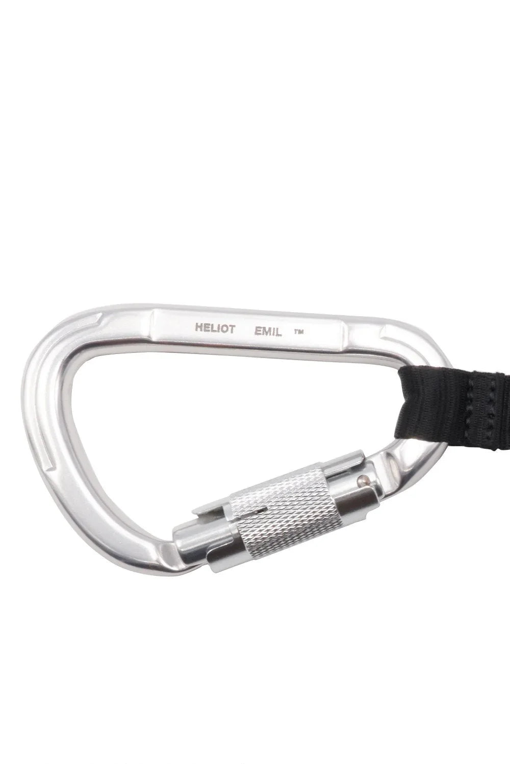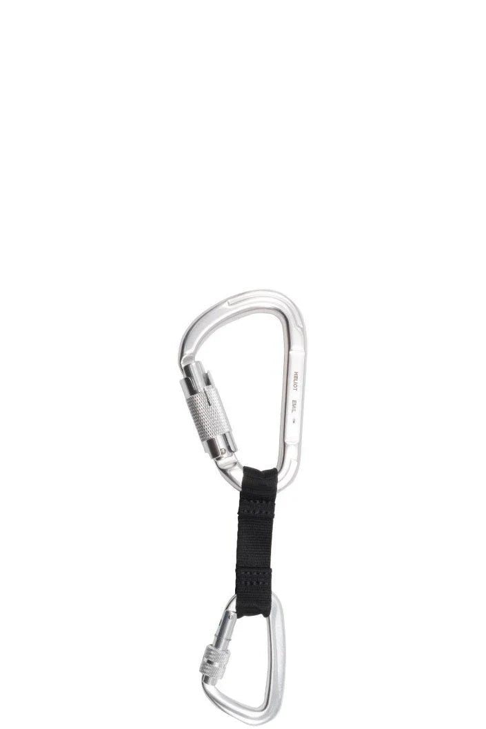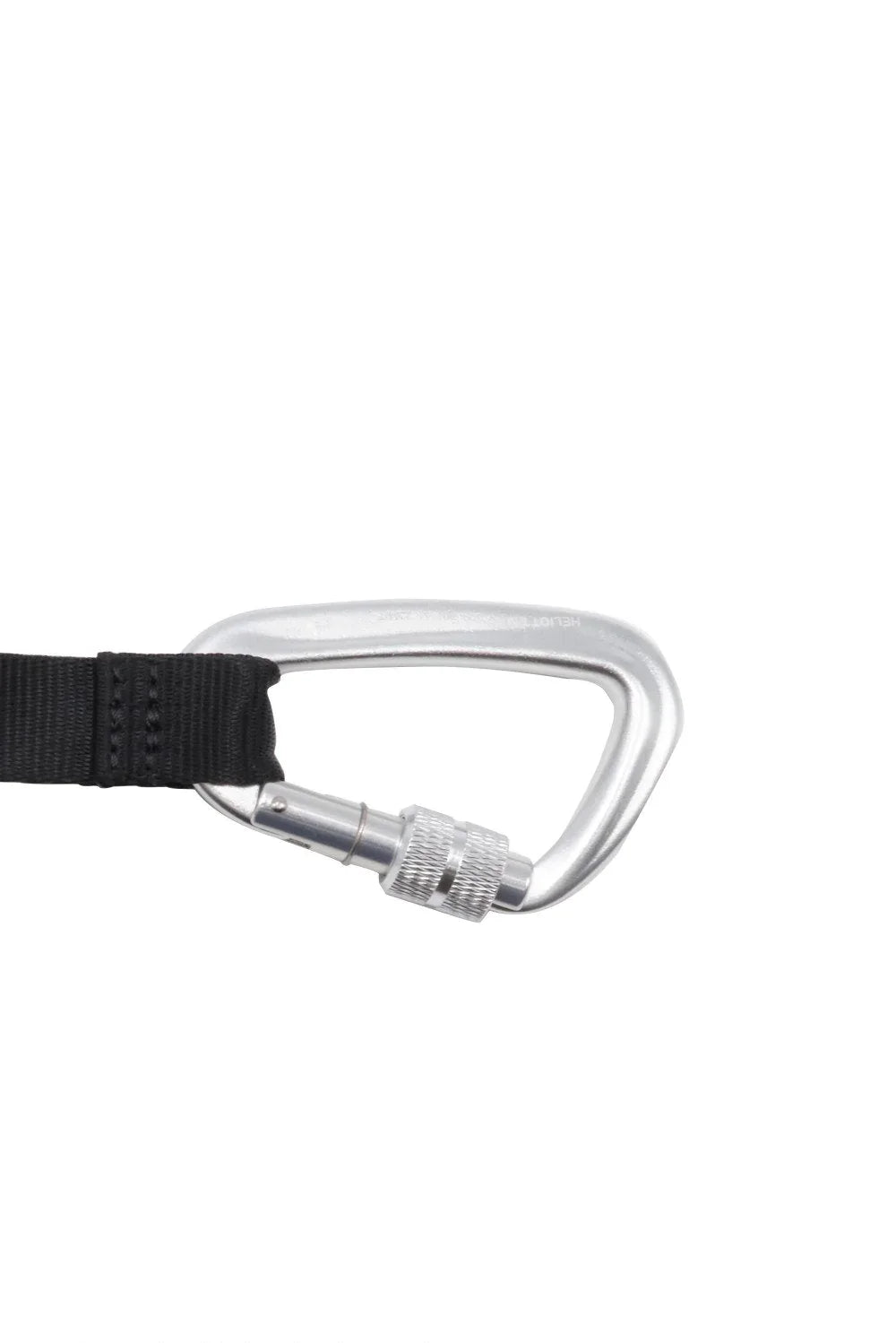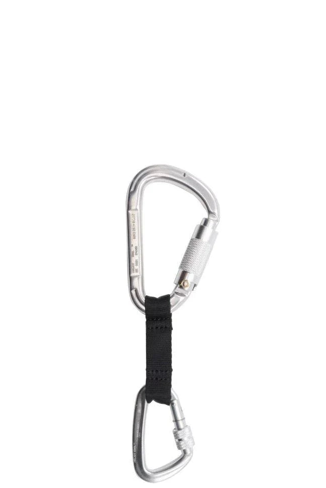 Two silver-tone carabiner clips. Etched logo along clip. Webbing attached to carabiner clips.