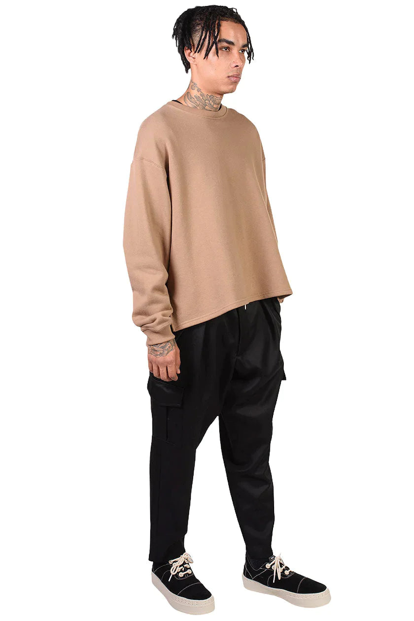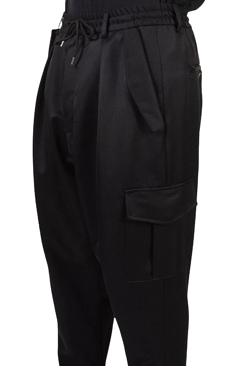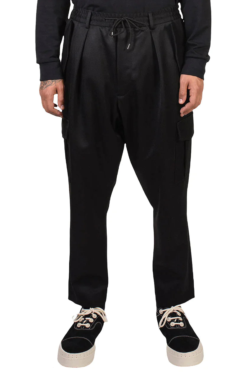 Lownn Cargo Pants in Black. Two side pockets. Elastic waist. Drawstrings at waist. Tappered.