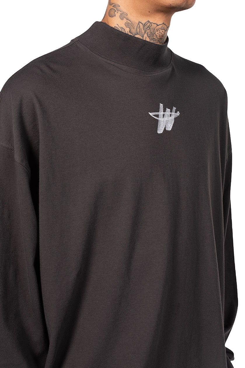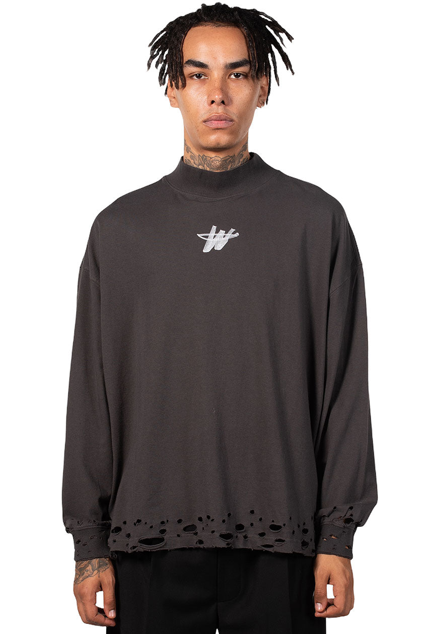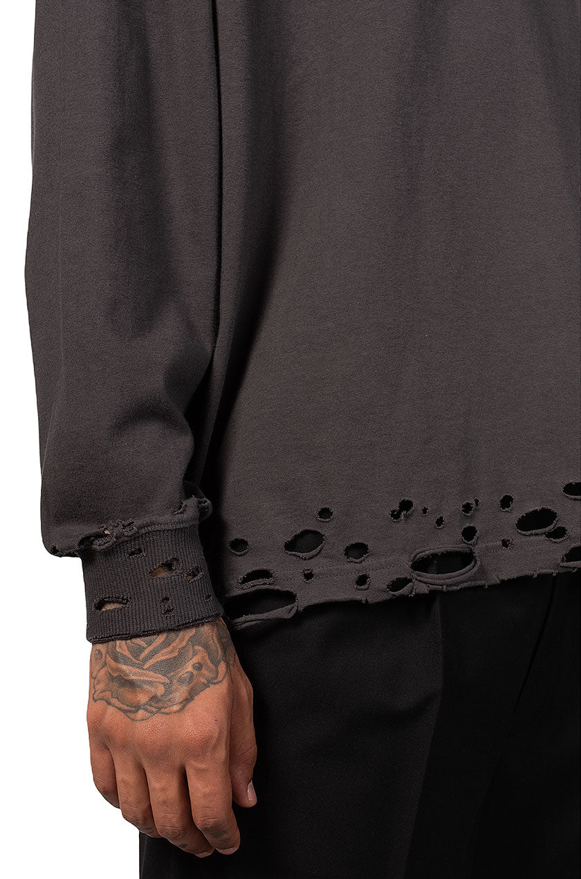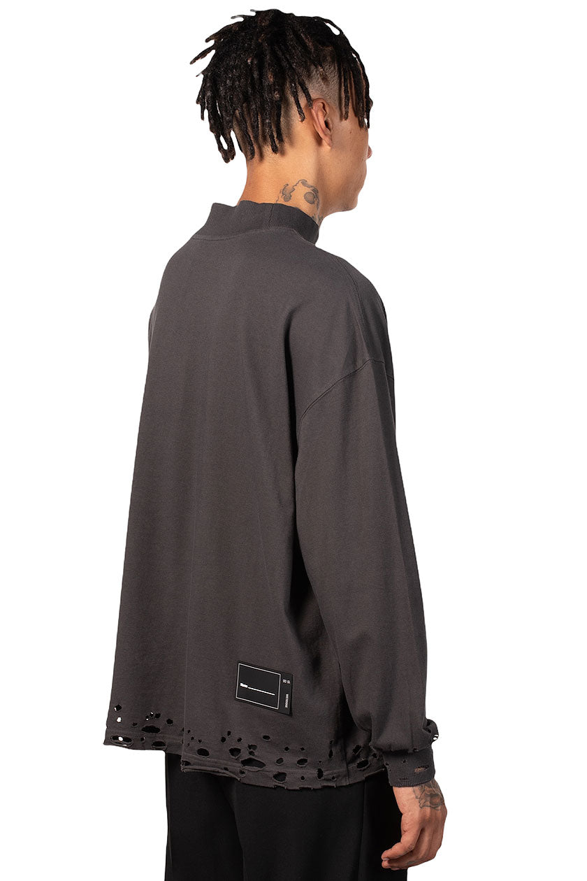 Long sleeve cotton jersey T-shirt in grey. Distressing throughout. Rib knit mock neck collar and cuffs. Logo printed in white at chest. Rubberised logo patch in black at back hem.