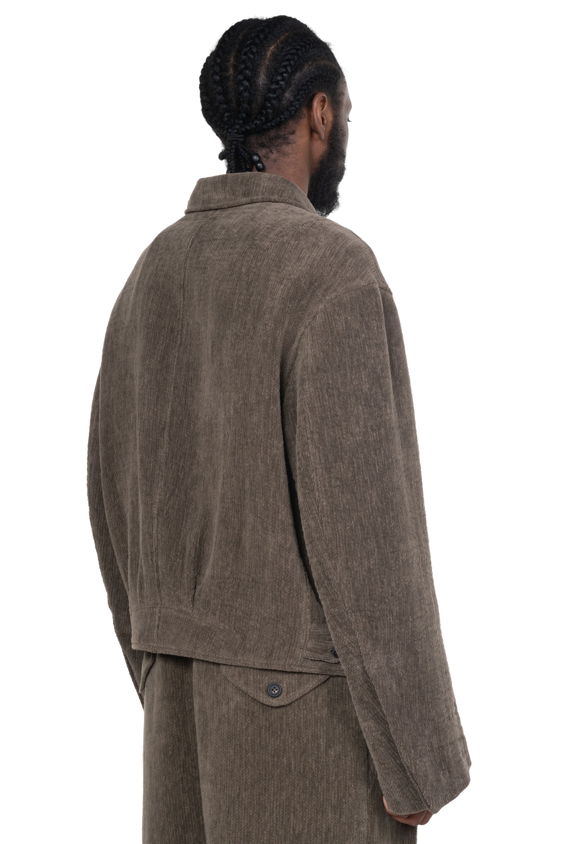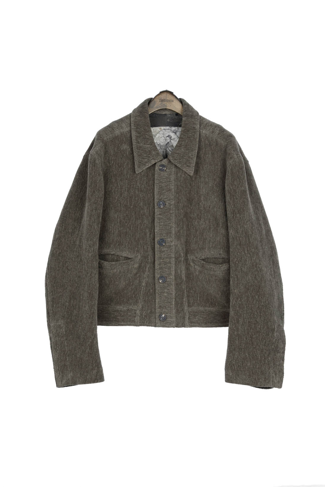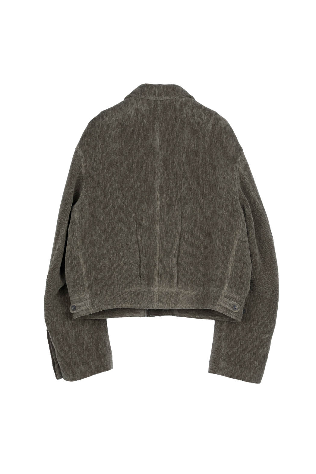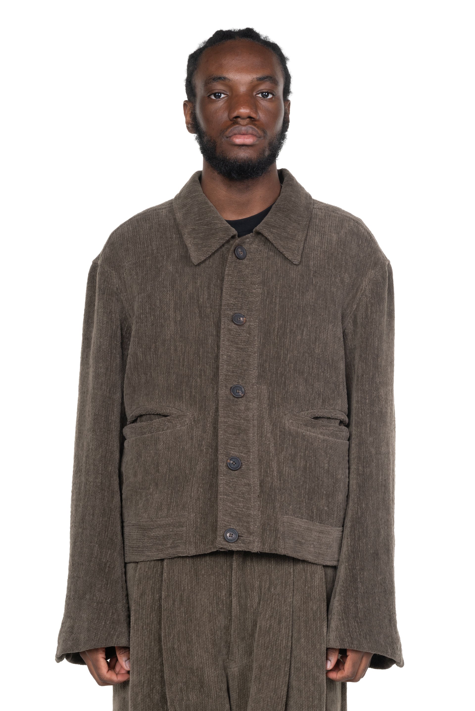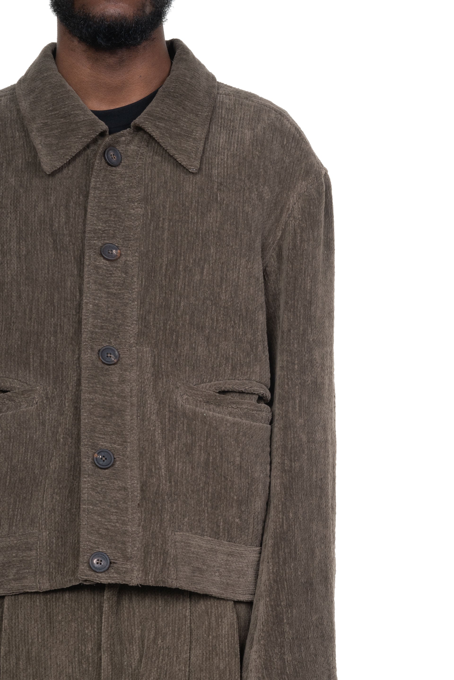 Ziggy Chen chenille cloth cropped worker jacket. Loose fit. Waist-length. Spread collar. Visible button closure. Two front pockets. Fully-lined.