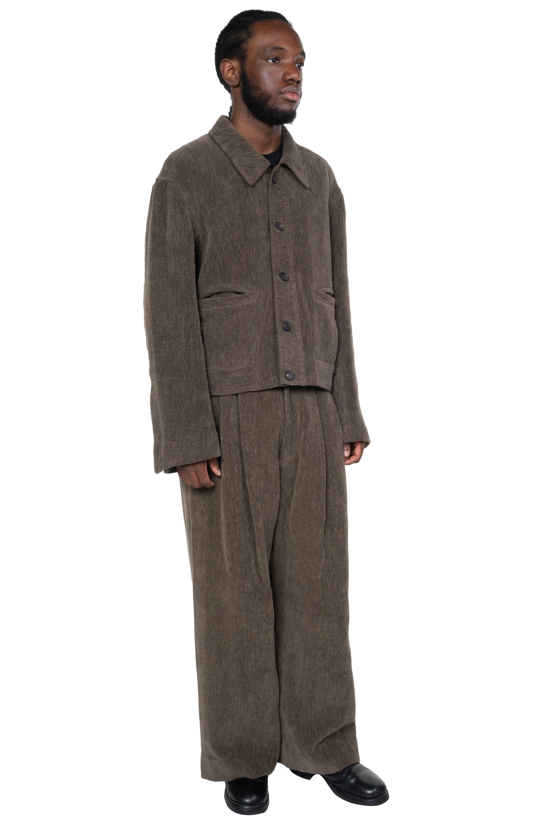 This season silhouette enhances wearability and essential lines. VOLEISURE is not just a collection but a suggestion of a return to a spontaneous way of living. The pieces allow the wearer to move agilely between urban and natural environments, accompanied by a design that distils tranquillity and elegance-a whispered, timeless and refined way of life as seen with the Chenille Cloth Cropped Worker Jacket.