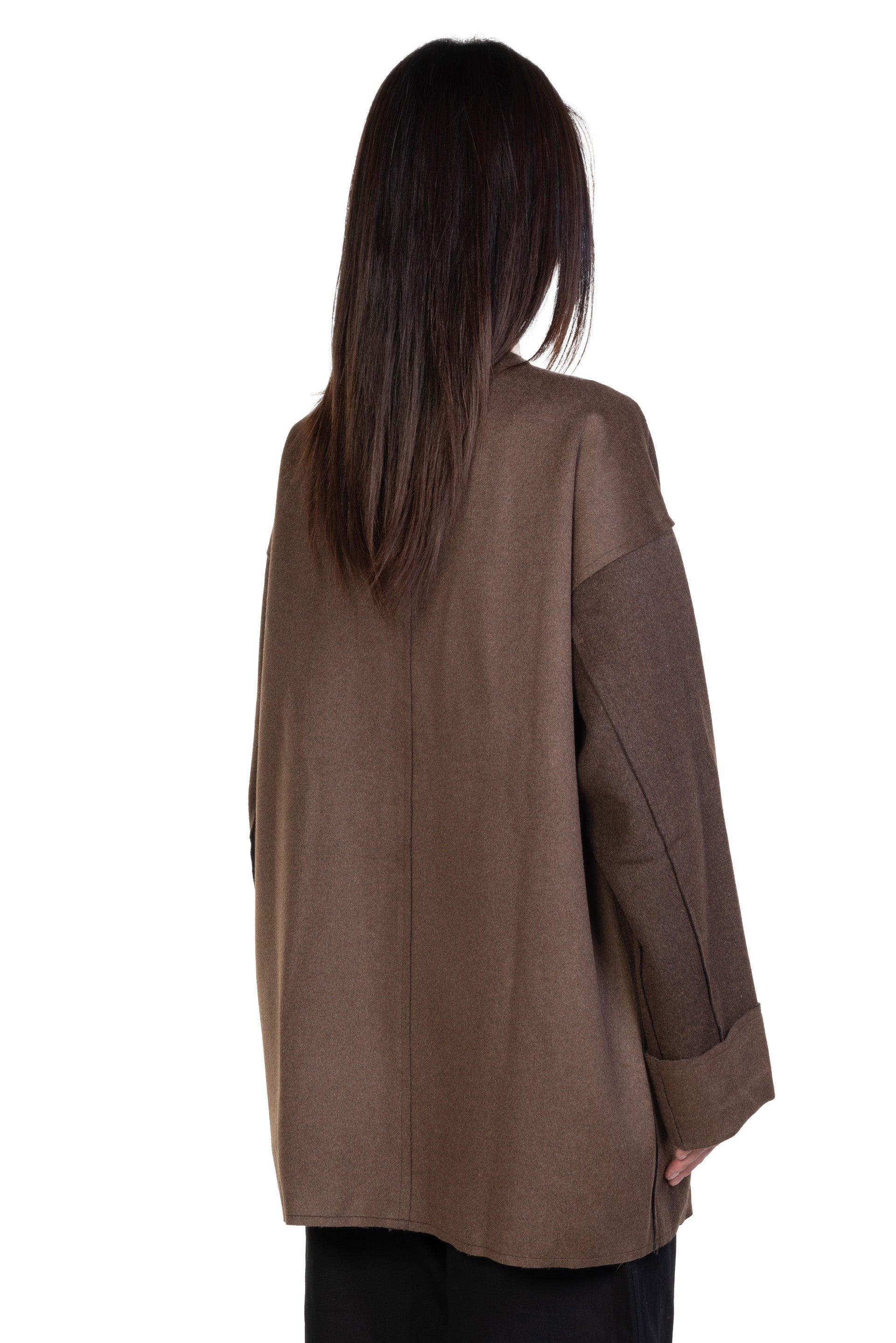 Long sleeves.Button closure at front. Two side pockets. Boxy fit. Mid-length.
