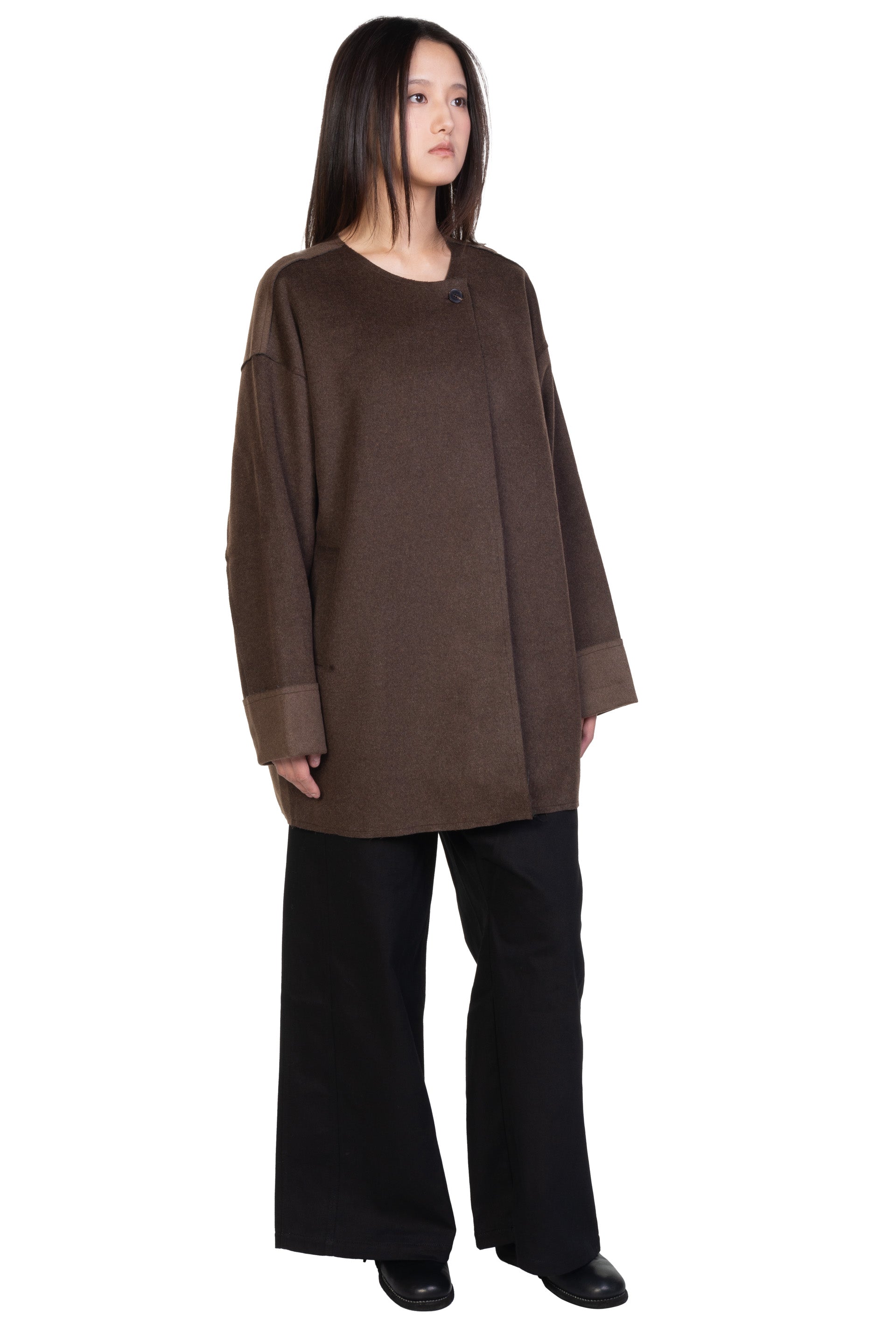 ii delivers a sense of originality, simplicity, spontaneity and a hint of childlike innocence pushing boundaries among ages to present qualitative collections with timeless touches designed for independent individuals as seen with the Chestnut Mid-length Jacket.