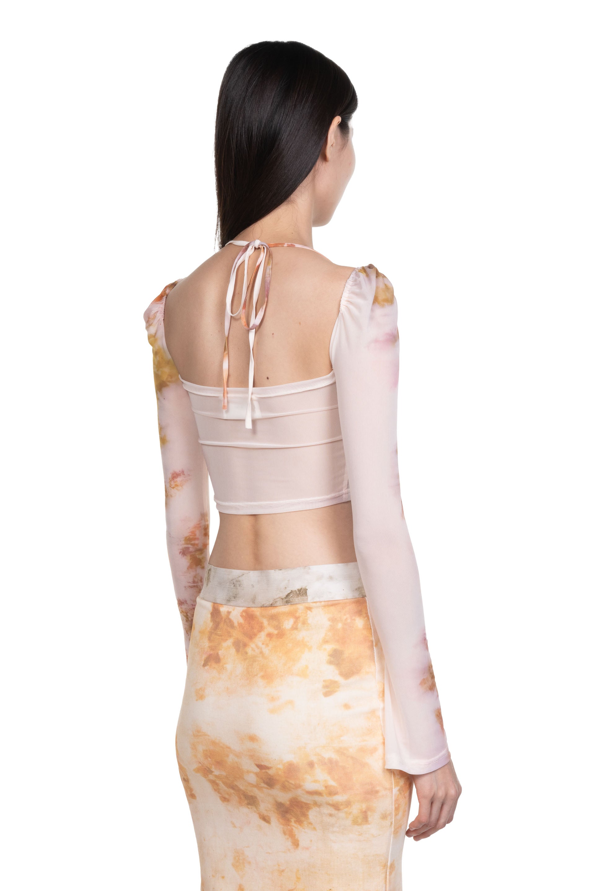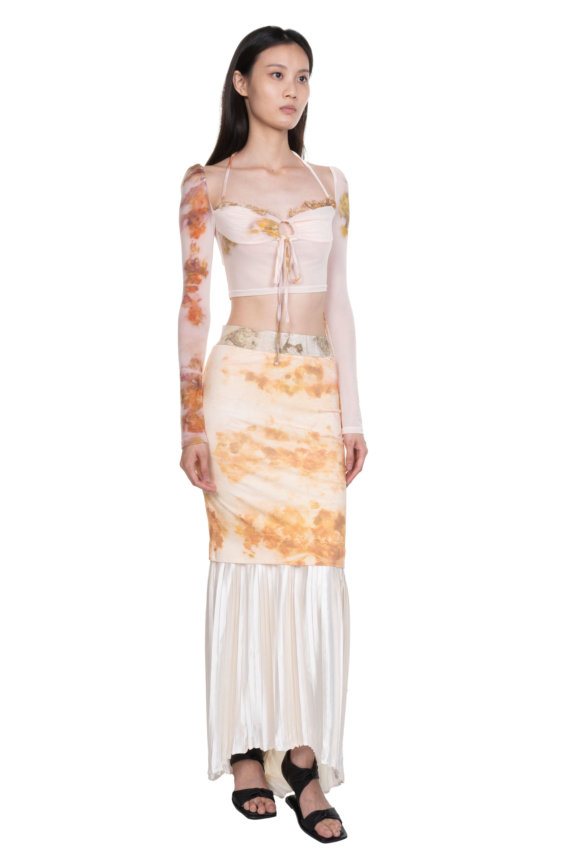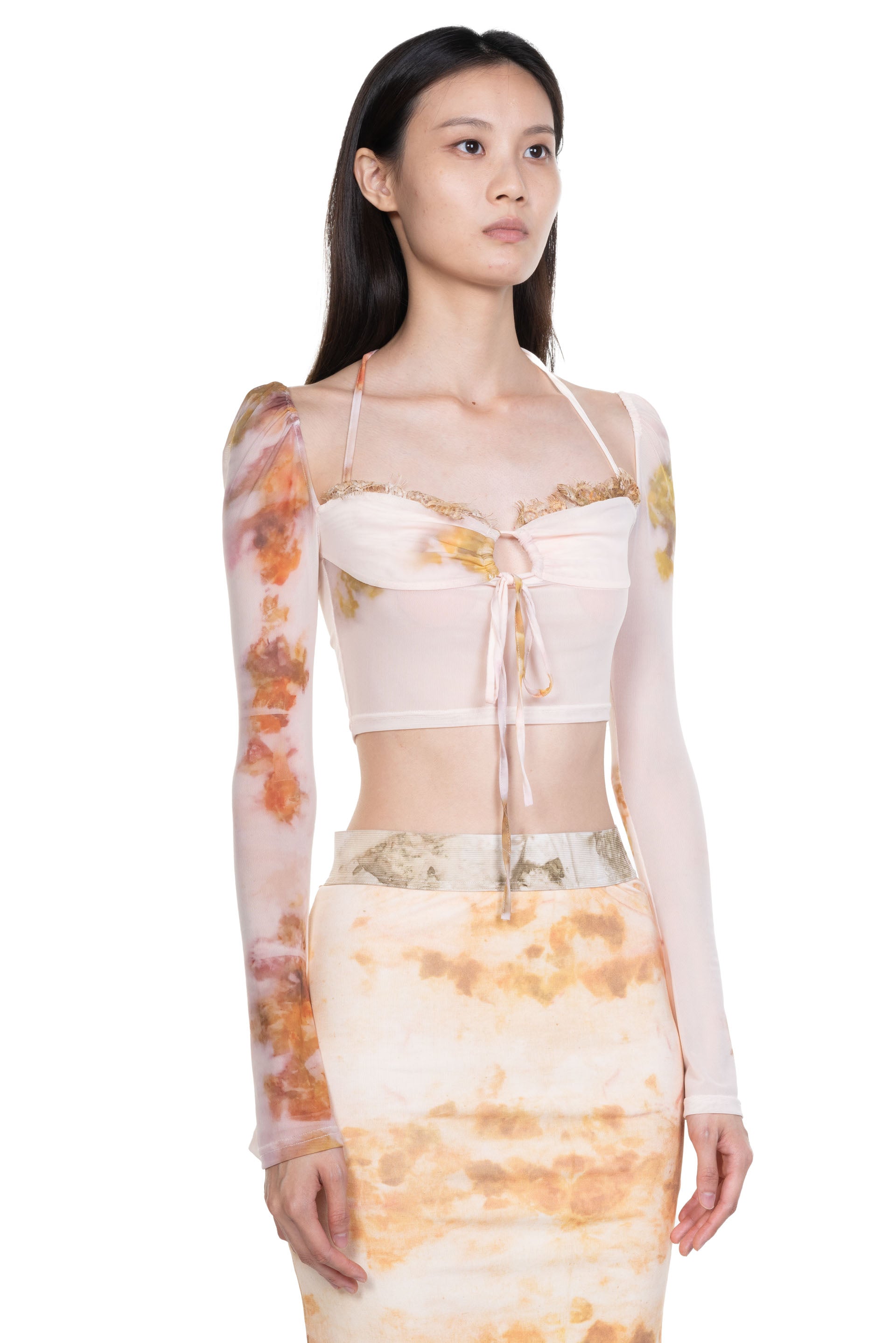 Peng Tai creates modern silhouette with traditional chinese philosophy. Inspired by how Chinese herbal medicine regulates the body from the inside out, Peng Tai aims to research and develop a way to boil Chinese herbal medicine with fabrics, to create clothes that feel like a second skin as seen with the Chinese Medicine Print Lace-Up Top.