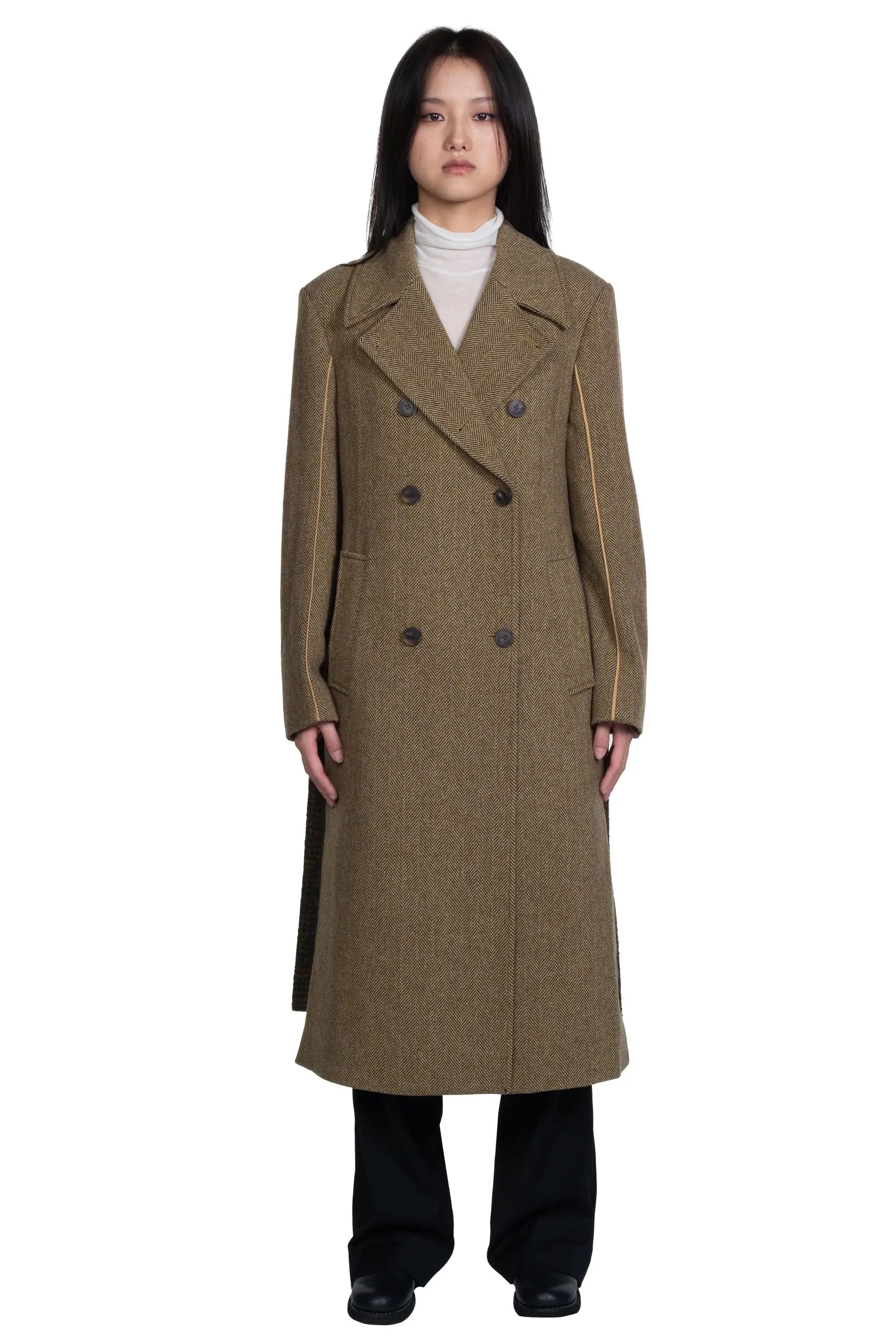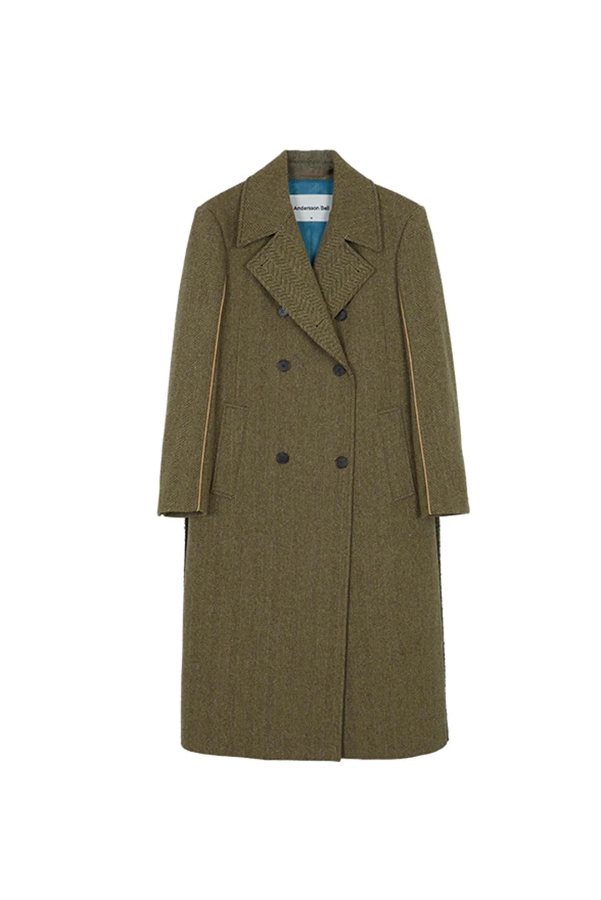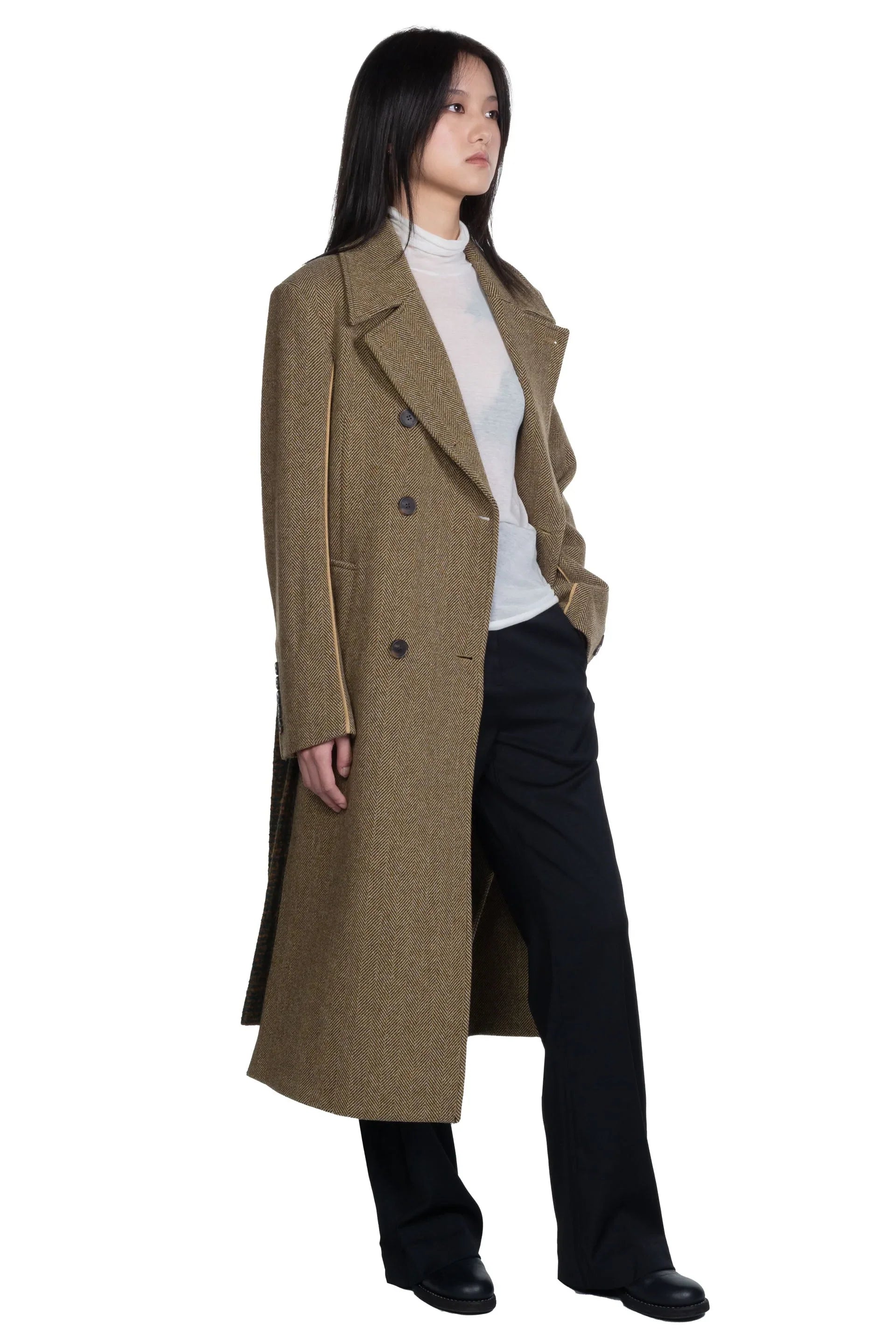 Andersson Bell Chloe Herringbone Back Pleats Coat. Pleated signature coat from Andersson Bell. Long sleeves. Two pockets at side. Button closure at front. Double breasted. Pleat details at back.