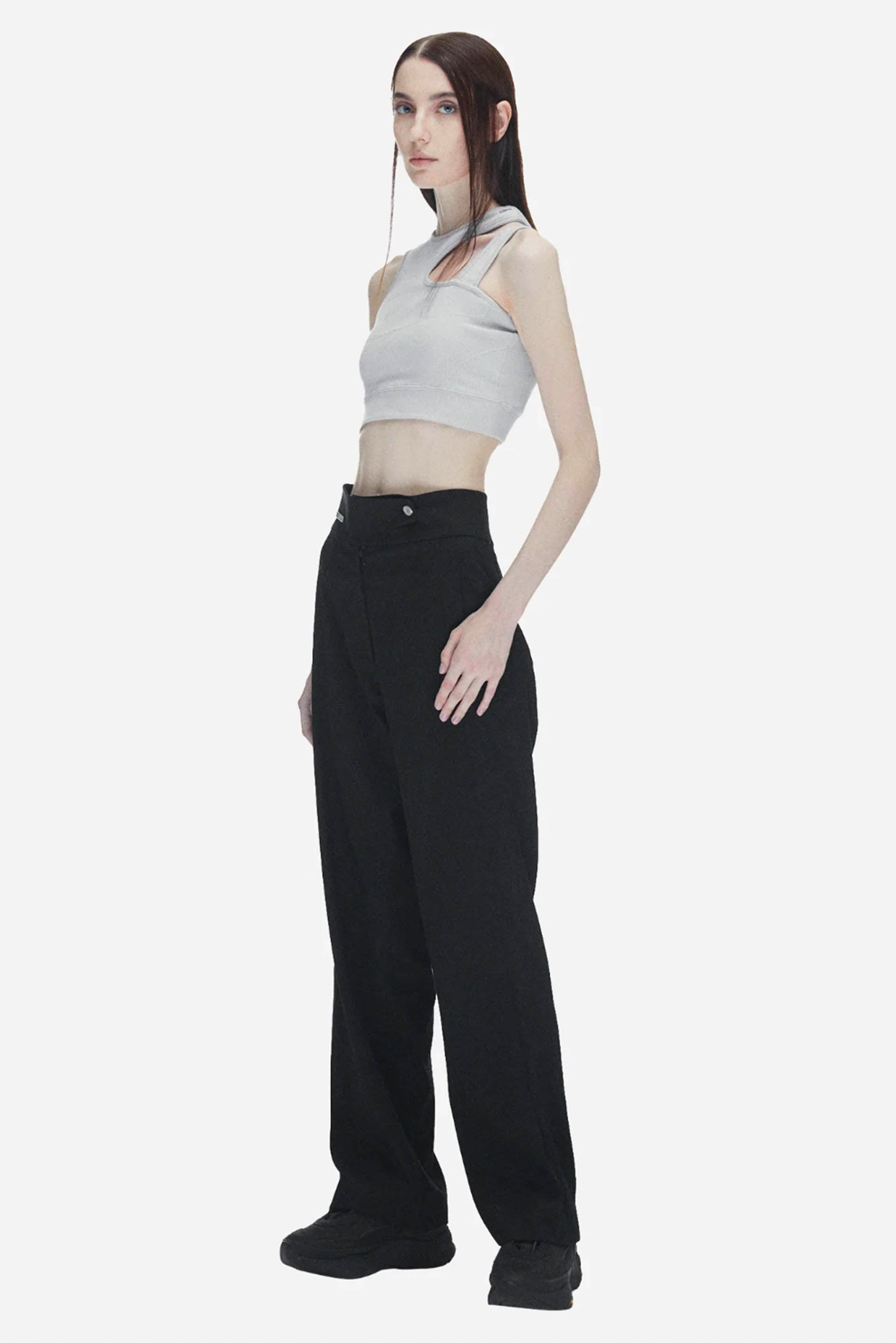 Wide-leg wool-blend tailored trousers in black. High-rise. Four-pocket styling. Logo engraved metal tag at waistband. Zip-fly. Unlined. Metal-tone hardware.