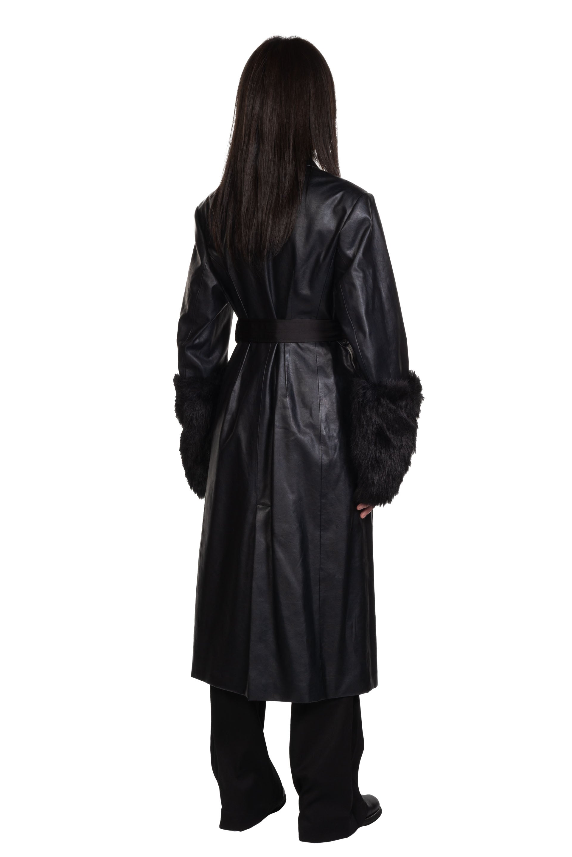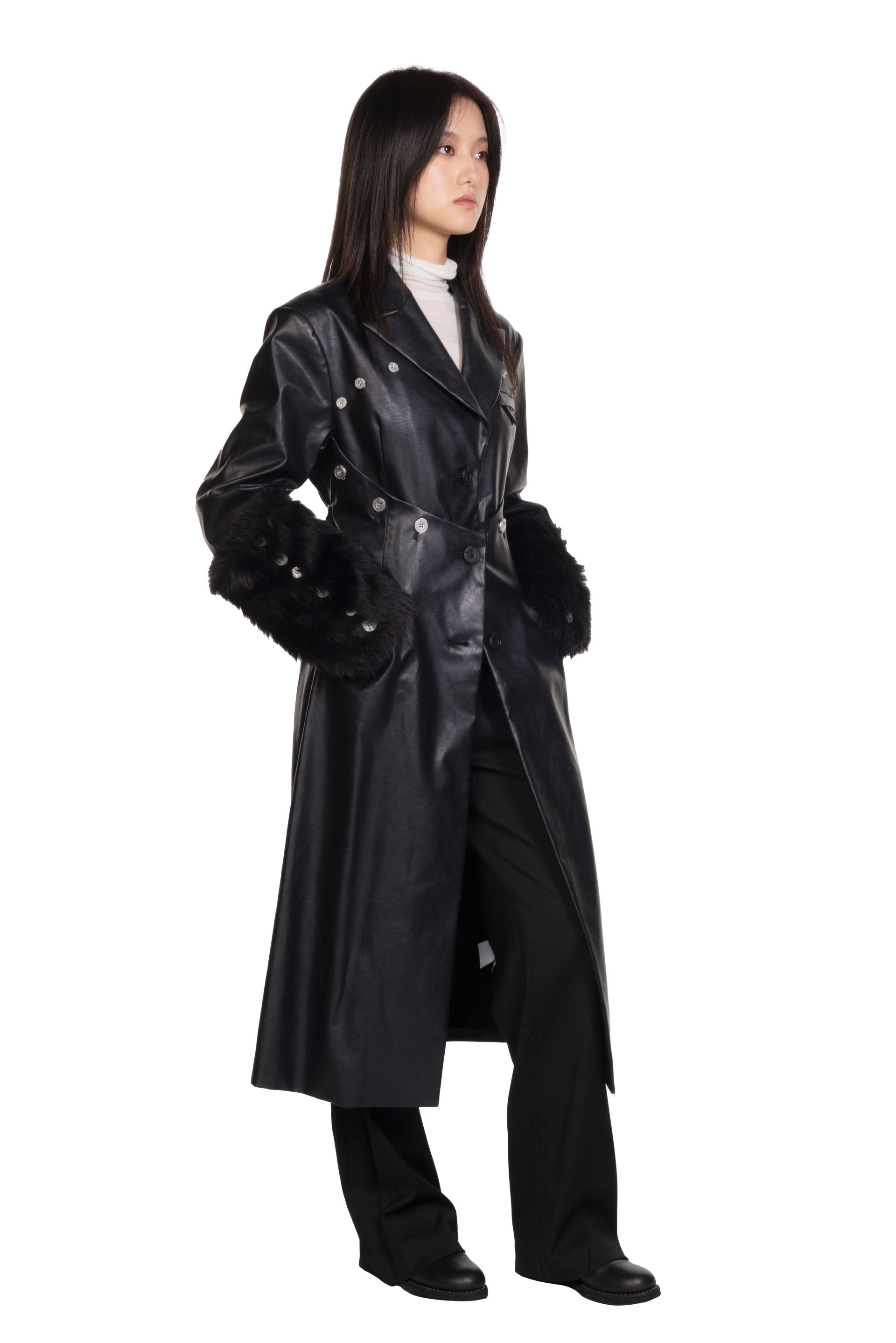 Circular Arc Buttoned Leather Coat from C2h4. Button details throughout. Detachable fur details on sleeves. Button closure. Detachable belt closure at waist. Two side pockets.