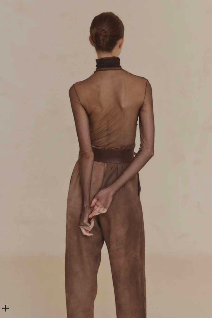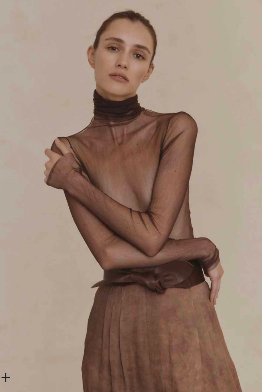 Cortana Sheer natural silk tulle top, with a high neck and long sleeves. Perfect to wear with sleeveless dresses or to let it peek under any garment. Part of Cortana's Silk Tulle collection which each season offers different colours.