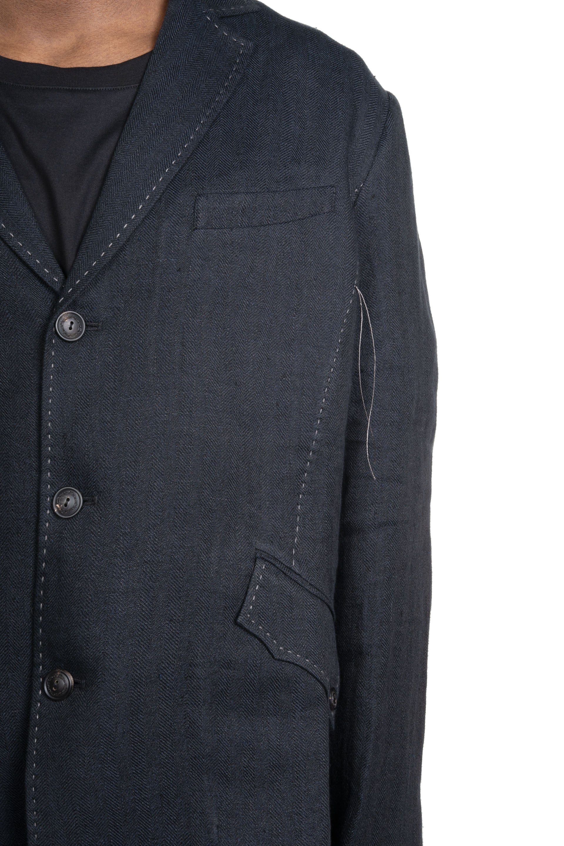 Professor. E understands the time of aesthetics from the use of cotton, hemp and wool. Fabric stitching, patching, designs without edge trimming, deconstruction, and reproduction are all Professor. E's signature elements creating classic immortal designs that can be viewed with the Civilian Jacket Black.