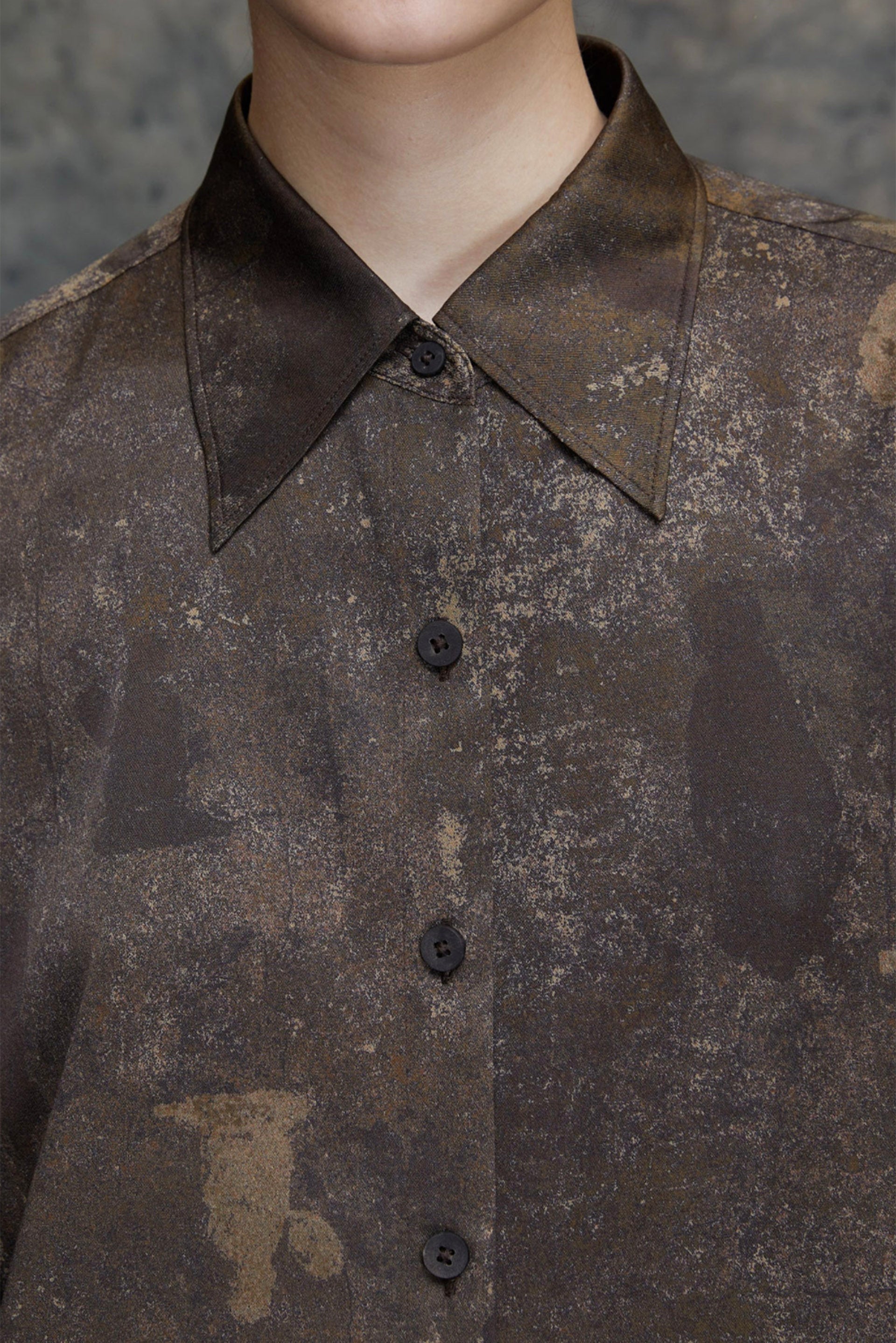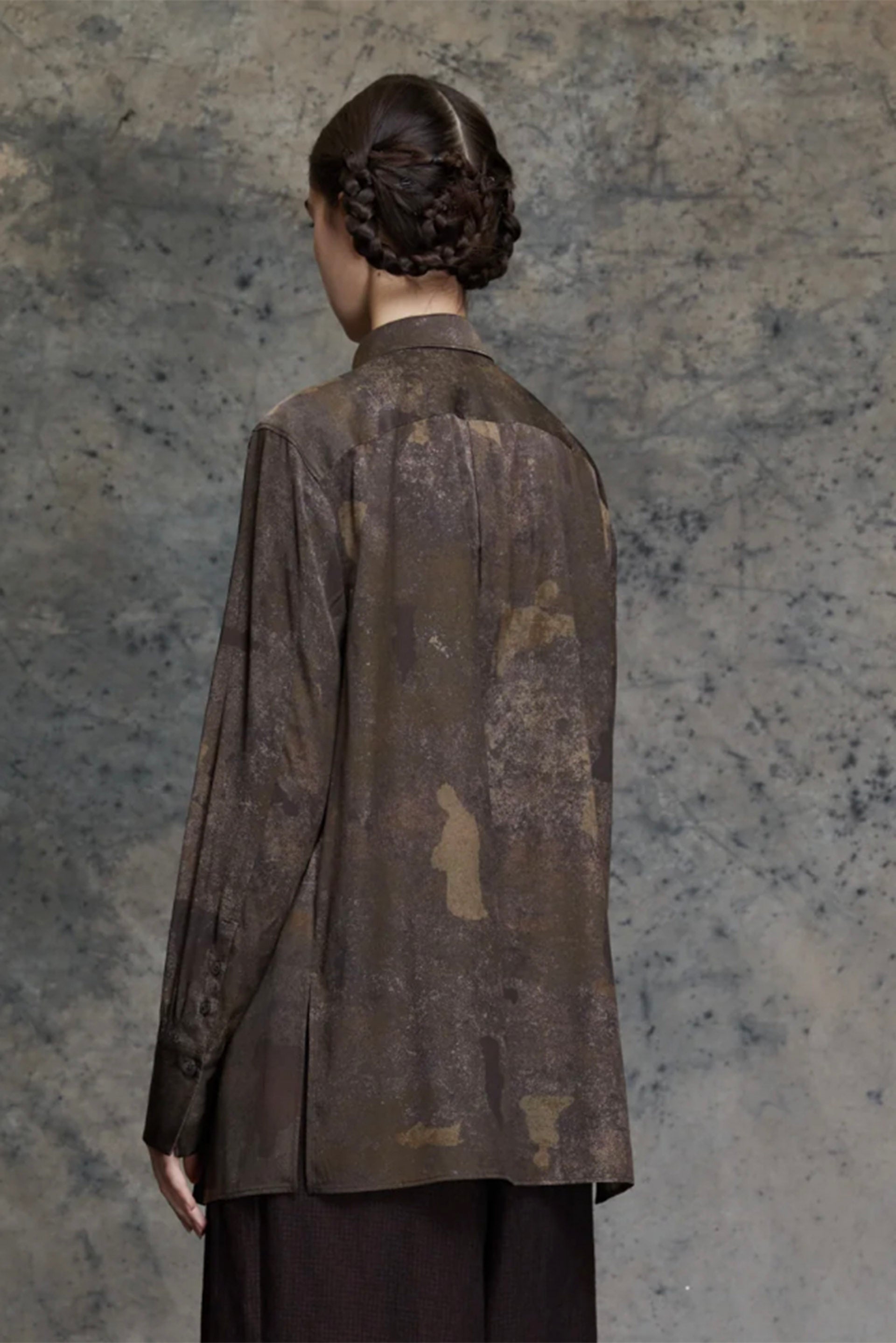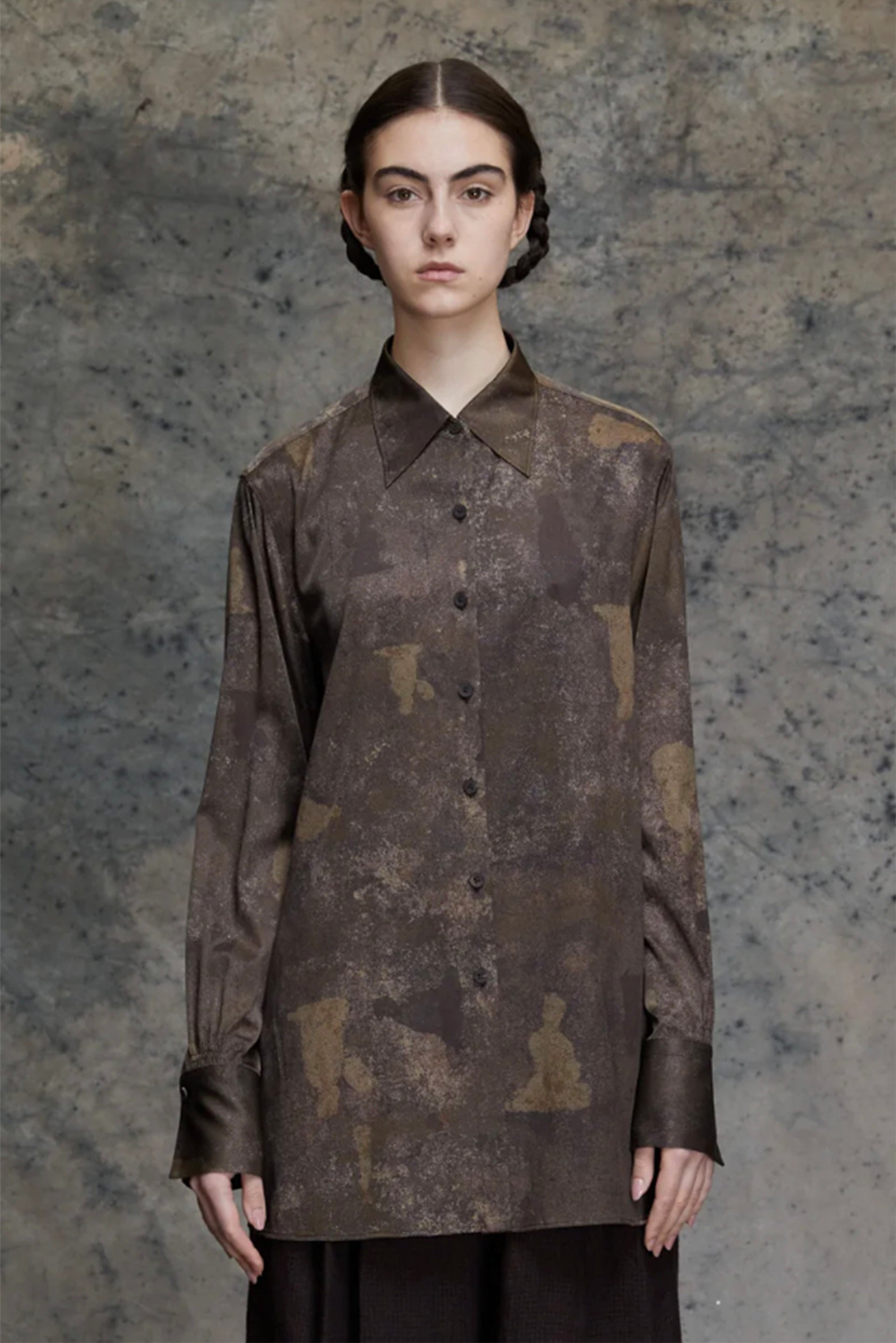 Classic Loose Fit Shirt. Long sleeves. Button closure at front. Button closure at cuffs. Side slit.