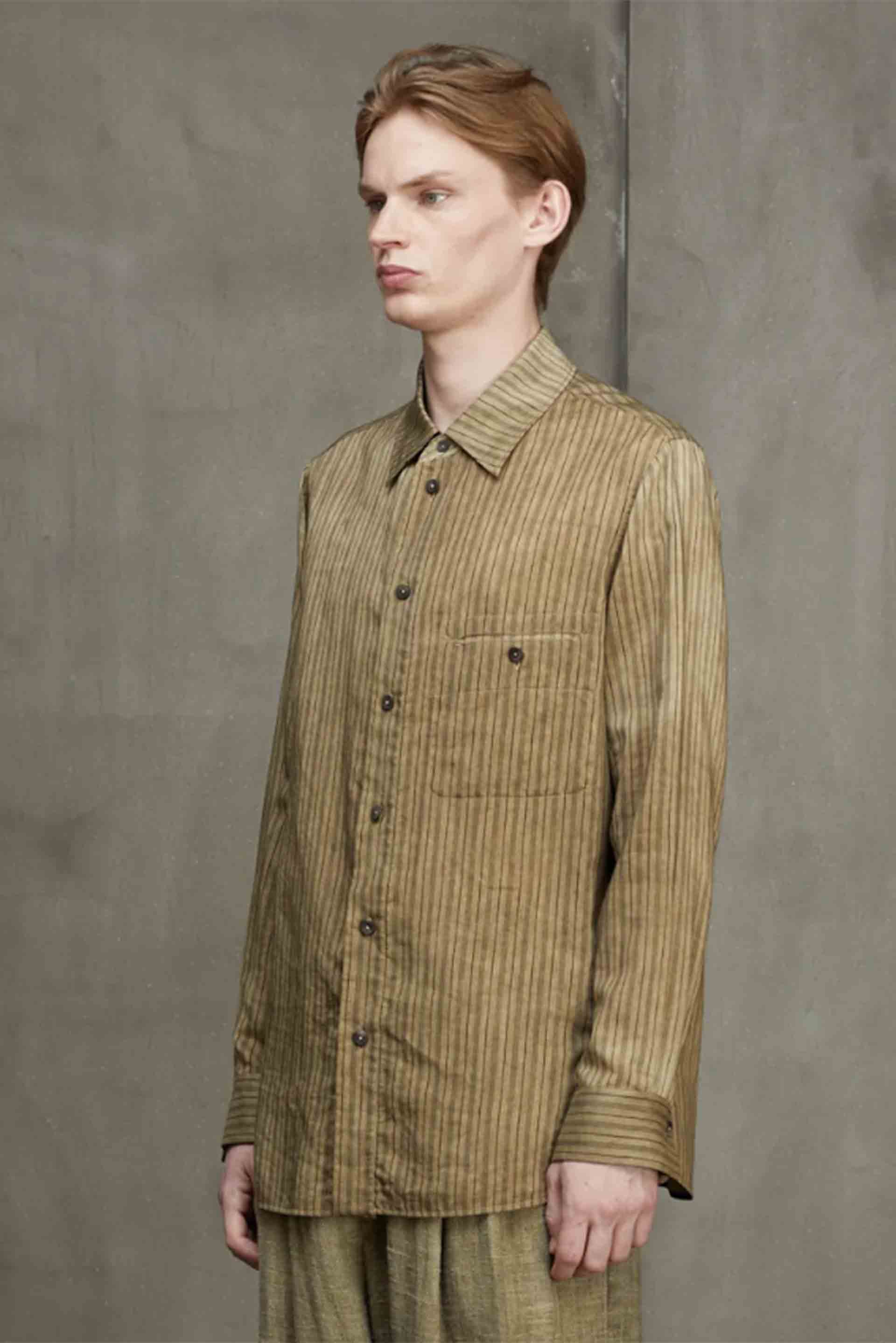 For Ziggy Chen Interlude III collection, Ziggy Chen continues his multifaceted research of fabrics and structures, creating garments that revolve around the concept of life and spontaneity. Old book covers and old pieces of fabric-from his private collection-were cut and reassembled to bring the motif to life. Referencing both century old Chinese and European silhouettes Ziggy Chen is a brand that is carving its own path within the industry as seen with the Classic Stripe Shirt Dirty White.