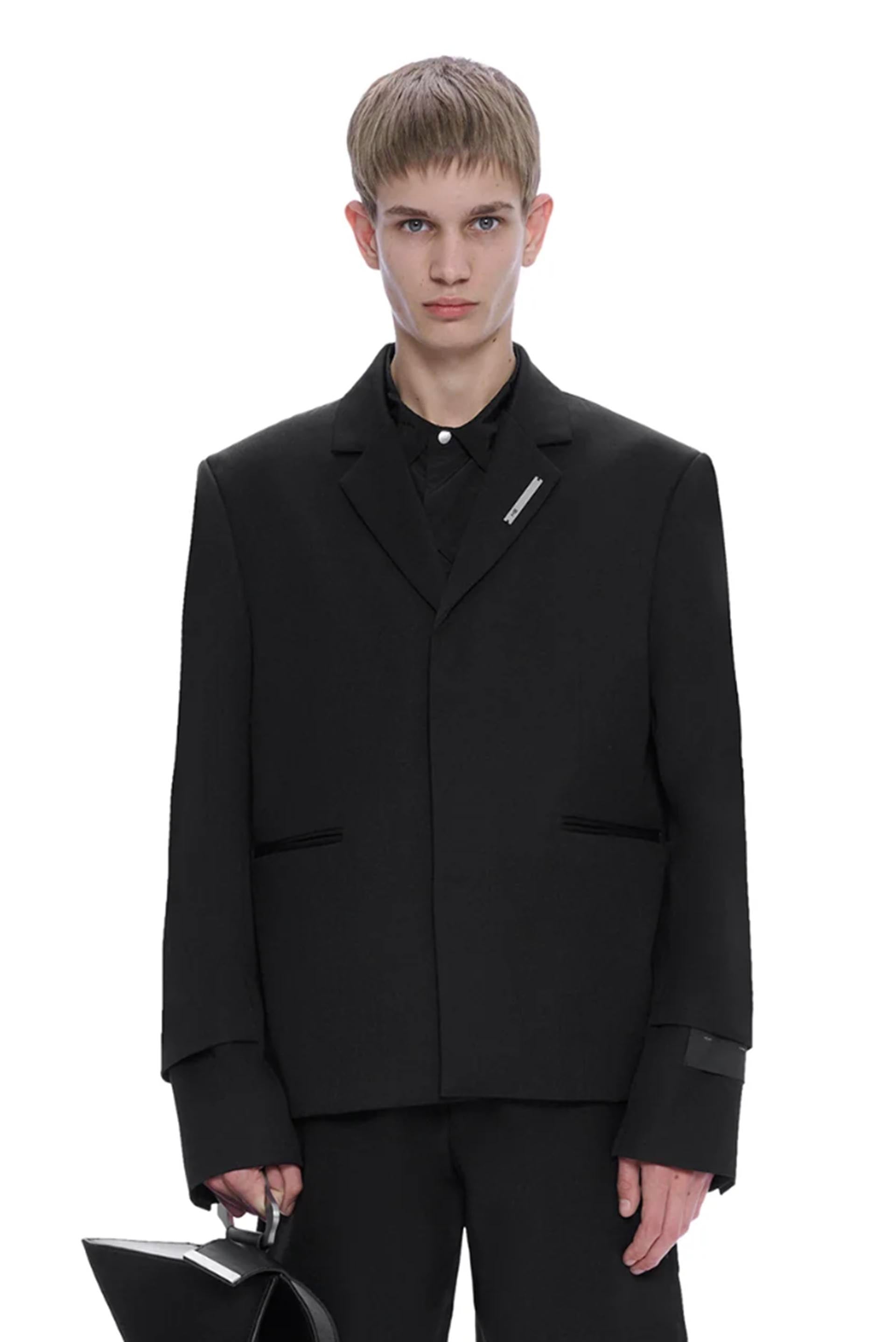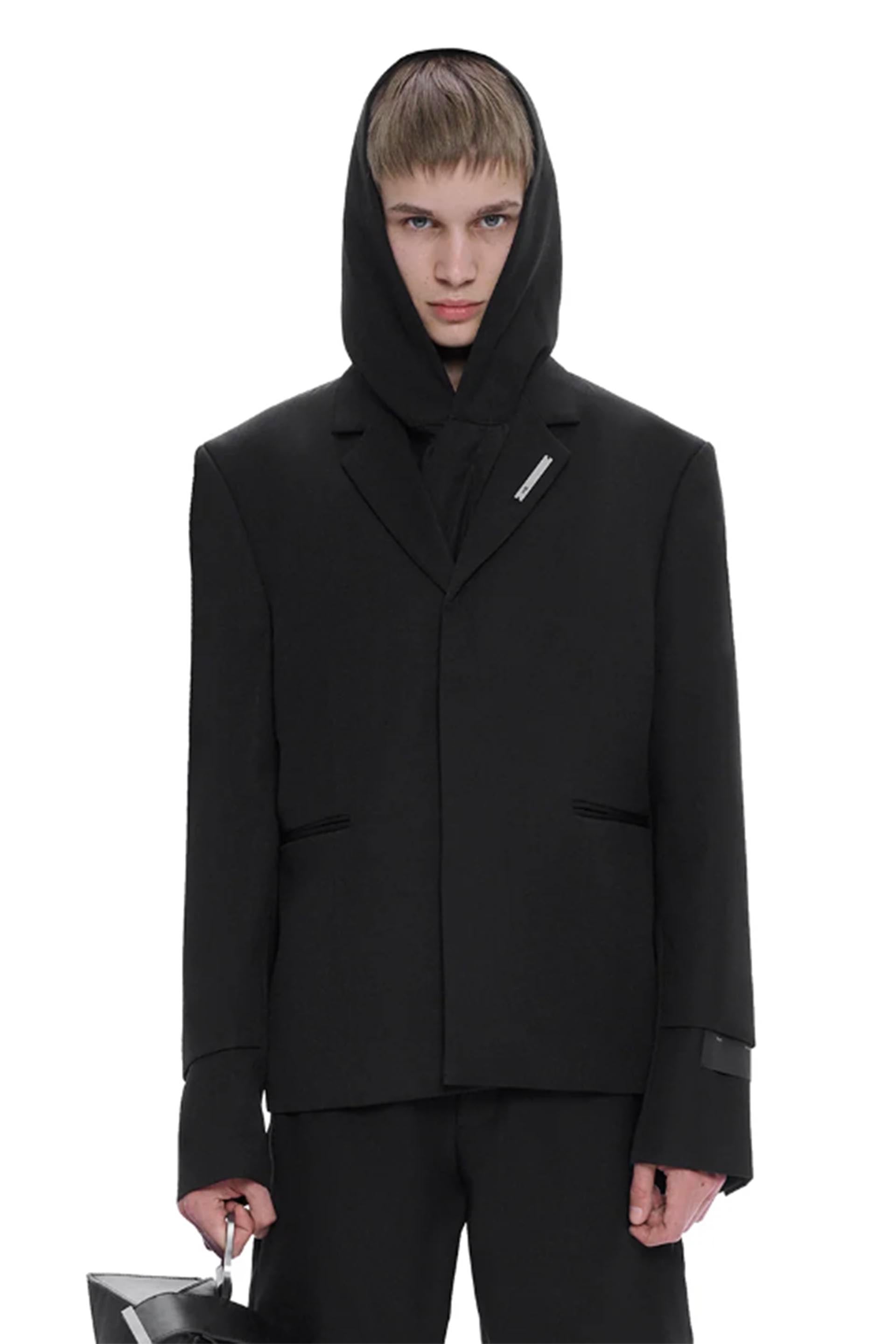Tailored blazer with detachable hood & vest. Features metal label detailing at collar. Virgin wool grain de poudre. High break line. Detachable vest in main fabric with asymmetric zip and hood. Branded jacquard lining. Two Button cuffs. Metal label at collar.