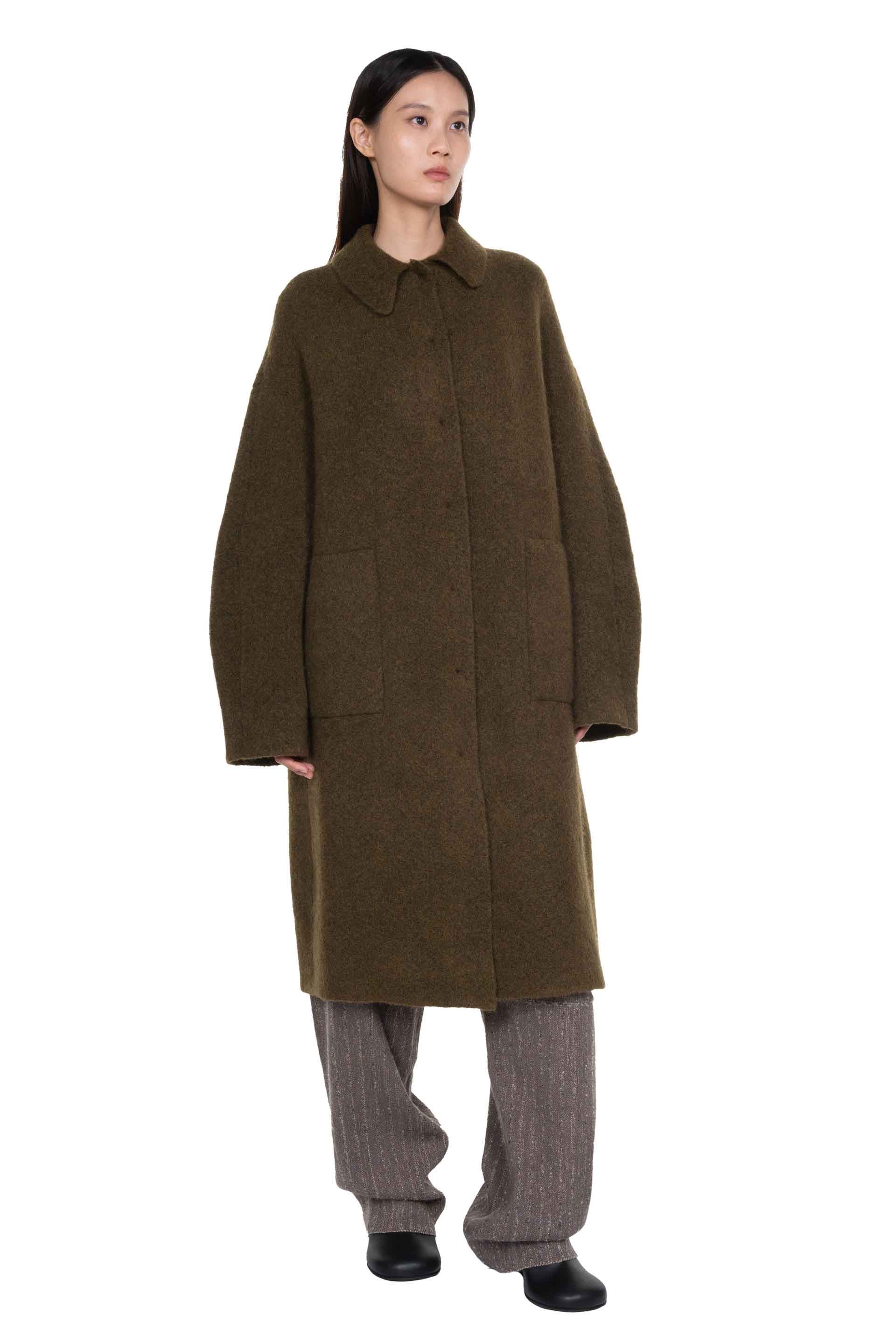 Moss Yak wool coat from Boboutic. Classic collar. Long sleeves. Button closure at front. Hidden button system. Two side pockets. Signature Yak mix. Soft textural fabric. Lightweight.