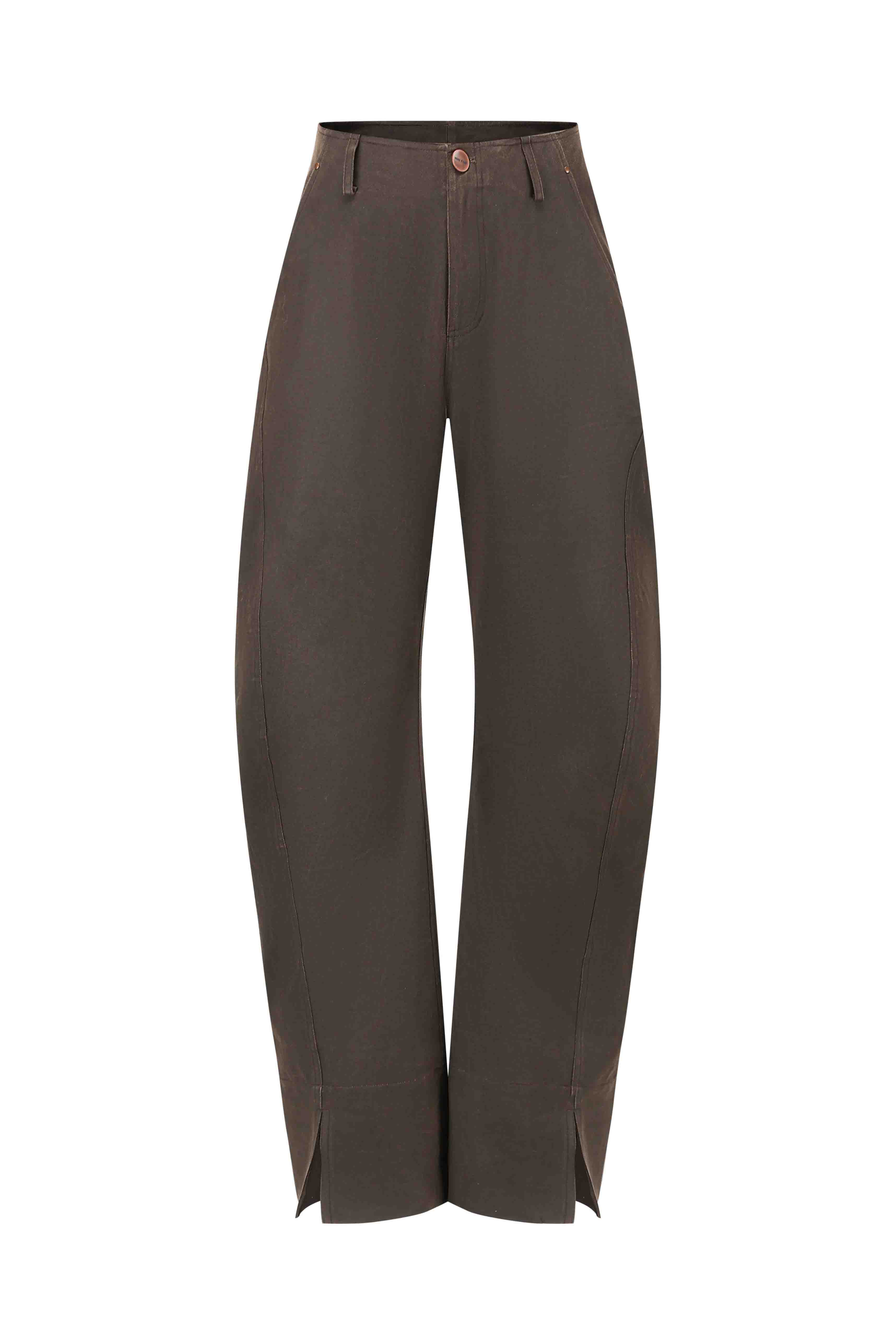 These pants are crafted from premium Japanese coated fabric and cut in an oversized silhouette. Through a resin coating and specialized dyeing process, the material develops organic textures and a vintage-inspired hue, making each piece subtly distinct. These natural variations lend every jacket its own one-of-a-kind beauty.These pants feature a distinctive curved design that adds playful volume while maintaining a relaxed, casual vibe. The central front seam and cuff slits elongate the legs while adding striking details.