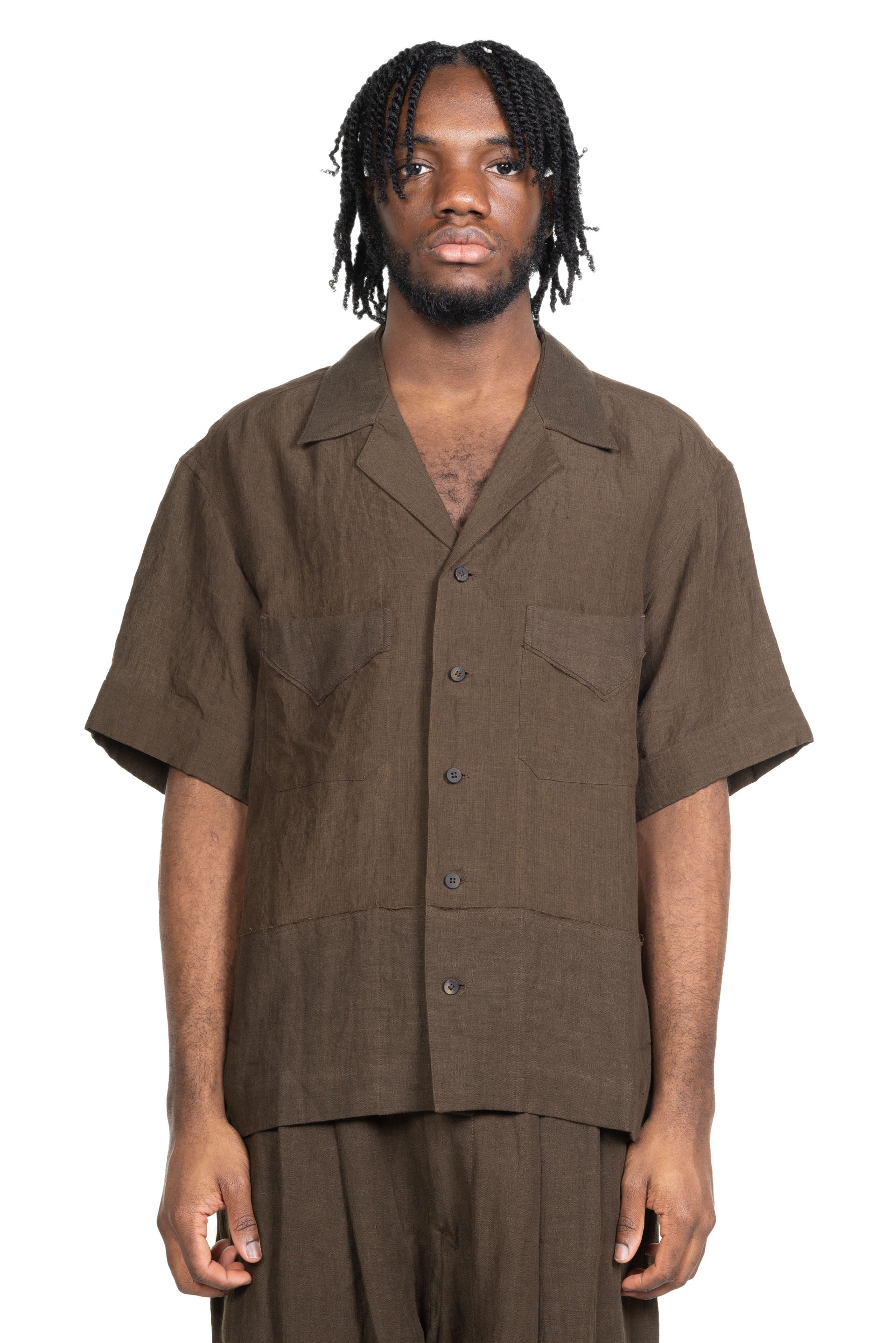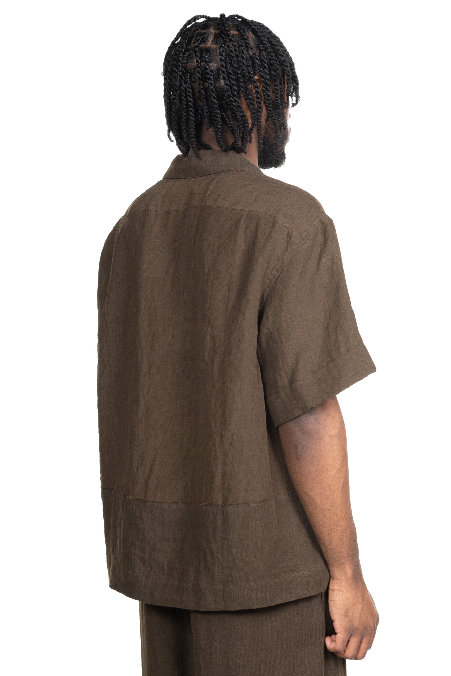 Ziggy Chen Short sleeve shirt. Button closure at front. Spread collar. Pocket at chest. Slit at side. Soft and textural linen fabric.