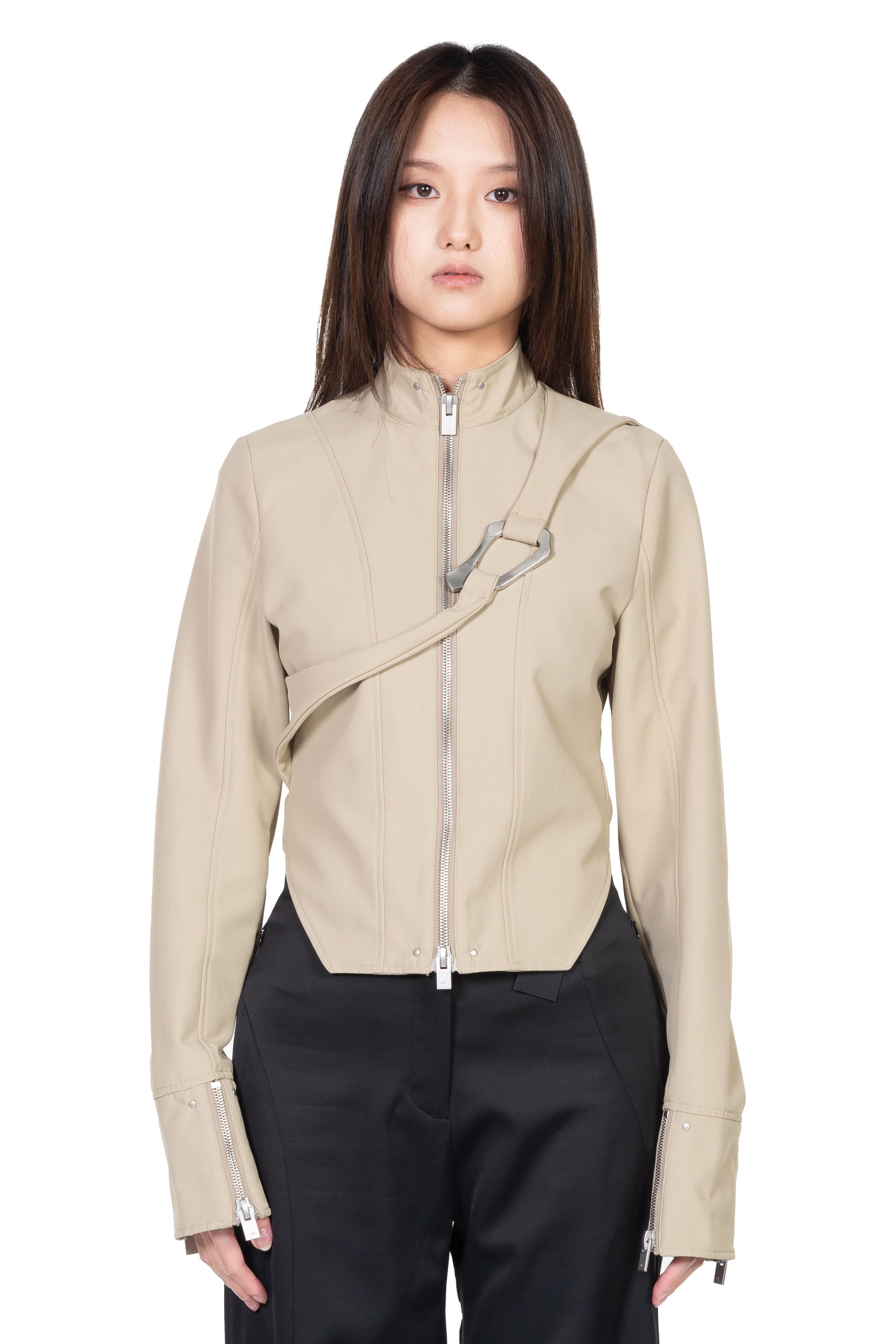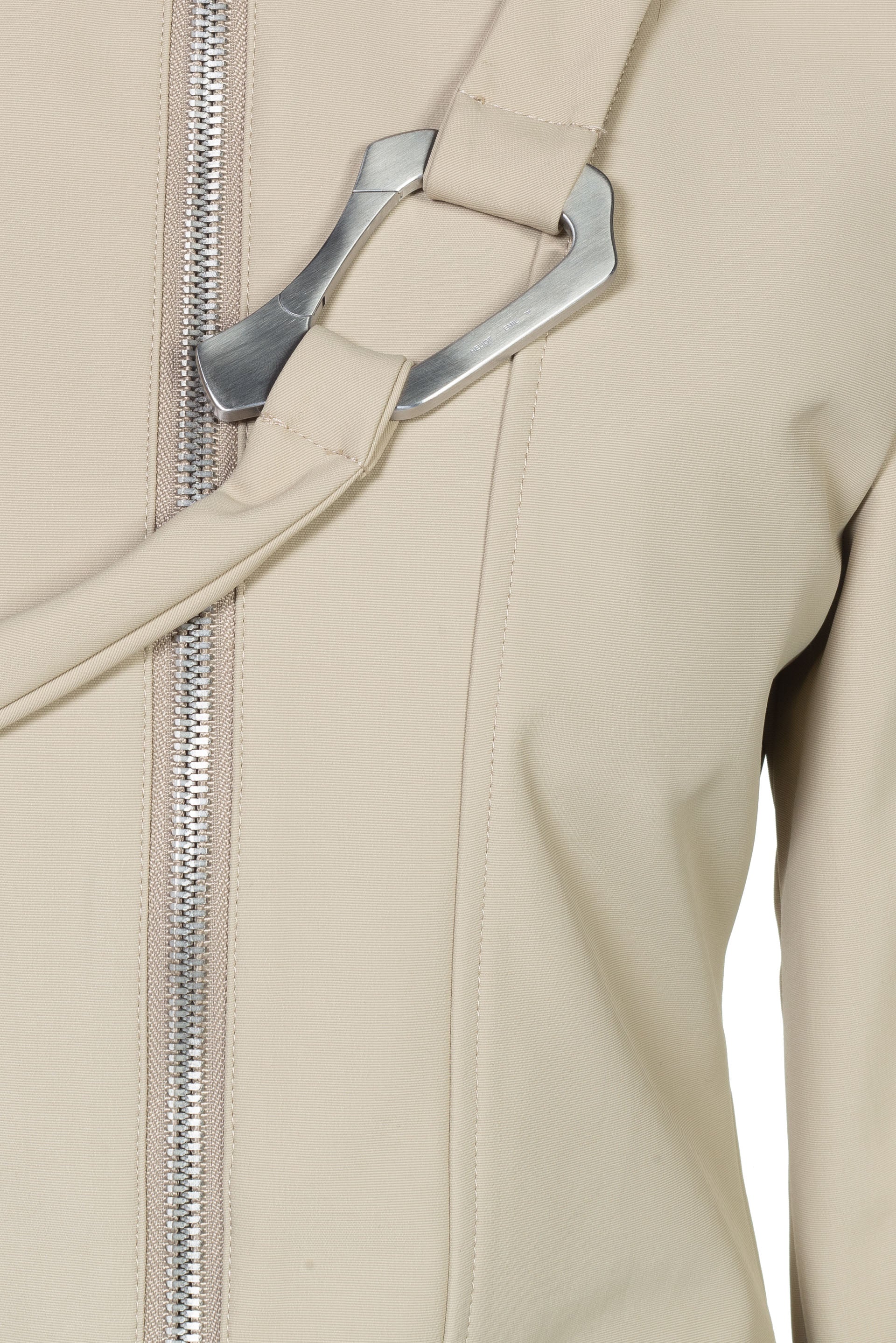 Long sleeves. Two side pockets. Double zip closure at front. Strap belt closureon outside jacket with new carabiner. Silver studs details. Slits at sides. Zips at cuffs.
