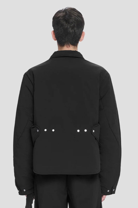 Puffed shirt with padded details and asymmetric morphed closure at front. Relaxed fit. Polyester plain weave. Padded on body, sleeves and collar. Morphed CF closure with press buttons. Invisible zip pockets. Integrated cuff adjusters.