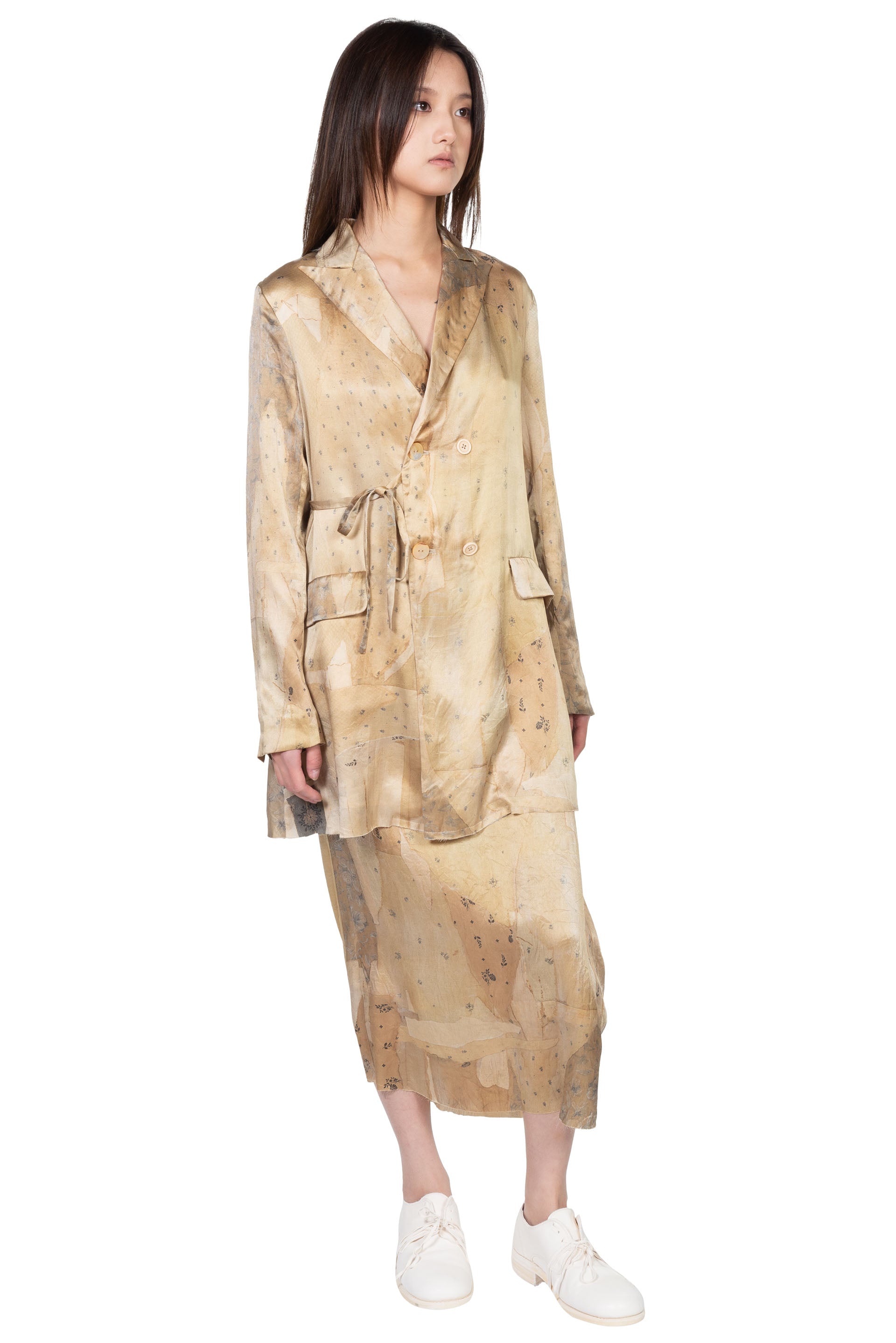 Mid length. Zip closure at side. Lined. Light fabric. Printed silk throughout.