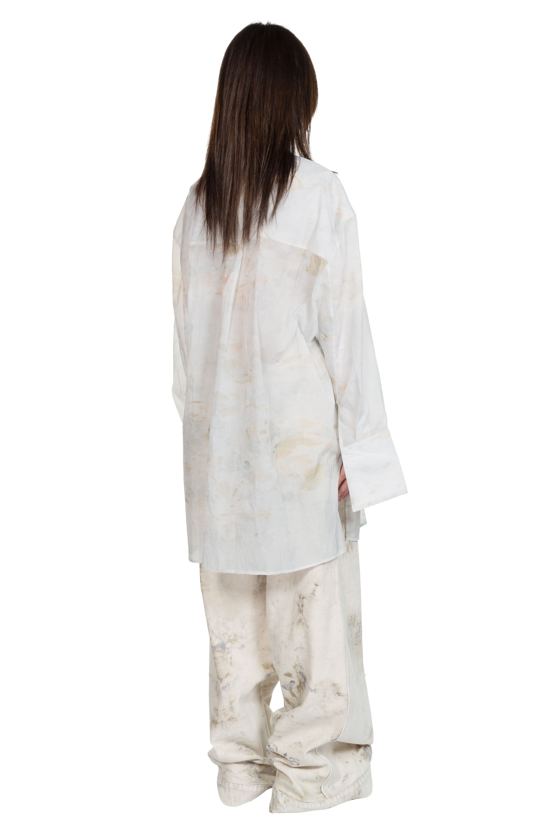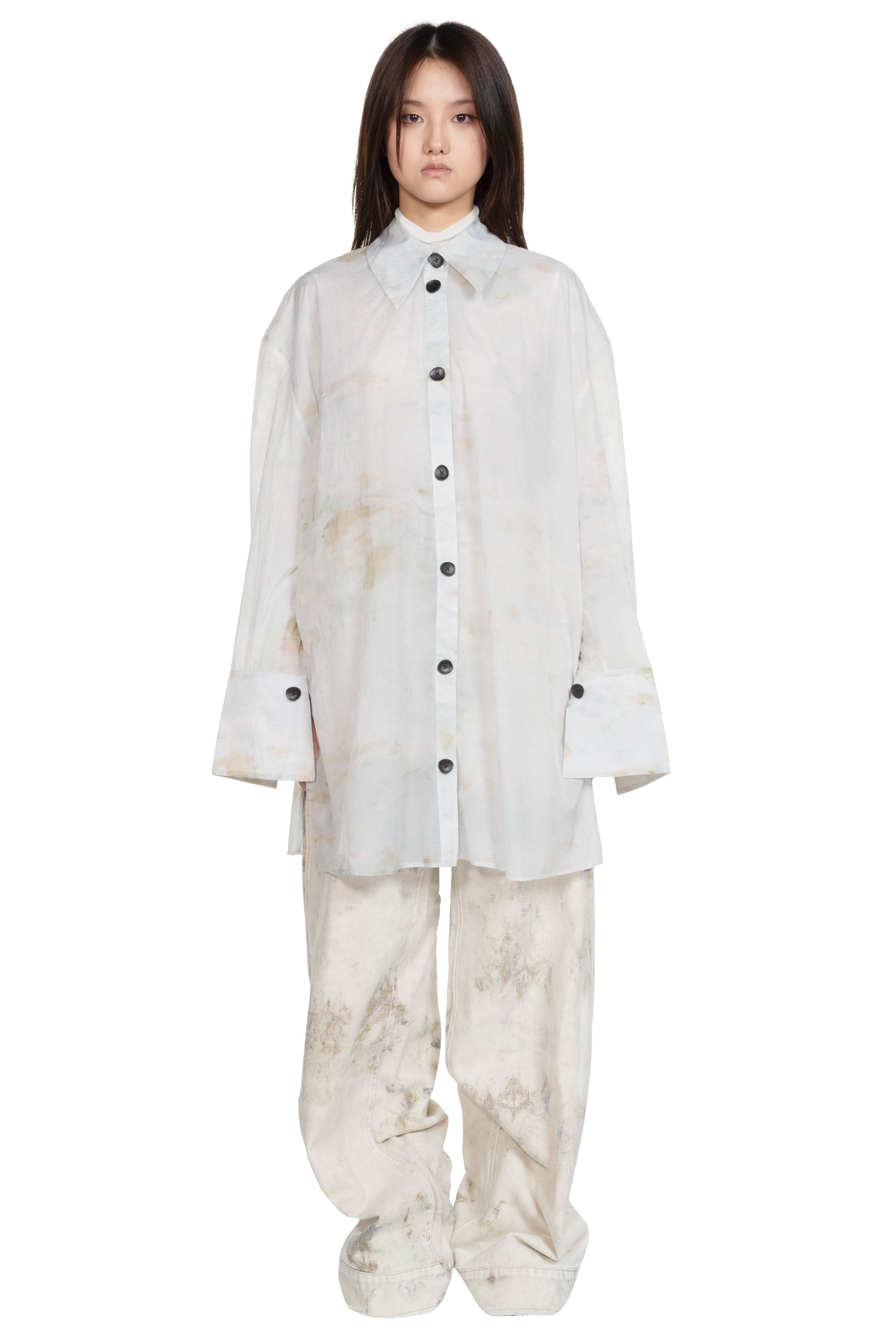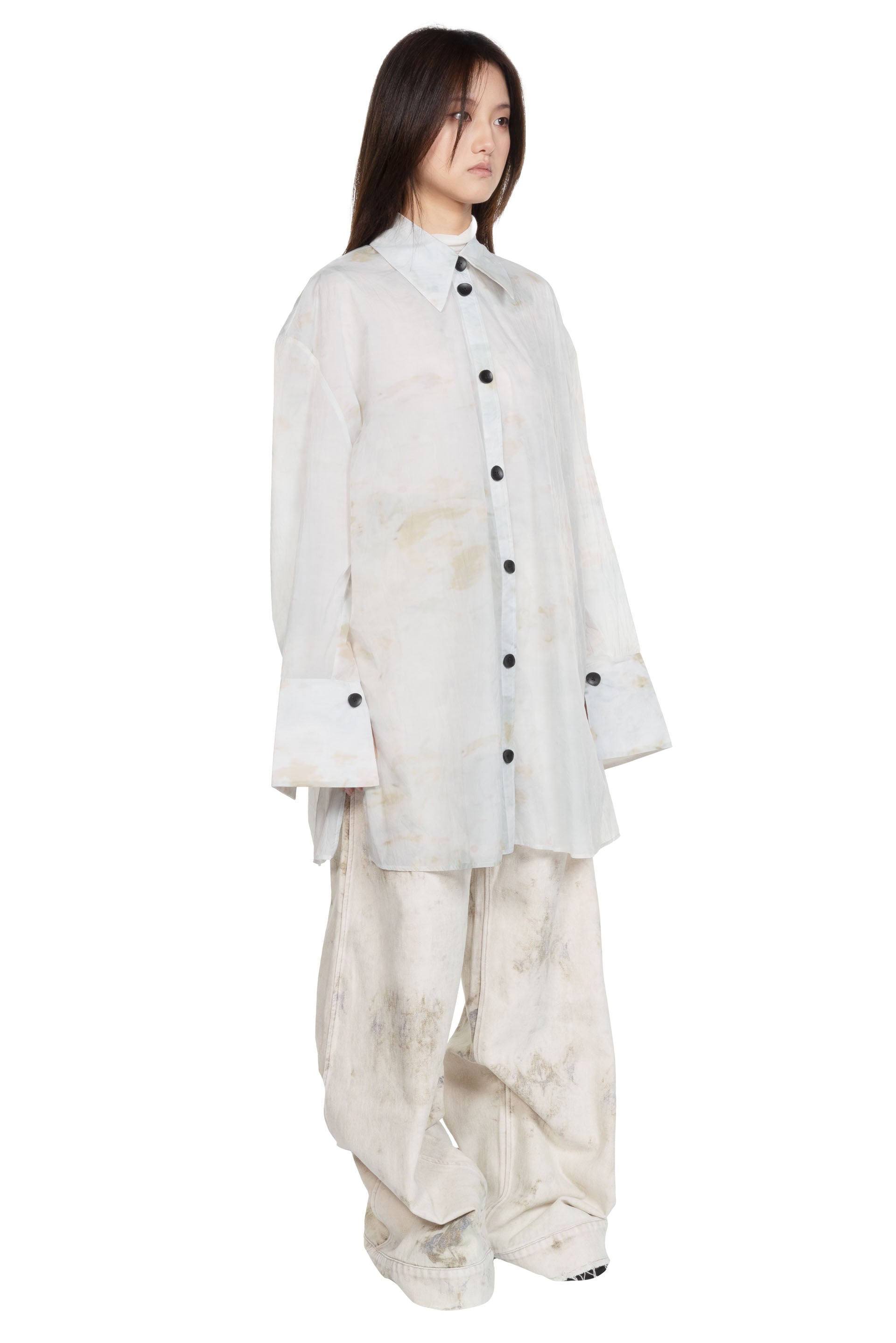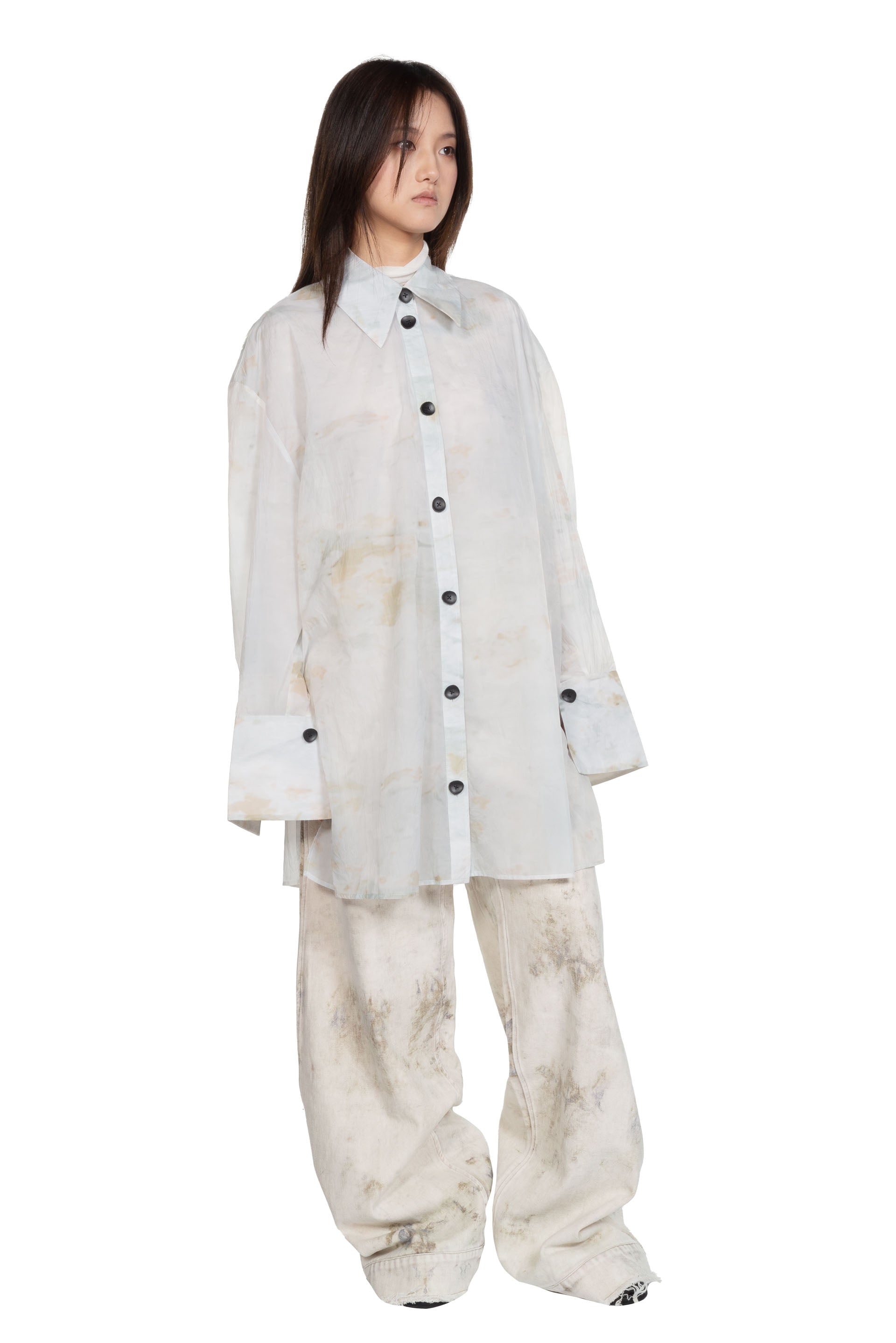 Peng Tai creates modern silhouette with traditional chinese philosophy. Inspired by how Chinese herbal medicine regulates the body from the inside out, Peng Tai aims to research and develop a way to boil Chinese herbal medicine with fabrics, to create clothes that feel like a second skin as seen with the Cotton Chemise Oversize Frost.