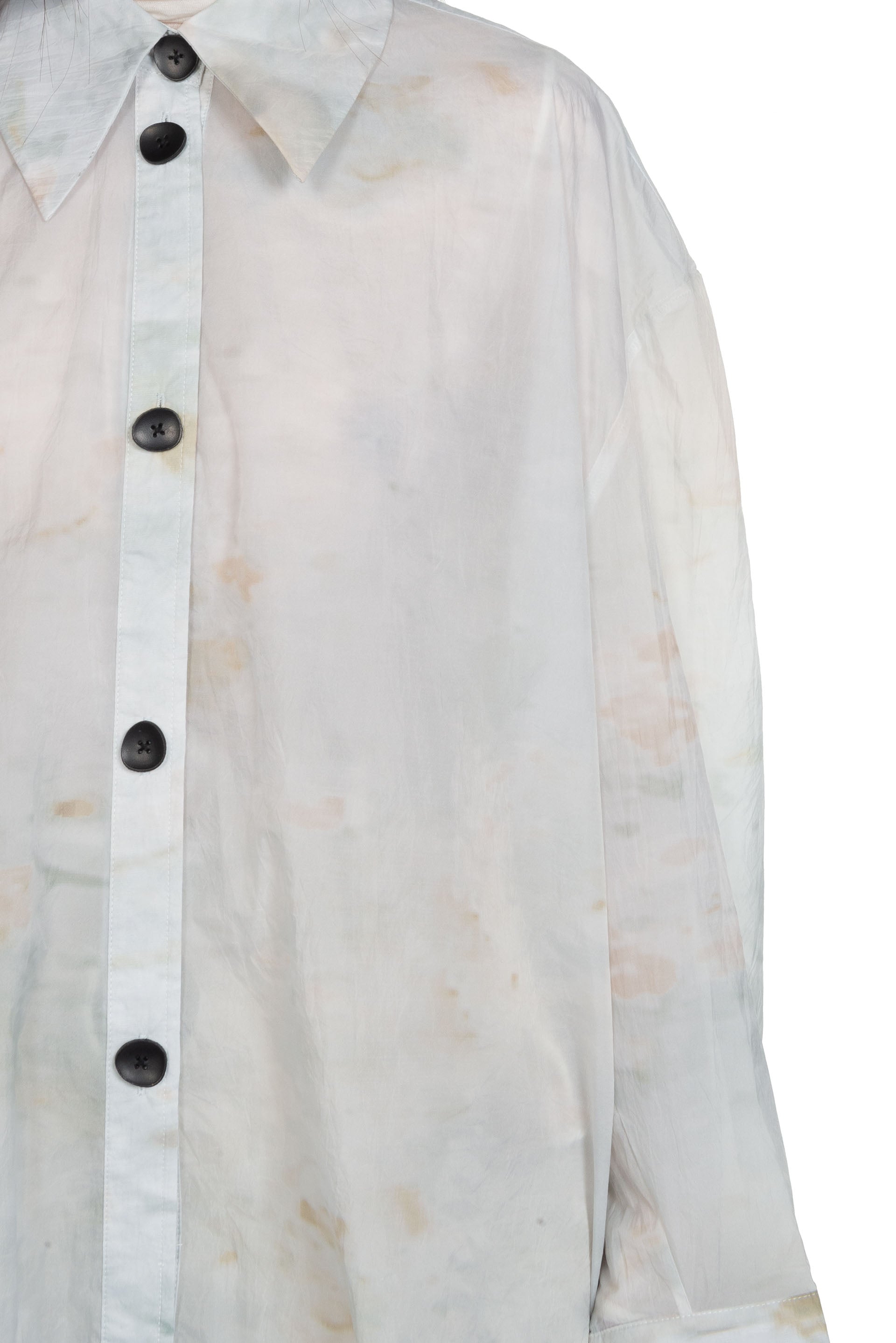 Button closure at front. Leather buttons at front and cuffs. Oversized fit. Very light fabric.
