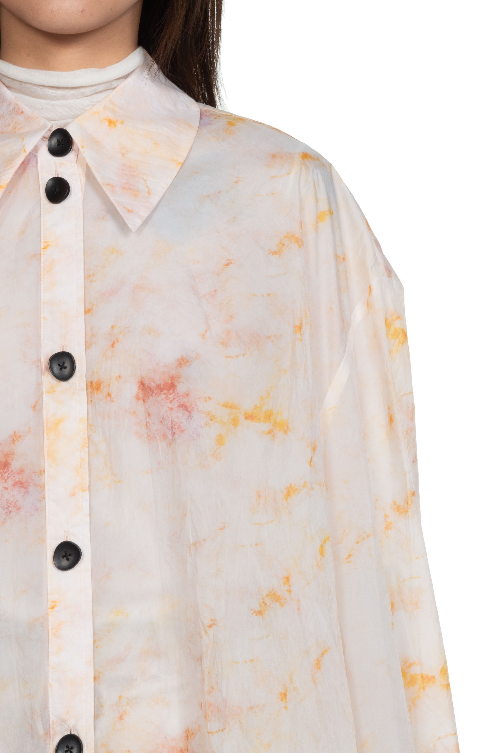 Button closure at front. Leather buttons at front and cuffs. Oversized fit. Very light fabric.