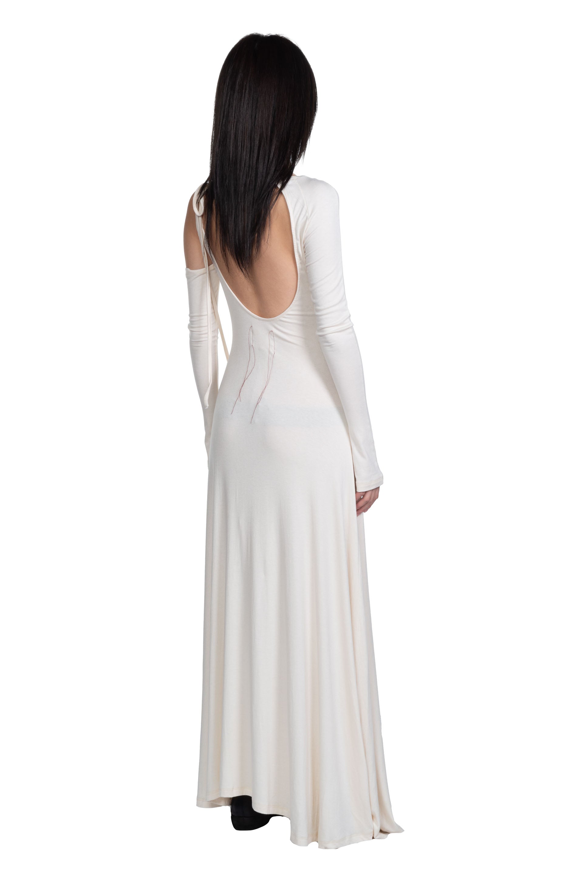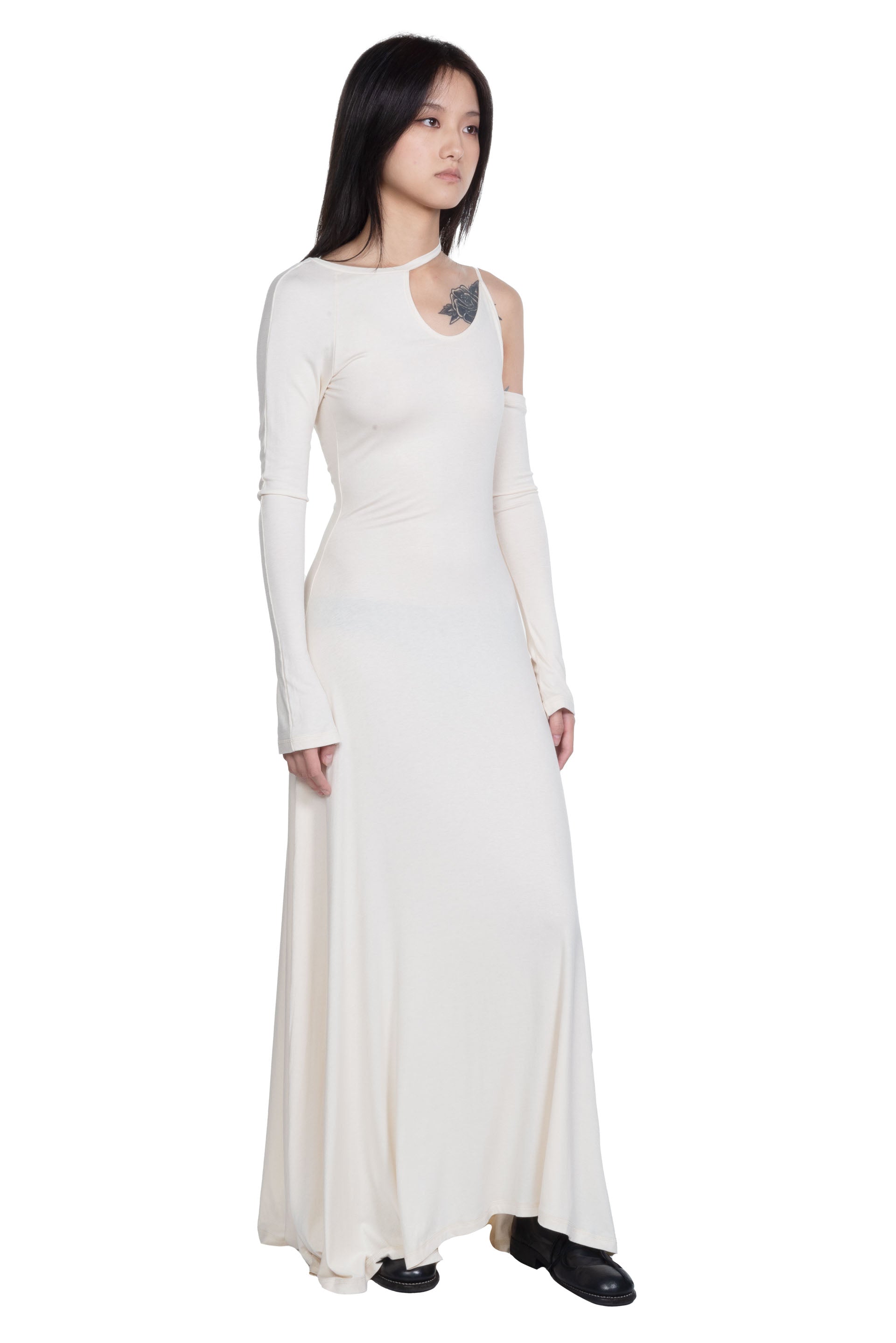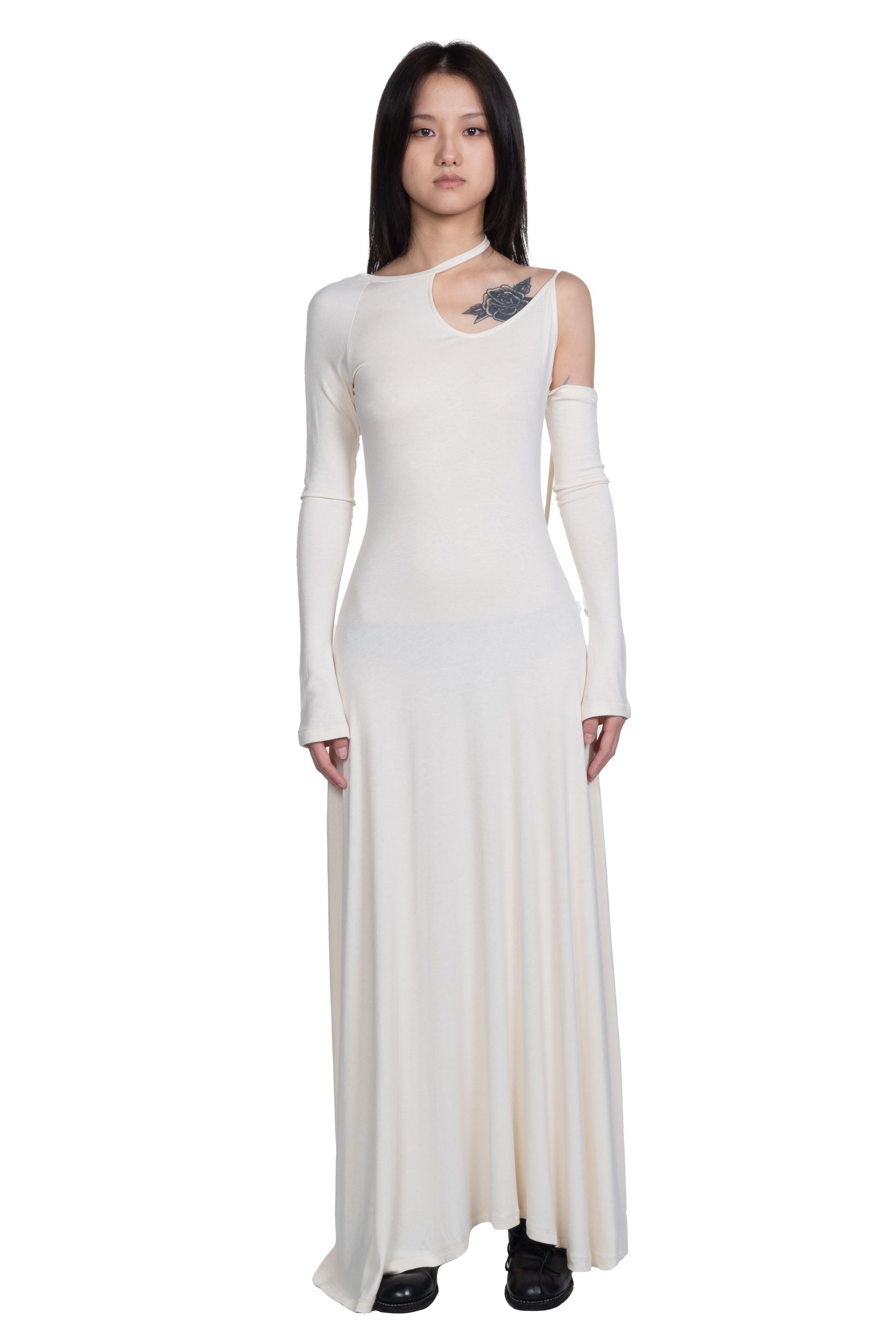 Peng Tai creates modern silhouette with traditional chinese philosophy. Inspired by how Chinese herbal medicine regulates the body from the inside out, Peng Tai aims to research and develop a way to boil Chinese herbal medicine with fabrics, to create clothes that feel like a second skin as seen with the Cotton Jersey C-Loop Dress from Peng Tai.